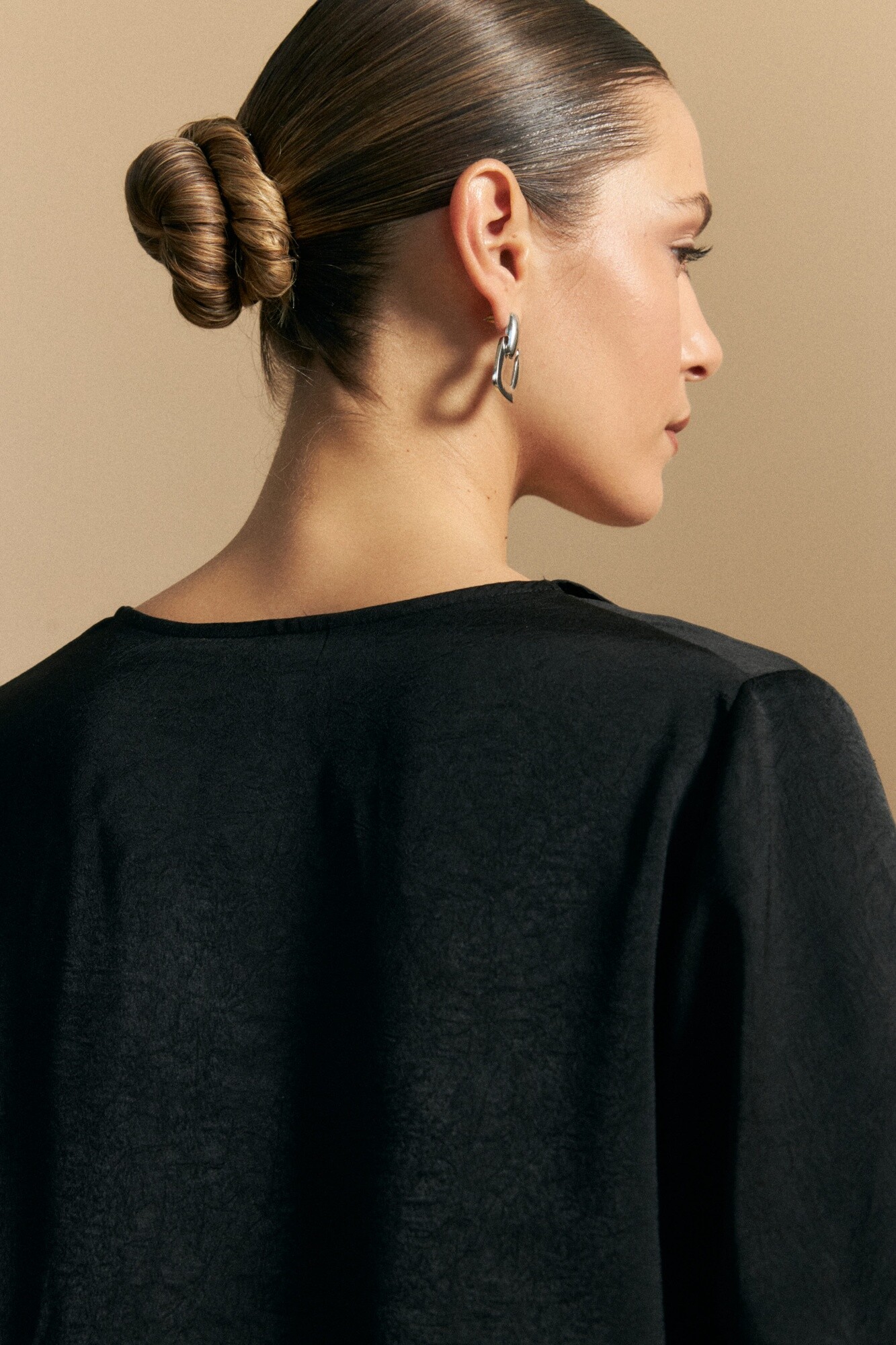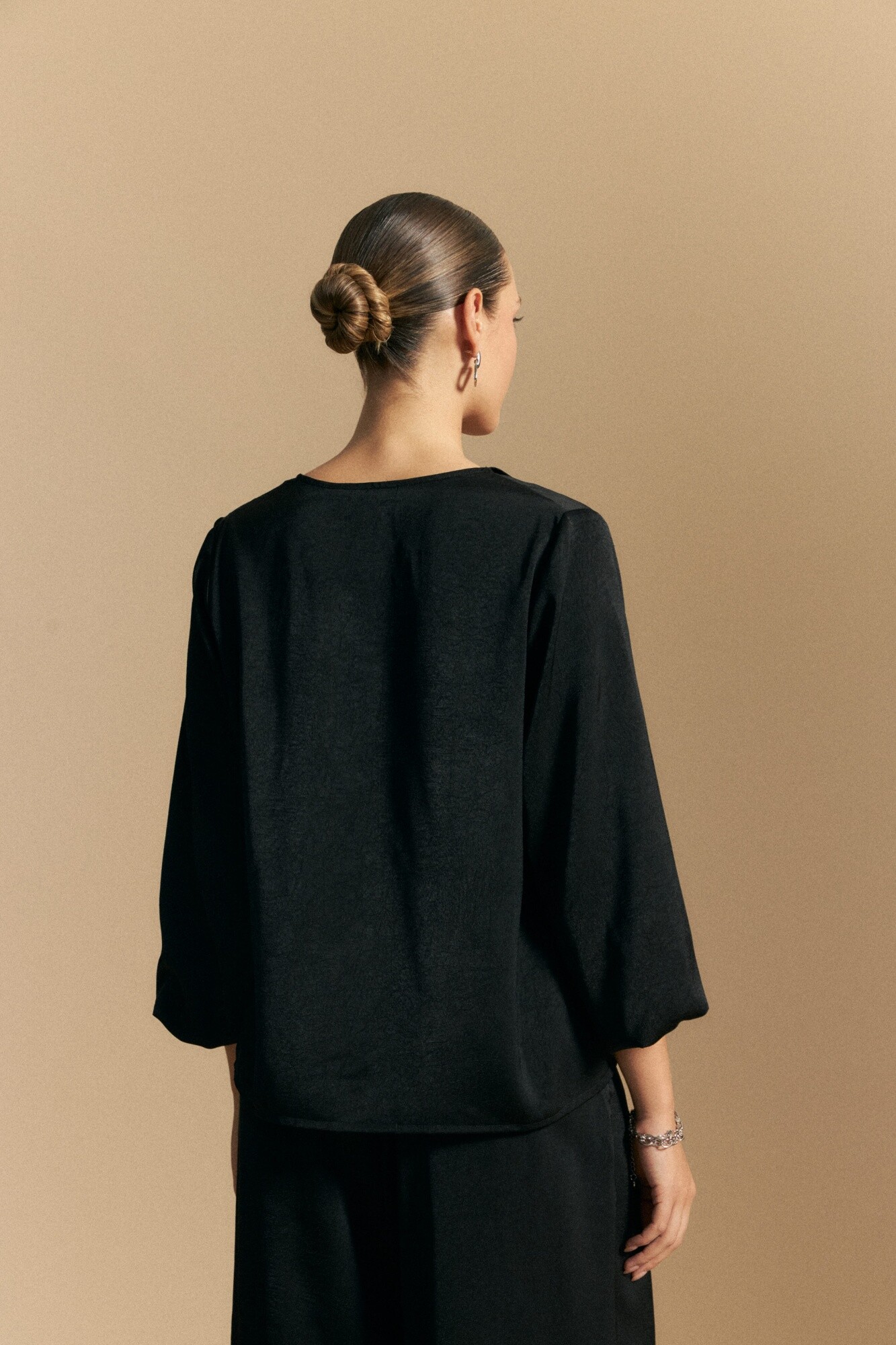 Blusa de escote en V con volados en el frente, un detalle que aporta movimiento y realza el diseño con un aire femenino y elegante. Su silueta de caída fluida acompaña naturalmente el cuerpo, mientras que las mangas largas terminadas en puños con botón suman un acabado prolijo y sofisticado. Una prenda versátil que se adapta tanto a looks de día como a estilismos más nocturnos, combinando con facilidad con pantalones sastreros, faldas o denim.