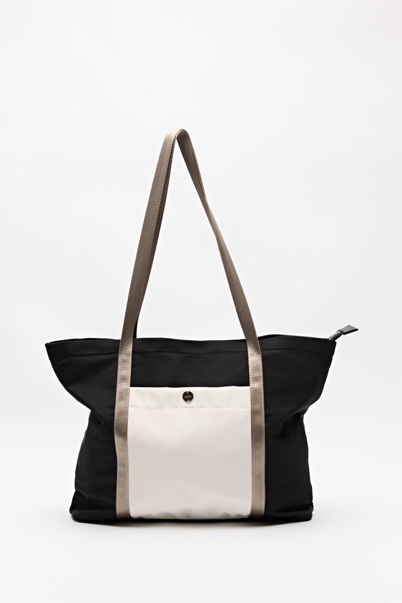 Cartera de nylon de gran capacidad, confeccionada en tejido resistente y liviano, ideal para el día a día o para viajes. Su diseño combina asas largas en cinta negra y un bolsillo frontal contrastante, con detalle de tiras decorativas que aportan un guiño sporty chic. Funcional y versátil, es el accesorio perfecto para acompañar looks urbanos con un toque práctico y moderno.