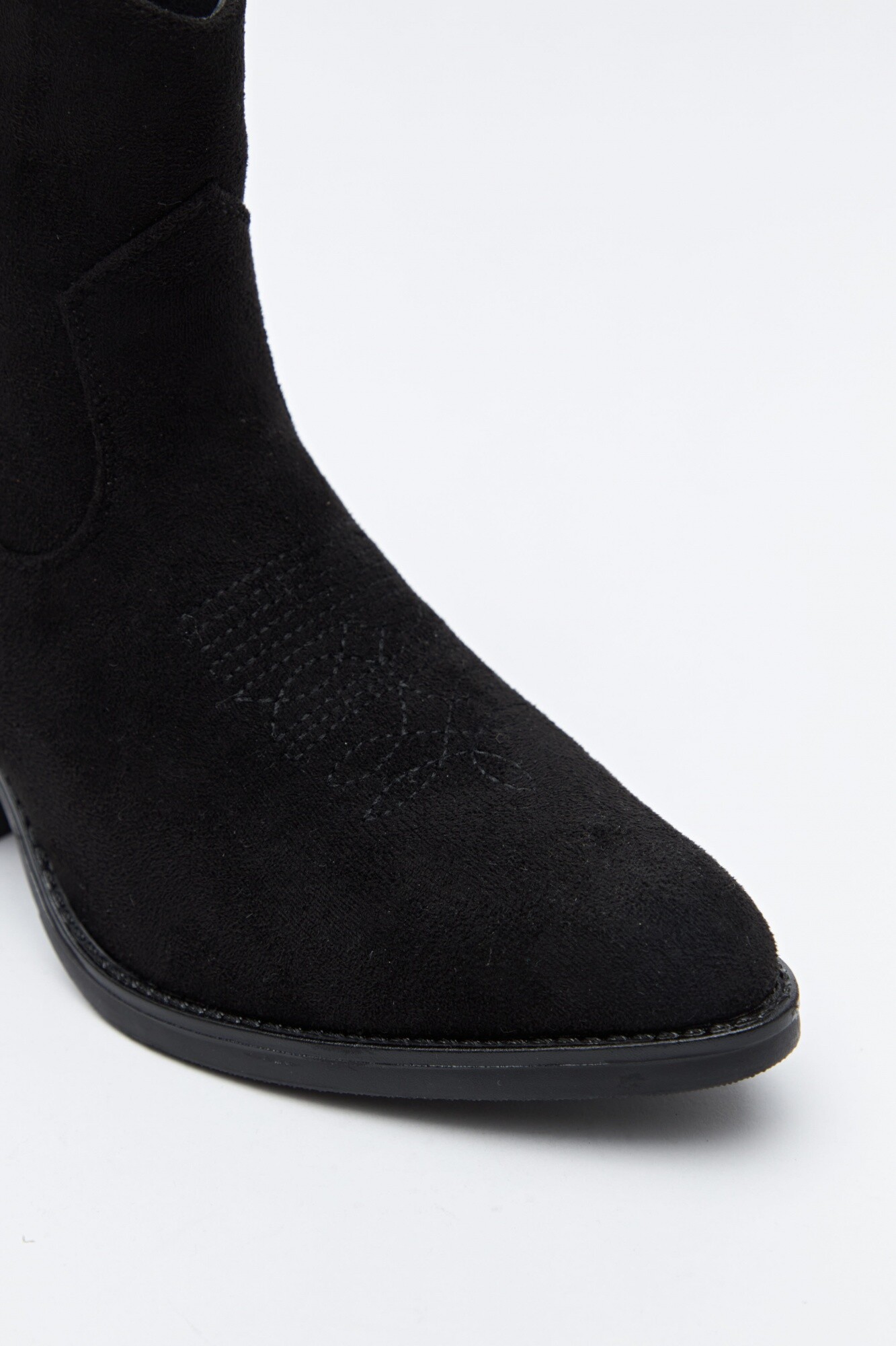 Botas de caña baja estilo western en gamuza, un diseño que combina carácter y actitud. Su silueta inspirada en el universo cowboy se destaca por el taco medio y la puntera estilizada, mientras que el detalle de estrella aplicada en el lateral aporta un acento distintivo. El tirador trasero facilita el calce y completa una prenda ideal para sumar personalidad a looks urbanos o más relajados.