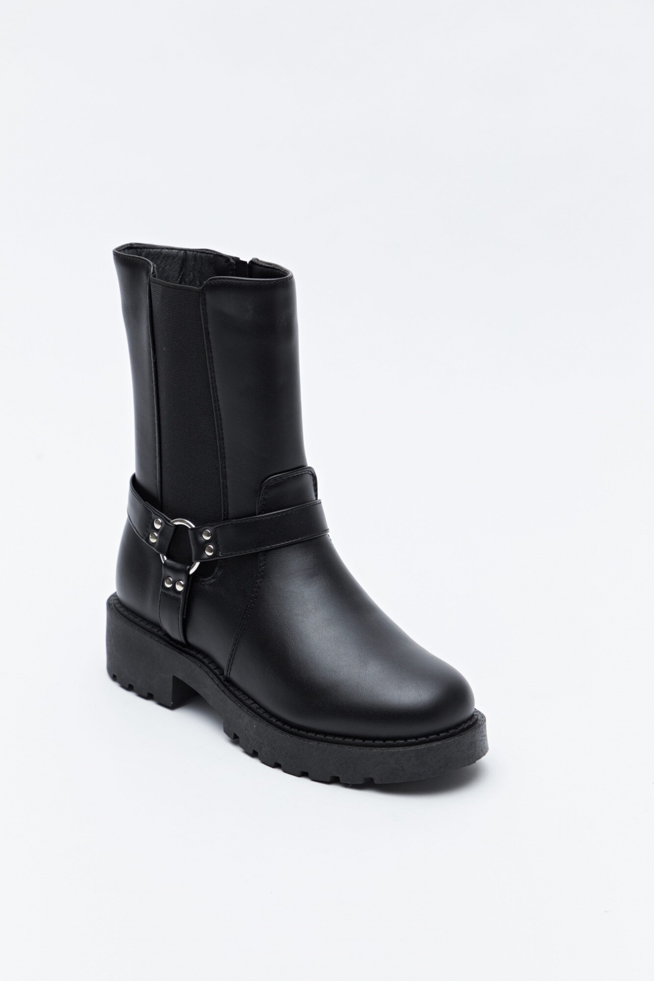 Botas tipo biker en símil cuero, de silueta robusta y espíritu urbano, inspiradas en el clásico calzado motero que se convirtió en un ícono de estilo desde mediados del siglo XX. Su diseño combina una caña media con panel elastizado lateral que facilita el calce y aporta comodidad, mientras que el arnés decorativo con herraje metálico suma carácter y un guiño rockero. La suela gruesa dentada refuerza su estética fuerte y moderna, convirtiéndolas en un calzado versátil que acompaña desde looks casuales hasta combinaciones más audaces.