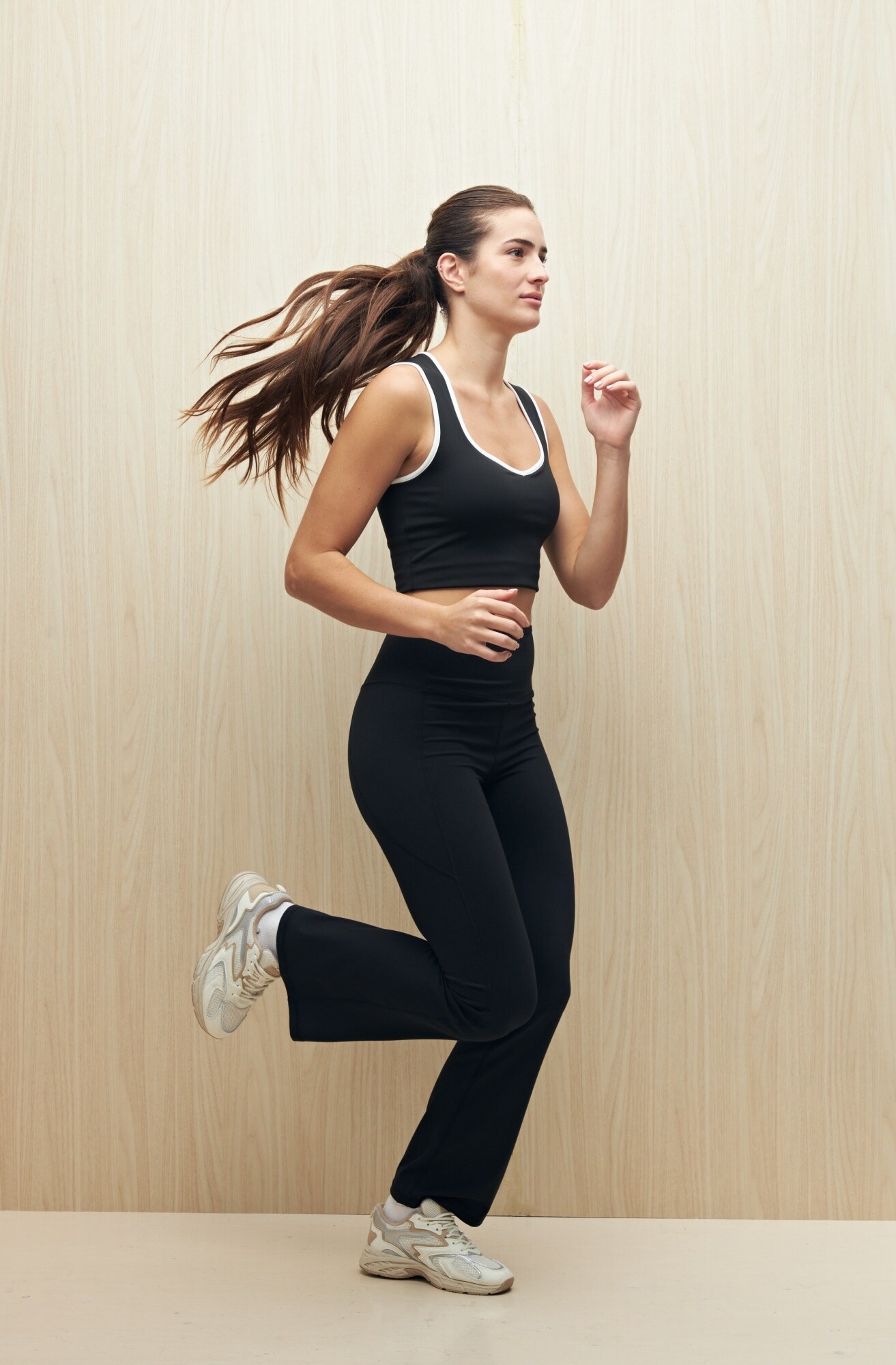 Calza oxford deportiva de tiro alto y calce al cuerpo, diseñada para acompañar el movimiento con comodidad y estilo. El diseño ajustado en cadera y muslos se abre suavemente desde la rodilla, generando una silueta flare que estiliza y aporta un aire trendy y a la vez atemporal. La cintura alta brinda contención y un fit favorecedor, mientras que el tejido con elastano asegura elasticidad y libertad en cada movimiento. Ideal para looks active o para llevar en clave urbana con zapatillas.