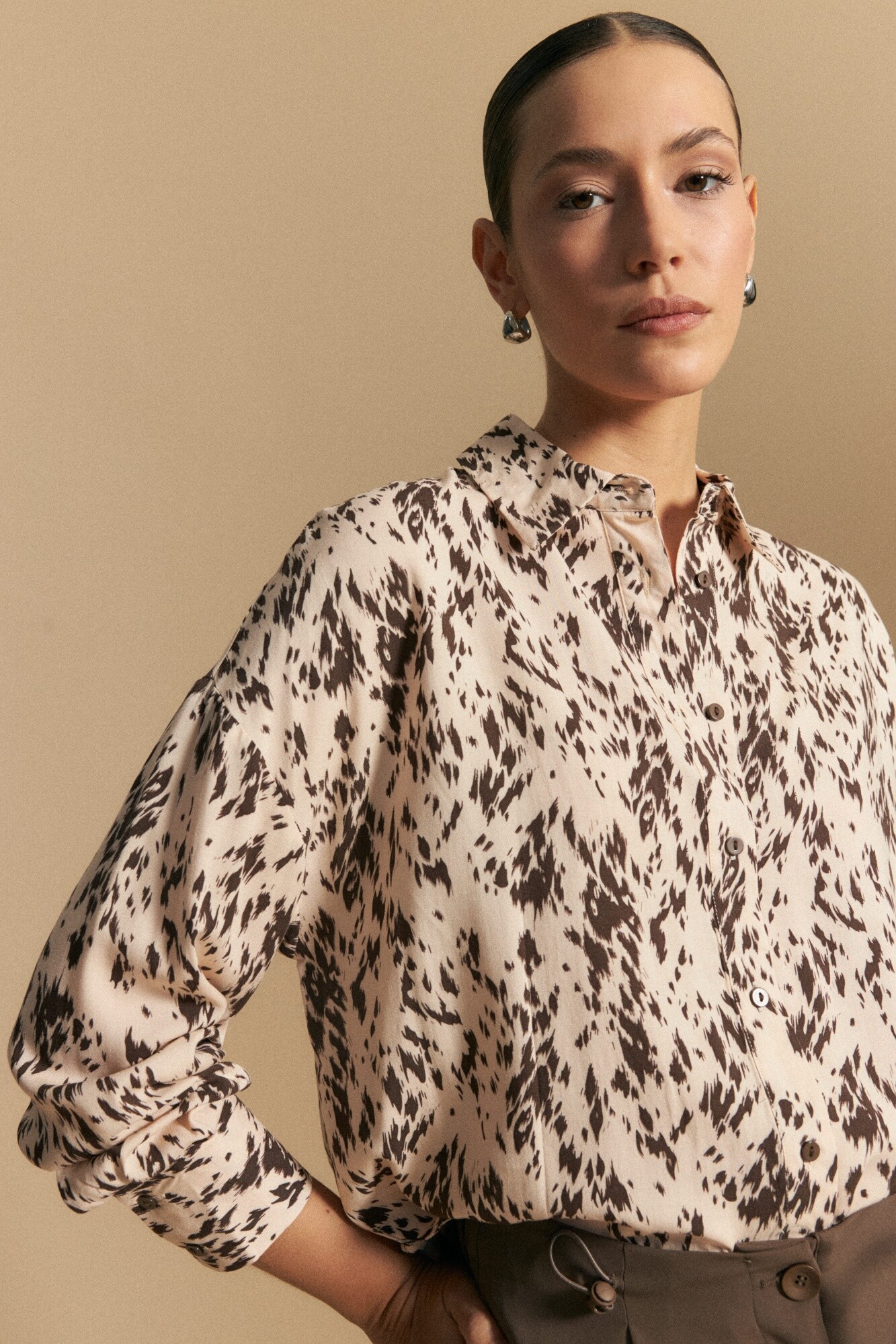 Camisa de manga larga de silueta relajada, un clásico de oficina renovado por el estampado que suma personalidad sin perder elegancia. El diseño de cuello camisero y botones al frente aporta prolijidad, mientras que el tejido liviano acompaña el movimiento y garantiza comodidad durante toda la jornada.