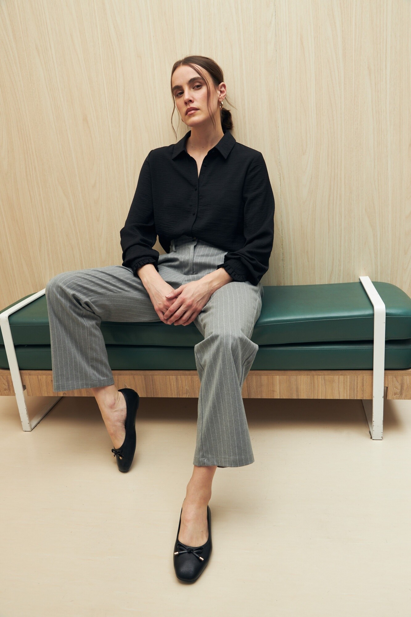 Camisa de manga larga con textura sutil y caída fluida. Presenta cuello clásico, botones forrados a tono y puños con terminación fruncida que suman un detalle delicado. Una prenda versátil, ideal para looks de oficina o para un estilo casual y elegante.