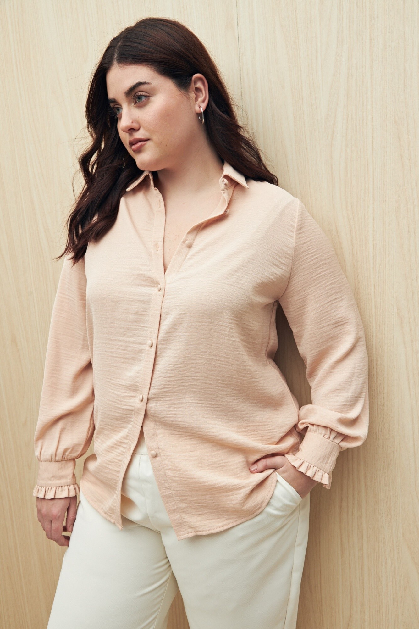 Camisa de manga larga con textura sutil y caída fluida. Presenta cuello clásico, botones forrados a tono y puños con terminación fruncida que suman un detalle delicado. Una prenda versátil, ideal para looks de oficina o para un estilo casual y elegante.