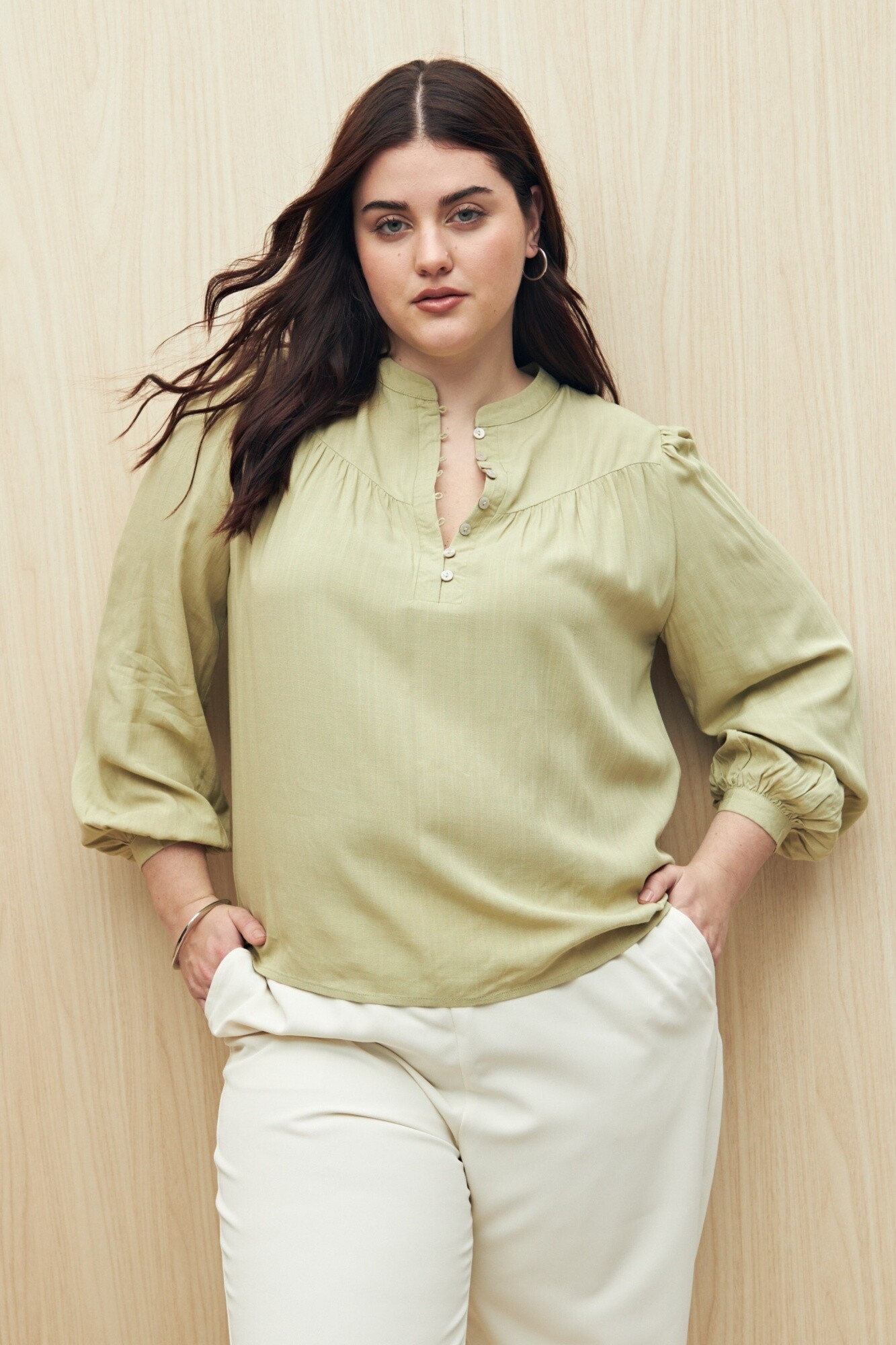 Camisa de manga larga en viscosa suave, con cuello mao y una botonadura parcial al frente que aporta un aire clásico y elegante. El detalle de frunces en los hombros y los puños abotonados le suman delicadeza y estilo, ideal para elevar un look de oficina o acompañar un outfit más relajado.