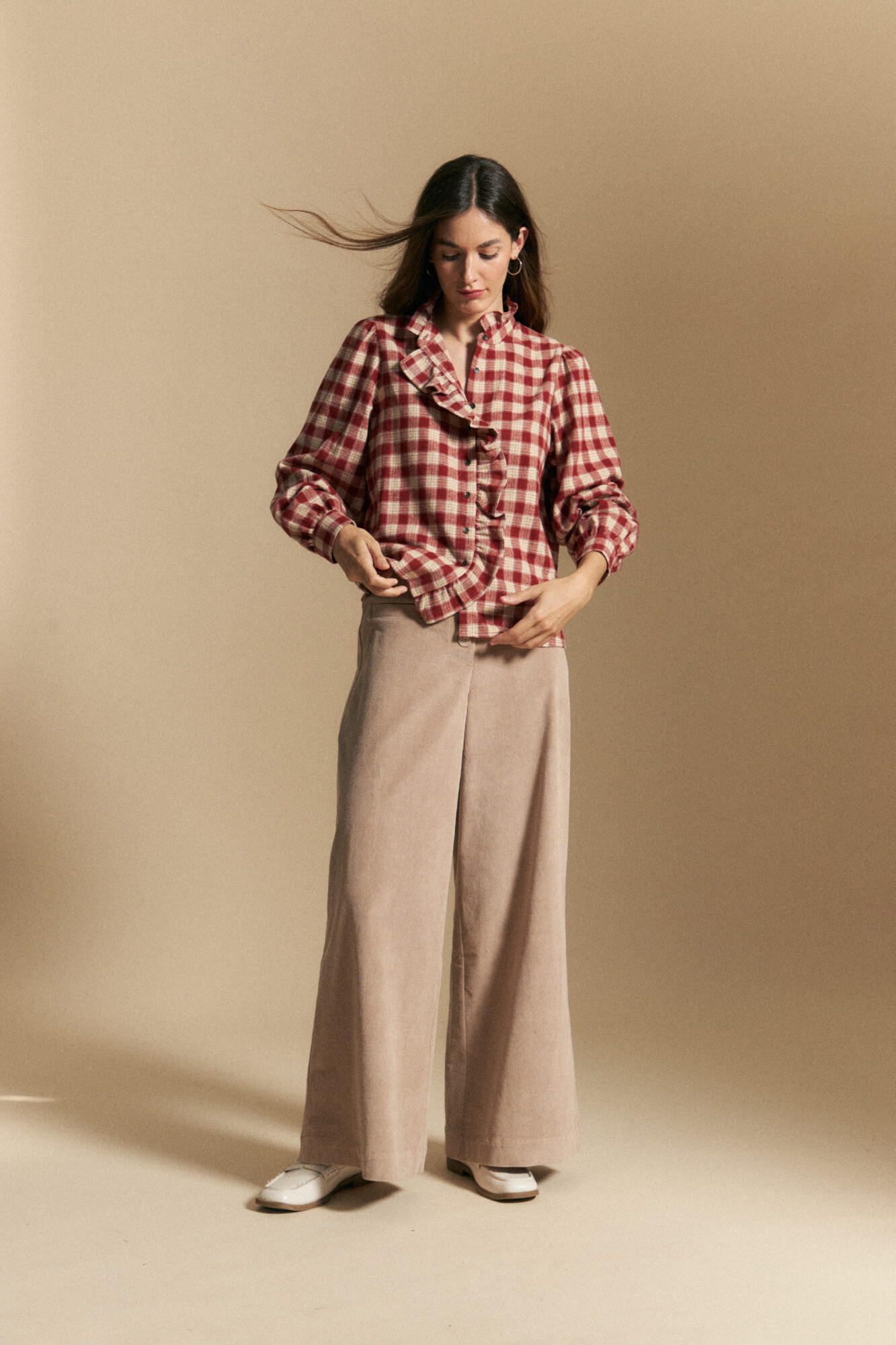 Camisa a cuadros de algodón con volados frontales que aportan movimiento y un guiño femenino a un clásico de inspiración utilitaria. De calce cómodo y mangas con leve volumen, equilibra lo casual con un detalle más romántico, ideal para sumar interés a looks diarios sin perder versatilidad.