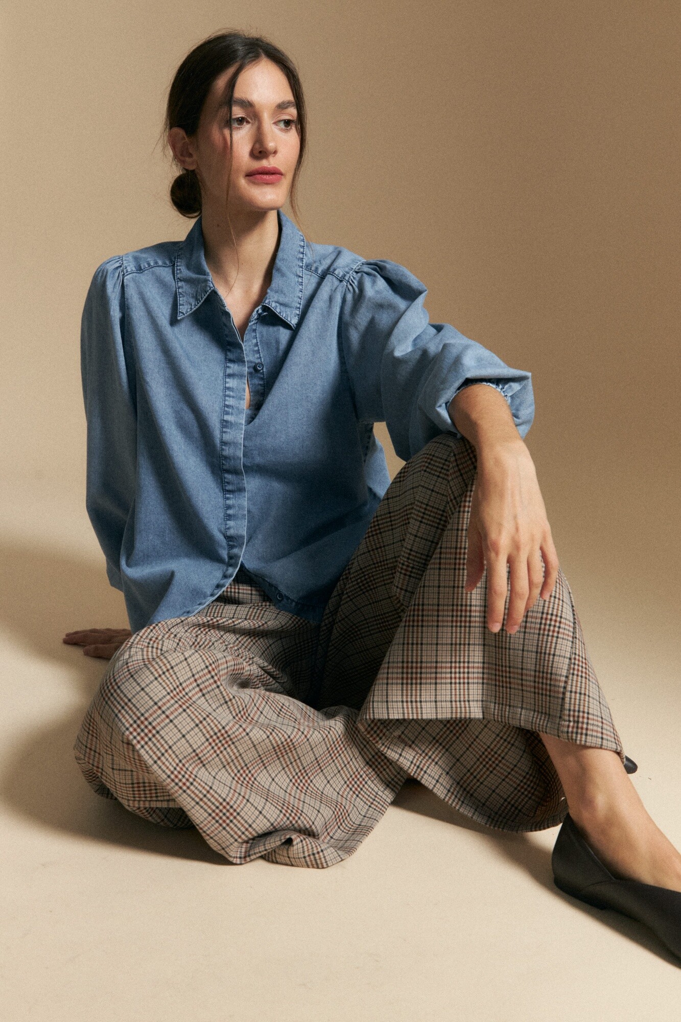 Camisa de jean de manga larga con impronta clásica y un giro contemporáneo gracias a su volumen en mangas y hombros levemente fruncidos. Con cuello camisero y caída suave, combina la esencia utilitaria del denim con un diseño más femenino y actual. Ideal para sumar textura y carácter a looks cotidianos, funcionando tanto como prenda principal o en capas.