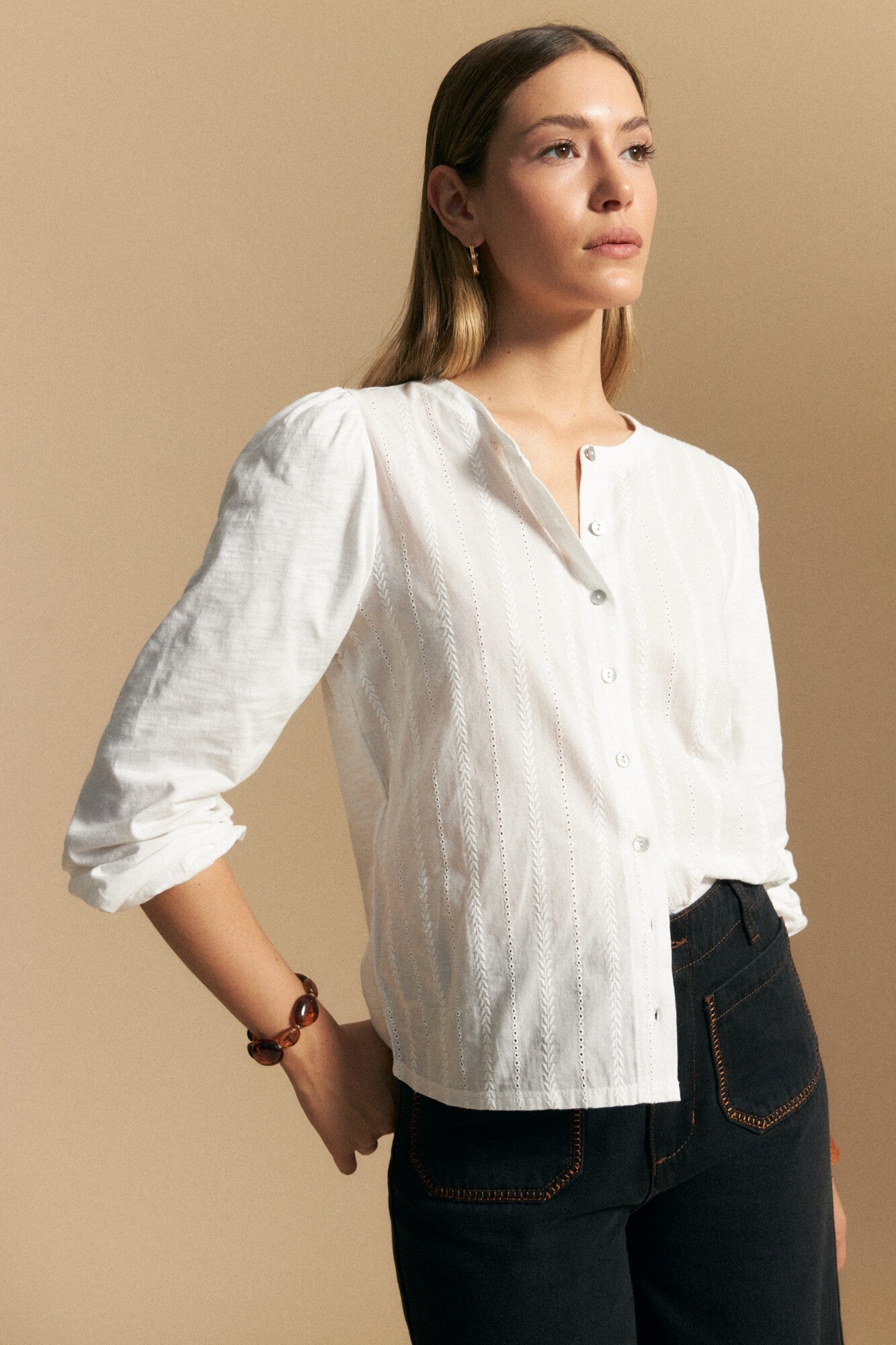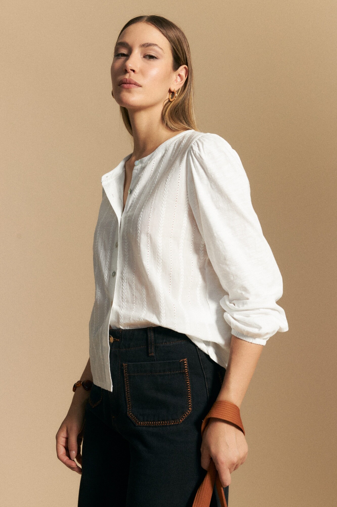 Camisa de algodón con bordado calado que reinterpreta un clásico femenino con una impronta actual. El diseño incorpora delicadas líneas bordadas en sentido vertical que estilizan la silueta y aportan textura sutil, mientras que el escote con botones suma un detalle limpio y versátil.