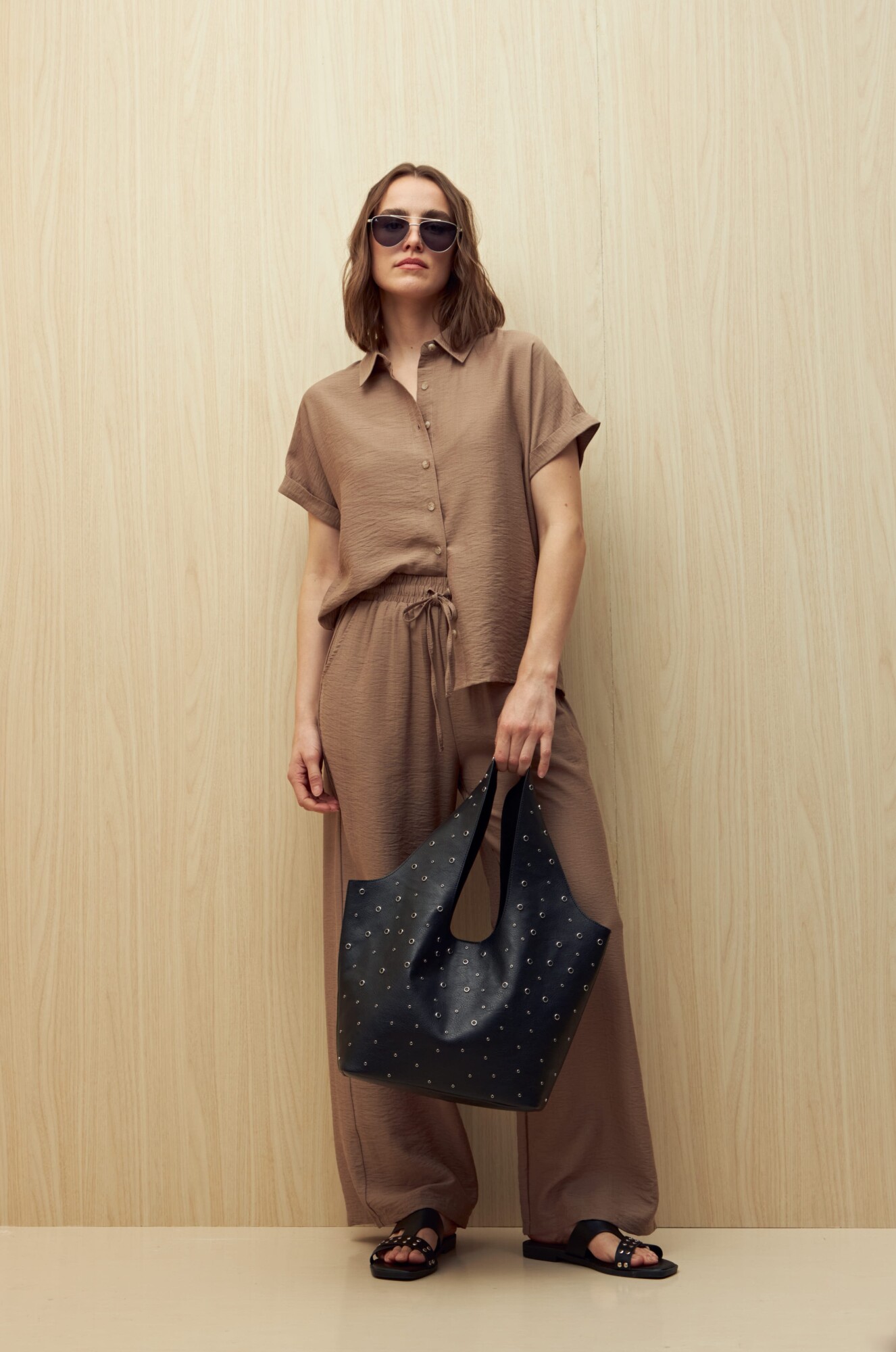 Ligera, fresca y con una textura suave al tacto, esta camisa de manga corta se convierte en una prenda esencial para un look relajado pero con estilo. Su caída natural y el diseño con botones al frente la hacen ideal para usar abierta sobre tops o cerrada para un outfit más pulido. Los puños con vuelta y el tejido liviano aportan movimiento y comodidad, perfecta para acompañarte desde la oficina hasta un paseo de verano.