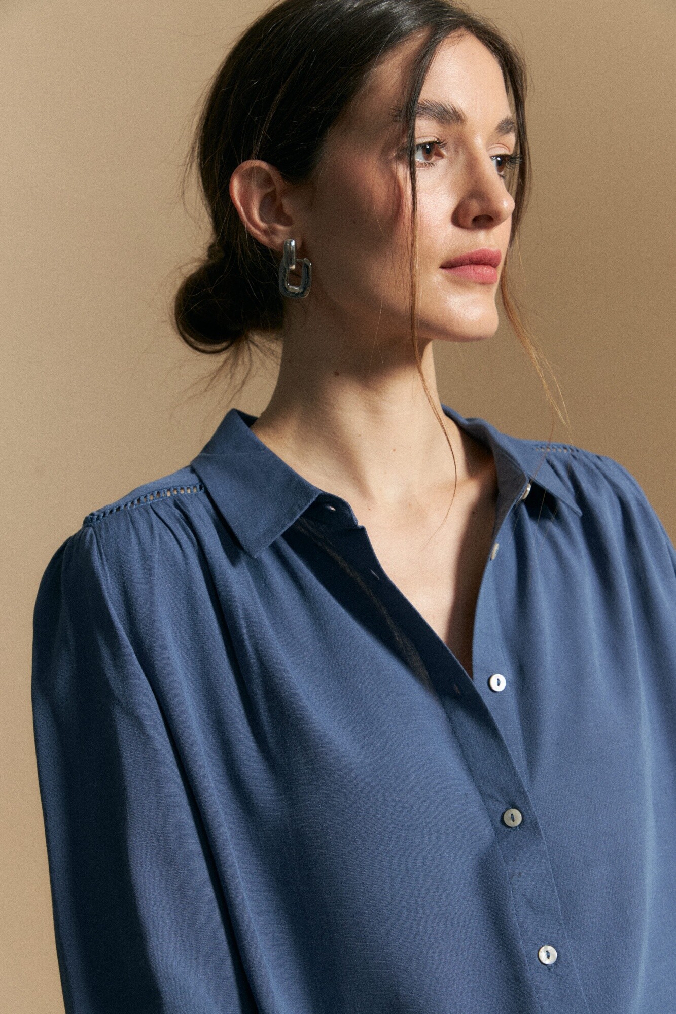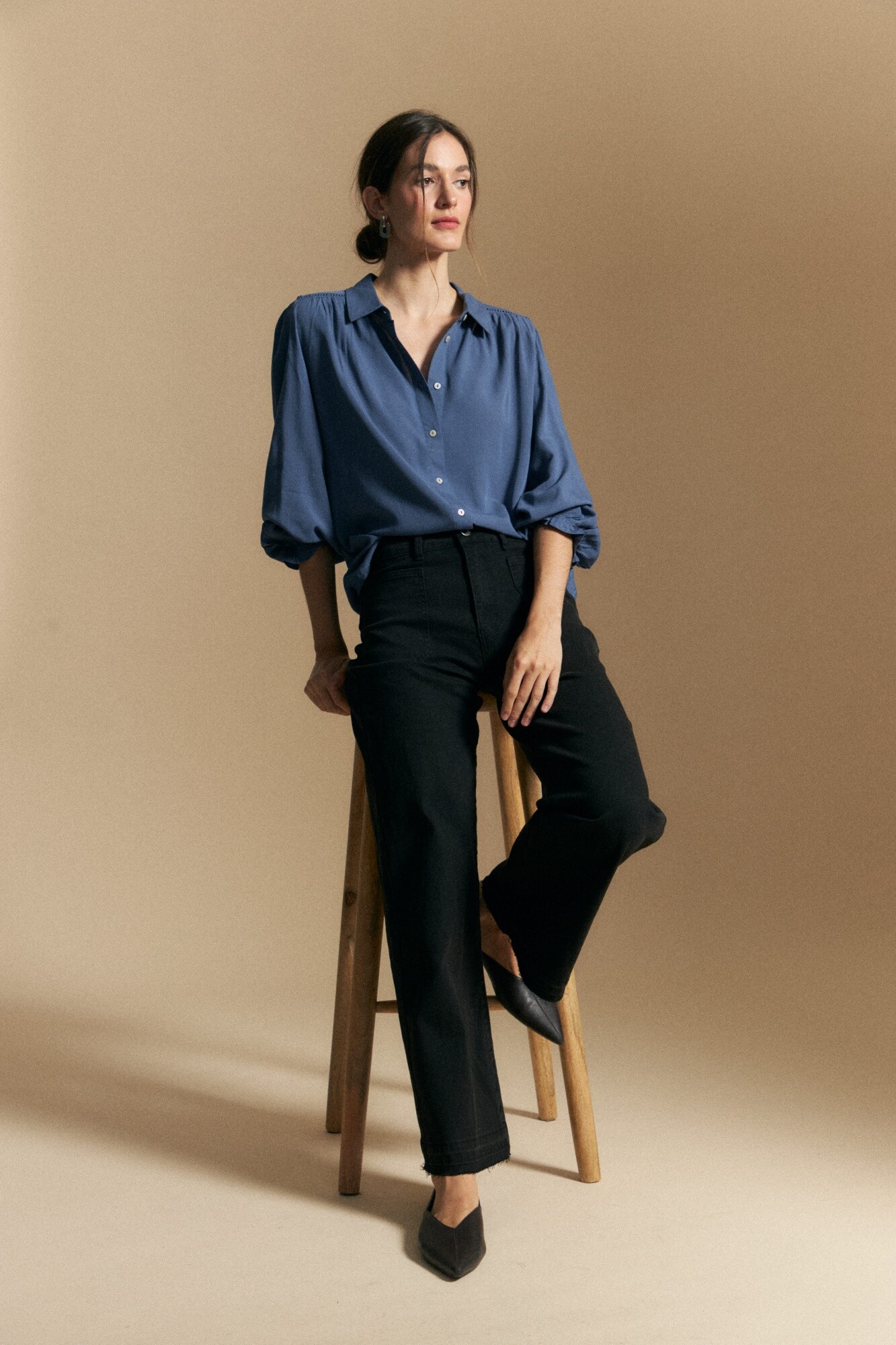Camisa de manga larga con una impronta delicada y cuidada en los detalles. El diseño se destaca por la vainilla en la espalda, que aporta movimiento y un diferencial sutil, mientras que los puños elastizados con voladitos suman un acabado femenino y cómodo. De calce fluido y caída liviana, acompaña el cuerpo sin marcar, logrando un equilibrio entre prolijidad y frescura.