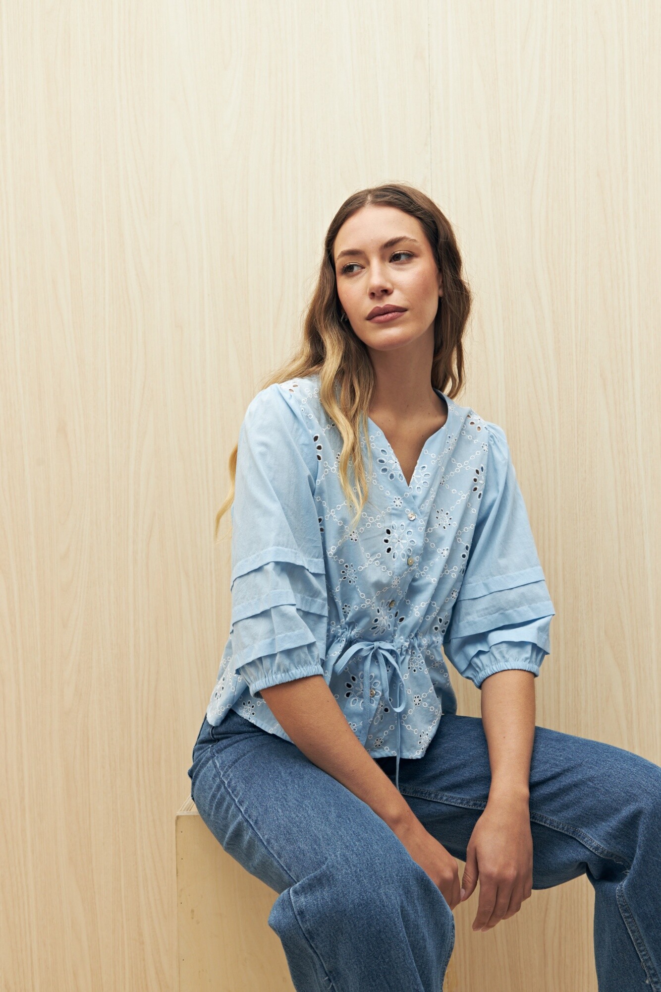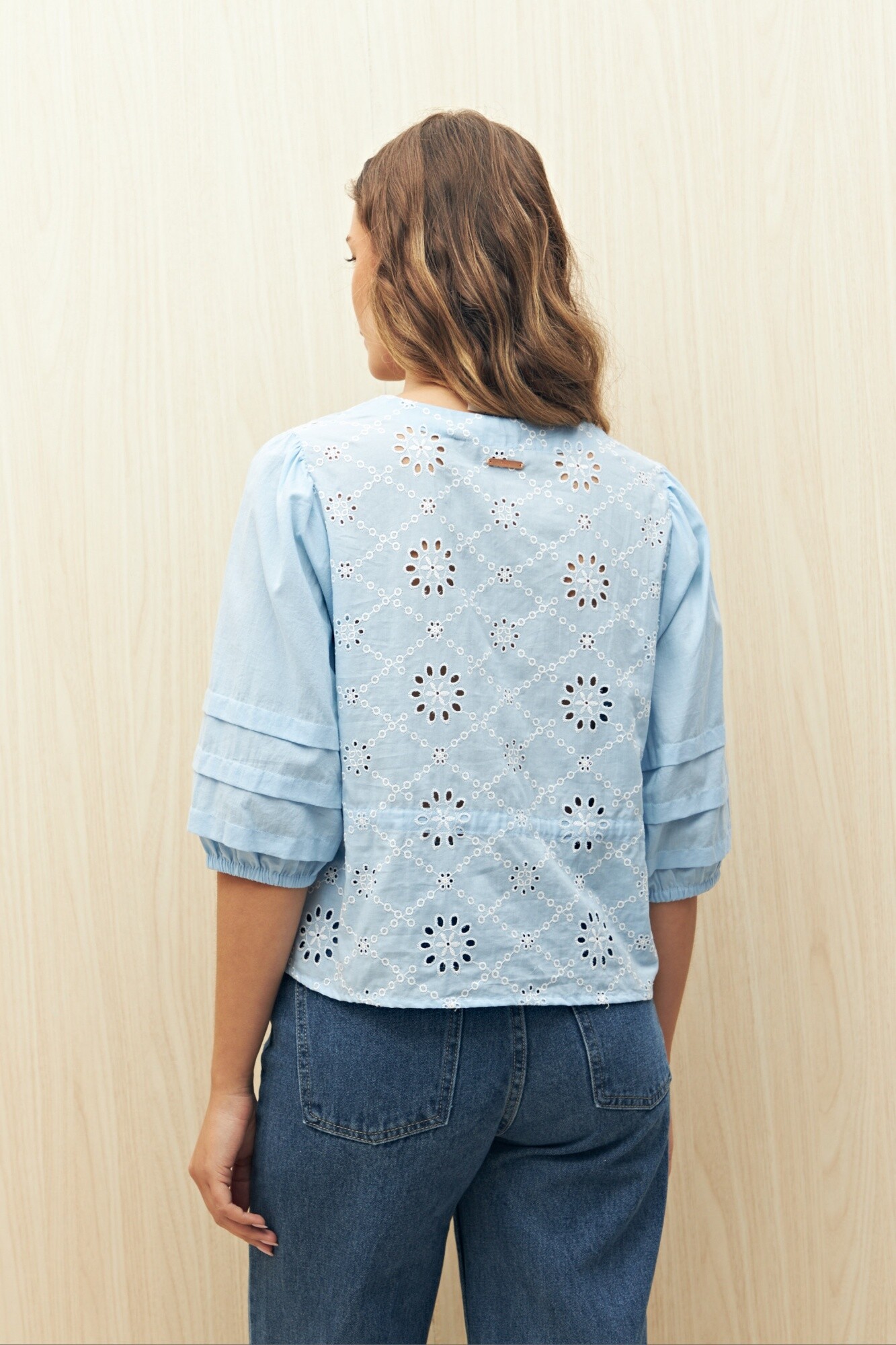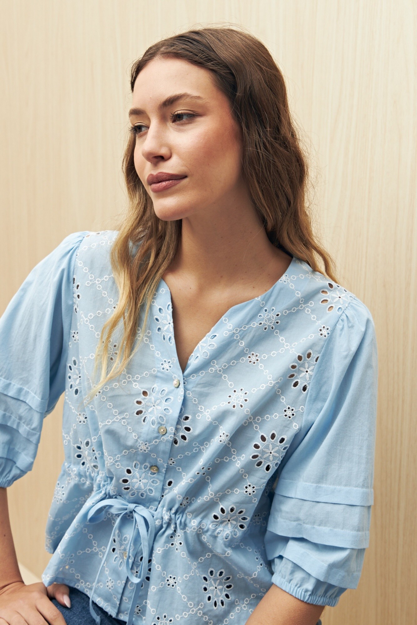 Camisa manga 3/4 de broderie confeccionada en algodón. Presenta escote en “V”, botones de nácar al frente y lazo ajustable que define la cintura. Las mangas tienen terminación con pequeñas tablas que aportan textura y un toque artesanal. Una prenda femenina y fresca, ideal para elevar looks casuales.