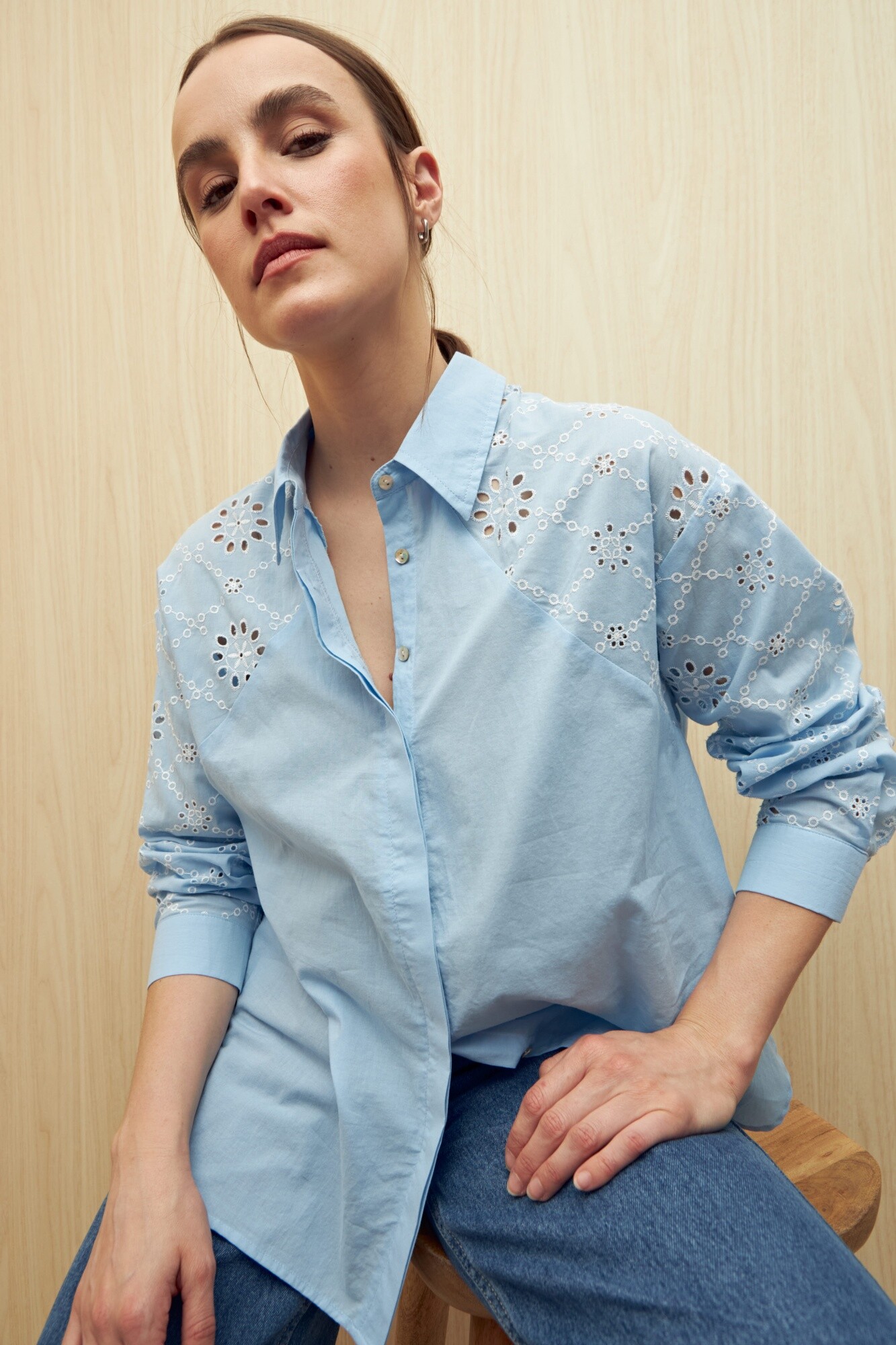 Camisa de manga larga con detalle de broderie en el canesú y las mangas, que aporta textura y un aire artesanal. De corte clásico con cuello camisero y botones de nácar, logra un equilibrio entre lo femenino y lo atemporal. Perfecta para elevar looks relajados o acompañar opciones más formales.