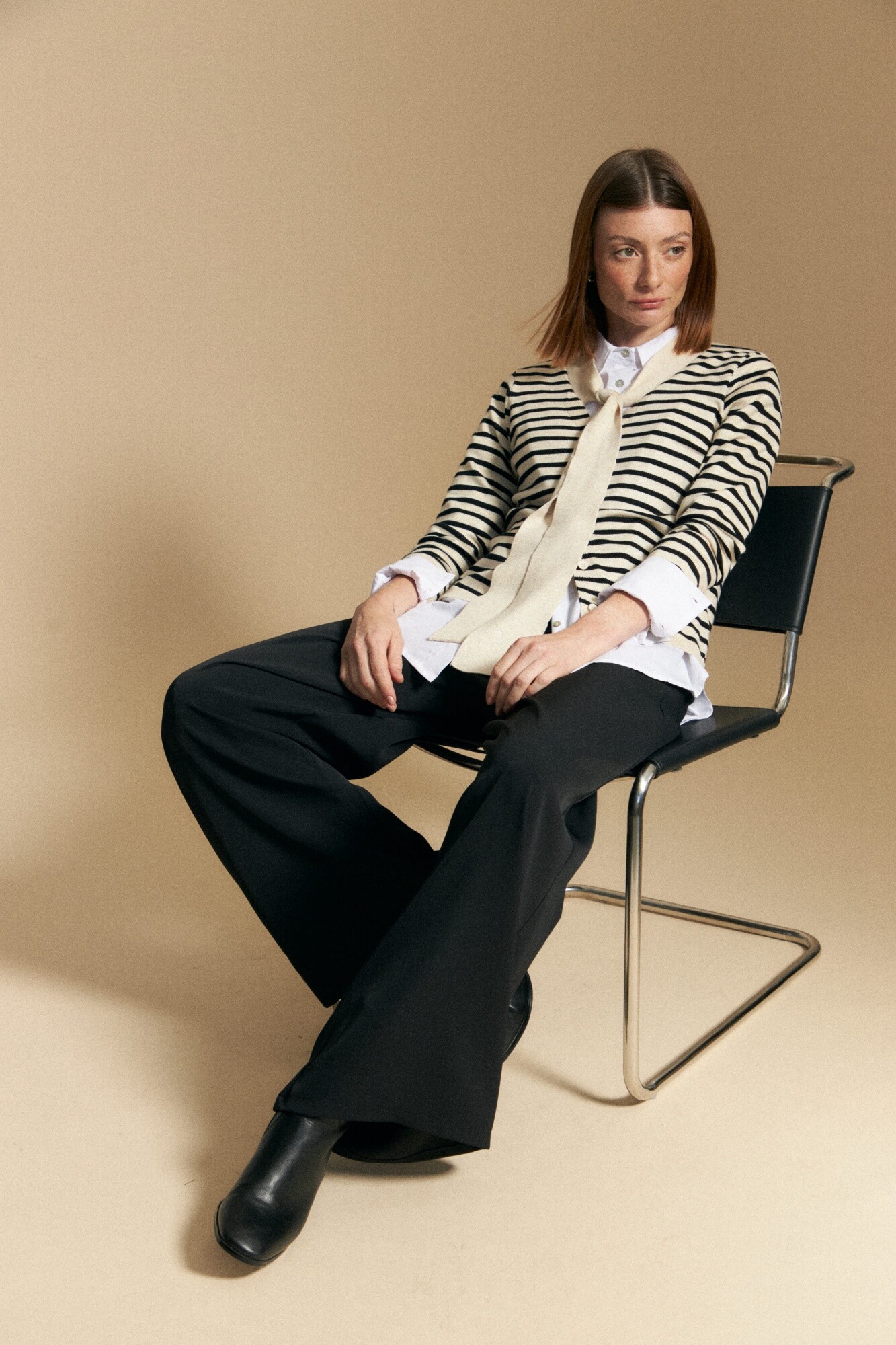 Cárdigan a rayas de tejido liviano, pensado para sumar una capa prolija y funcional al look. El diseño clásico se actualiza con un lazo frontal que aporta un gesto sutil de estilo y permite adaptarlo según cómo se anude. Ideal para completar conjuntos de oficina o elevar outfits más relajados, es una prenda versátil que acompaña bien tanto propuestas formales como combinaciones más descontracturadas.