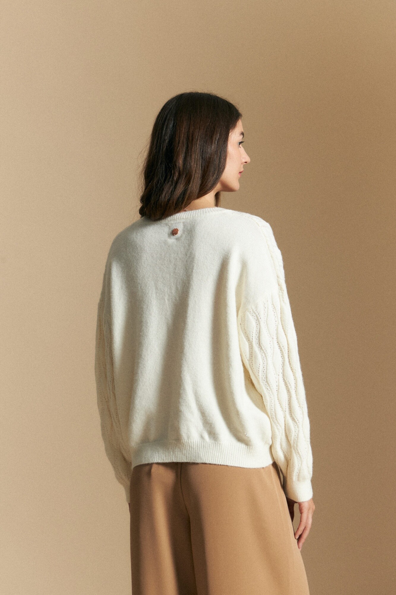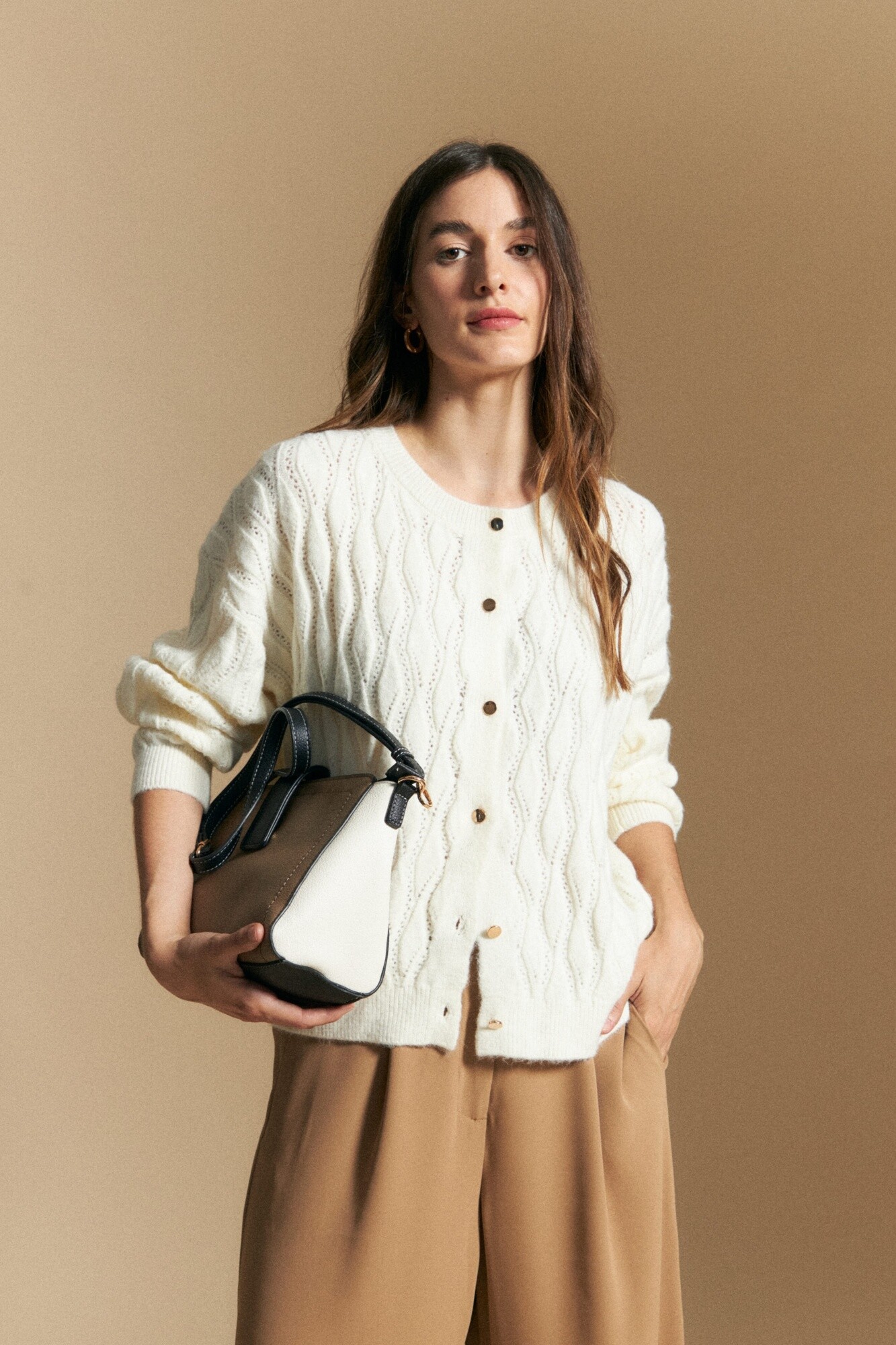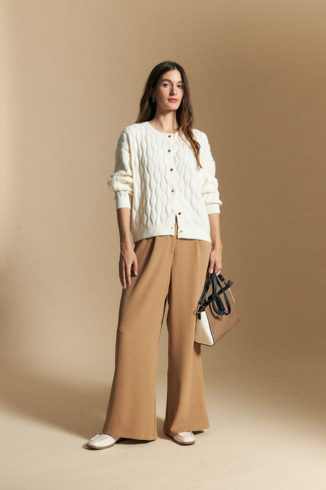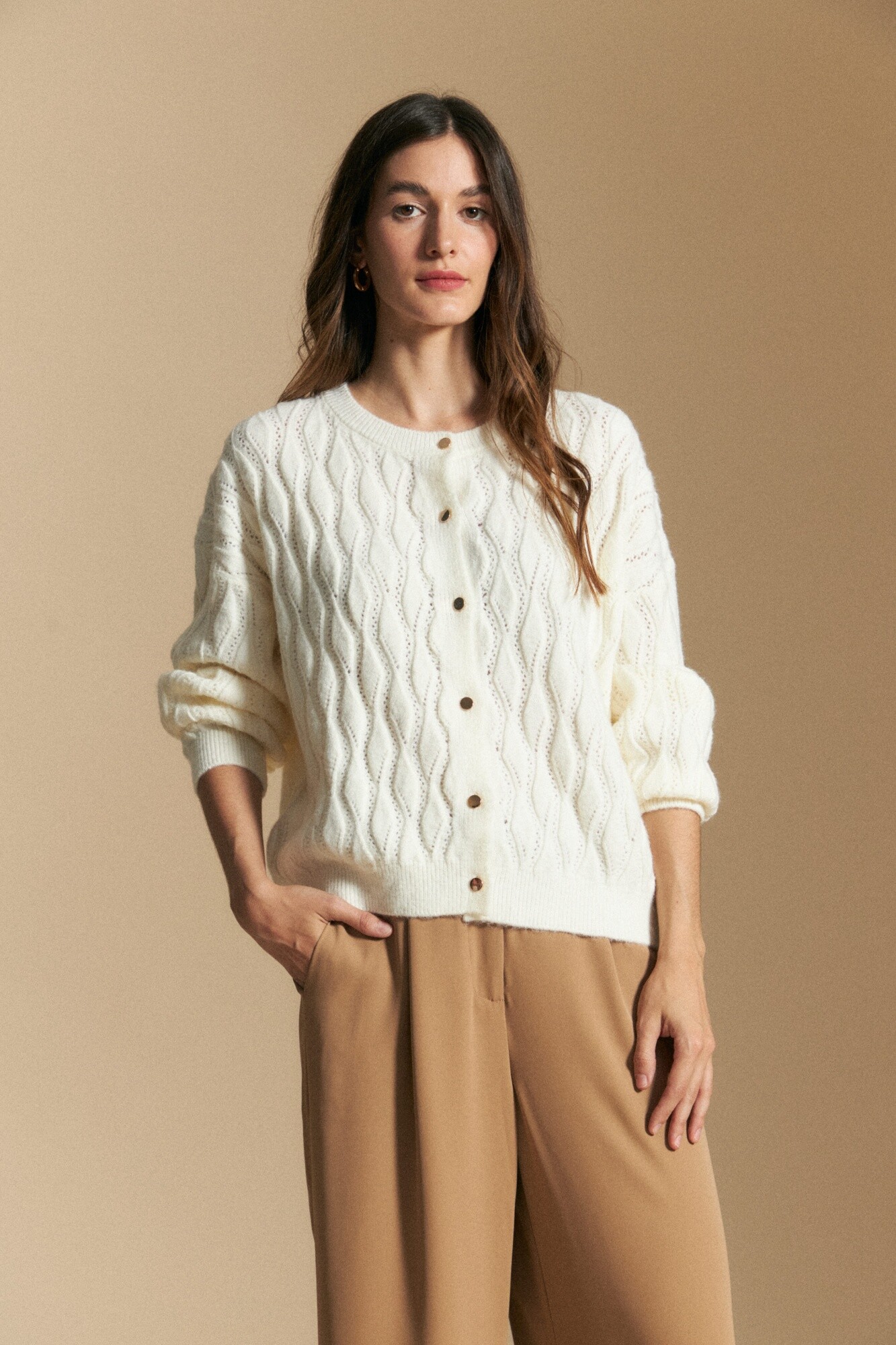 Cardigan tramado con textura protagonista que aporta dimensión y un aire artesanal al diseño. De silueta cómoda y cuello redondo, presenta tejido calado con leve relieve que suma interés visual sin perder versatilidad. Ideal para usar en capas y acompañar tanto looks relajados como combinaciones más pulidas, siendo una prenda clave para elevar cualquier look.
