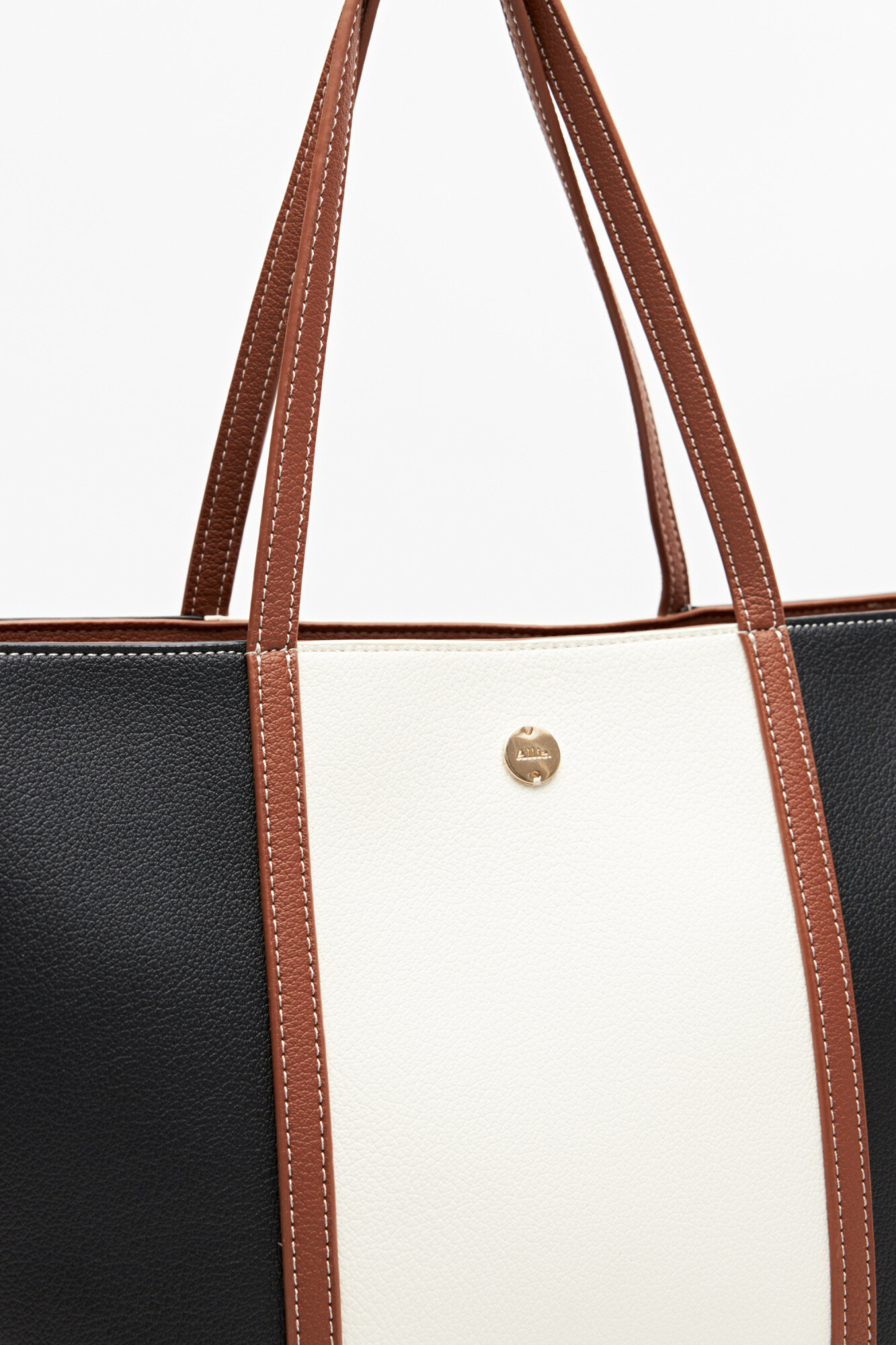 Cartera amplia en símil cuero de acabado suave, con diseño en bloques que combina texturas y aporta un contraste moderno y sofisticado. Su formato tote con asas largas permite llevarla cómodamente al hombro, ideal para acompañarte en jornadas largas sin resignar estilo.