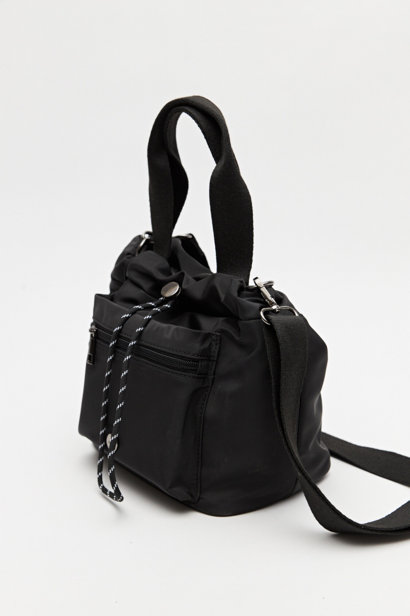 Presenta cierre superior con ajuste tipo cordón y bolsillo frontal con cierre, pensado para mantener los esenciales organizados. Los herrajes metálicos y el diseño contemporáneo refuerzan su impronta urbana, convirtiéndola en un accesorio práctico que complementa looks casuales y deportivos.