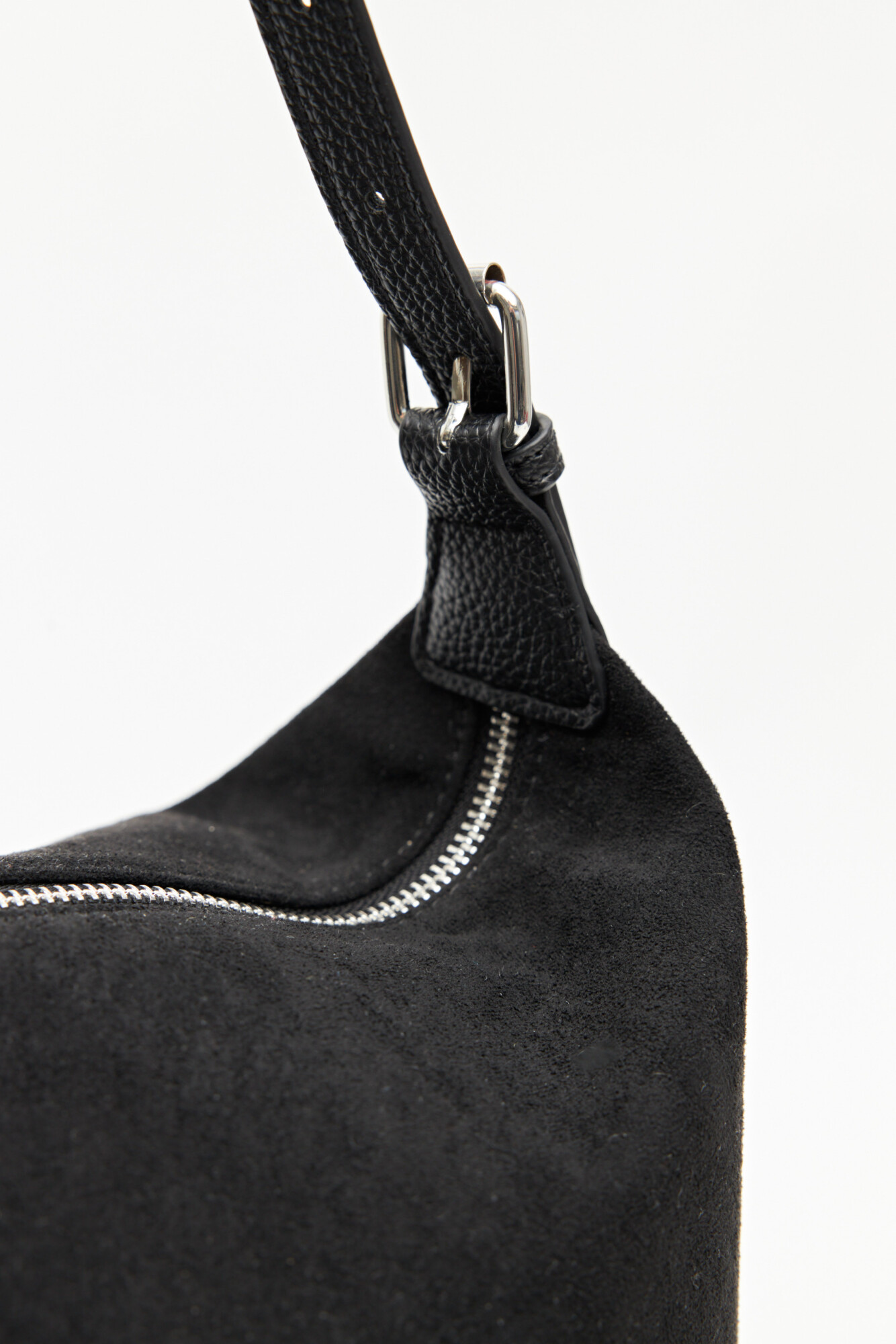Cartera de gamuza confeccionada en material de textura suave y acabado aterciopelado, que aporta profundidad y un aire sofisticado al diseño. Su silueta amplia y flexible permite llevar lo esencial con comodidad, mientras que el cierre superior metálico asegura practicidad en el uso diario.