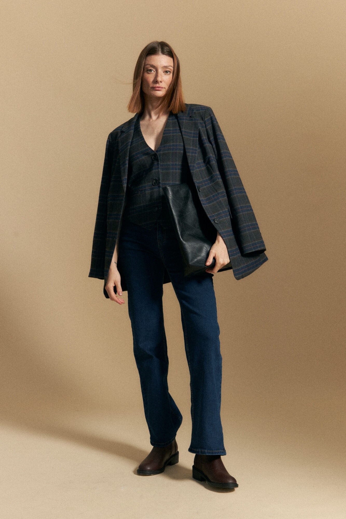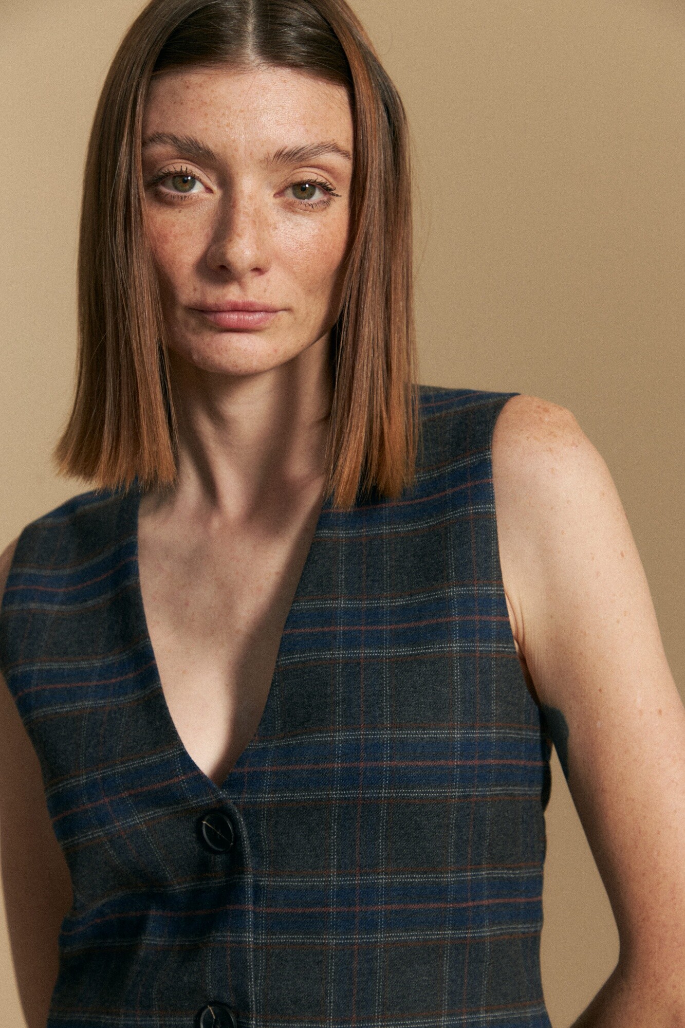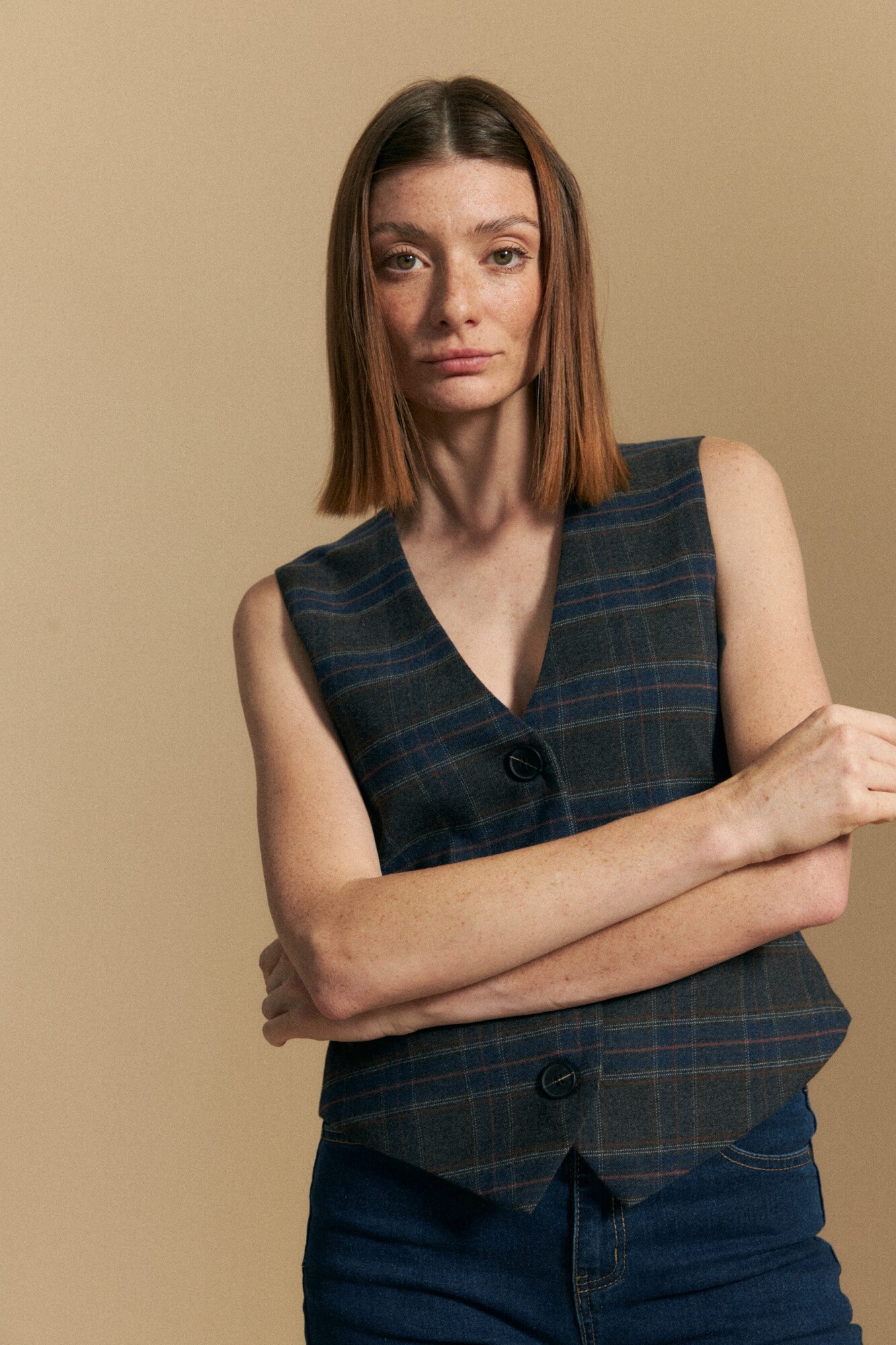 Chaleco a cuadros de inspiración sastrera ideal para sumar un guiño clásico a looks actuales. De escote en V y moldería entallada, presenta abotonadura frontal y terminación en punta que estiliza la silueta. En la espalda, el ajuste con hebilla permite adaptar el fit, aportando un acabado más pulido. Perfecto para usar solo o en capas, logrando desde un office look hasta combinaciones más relajadas.