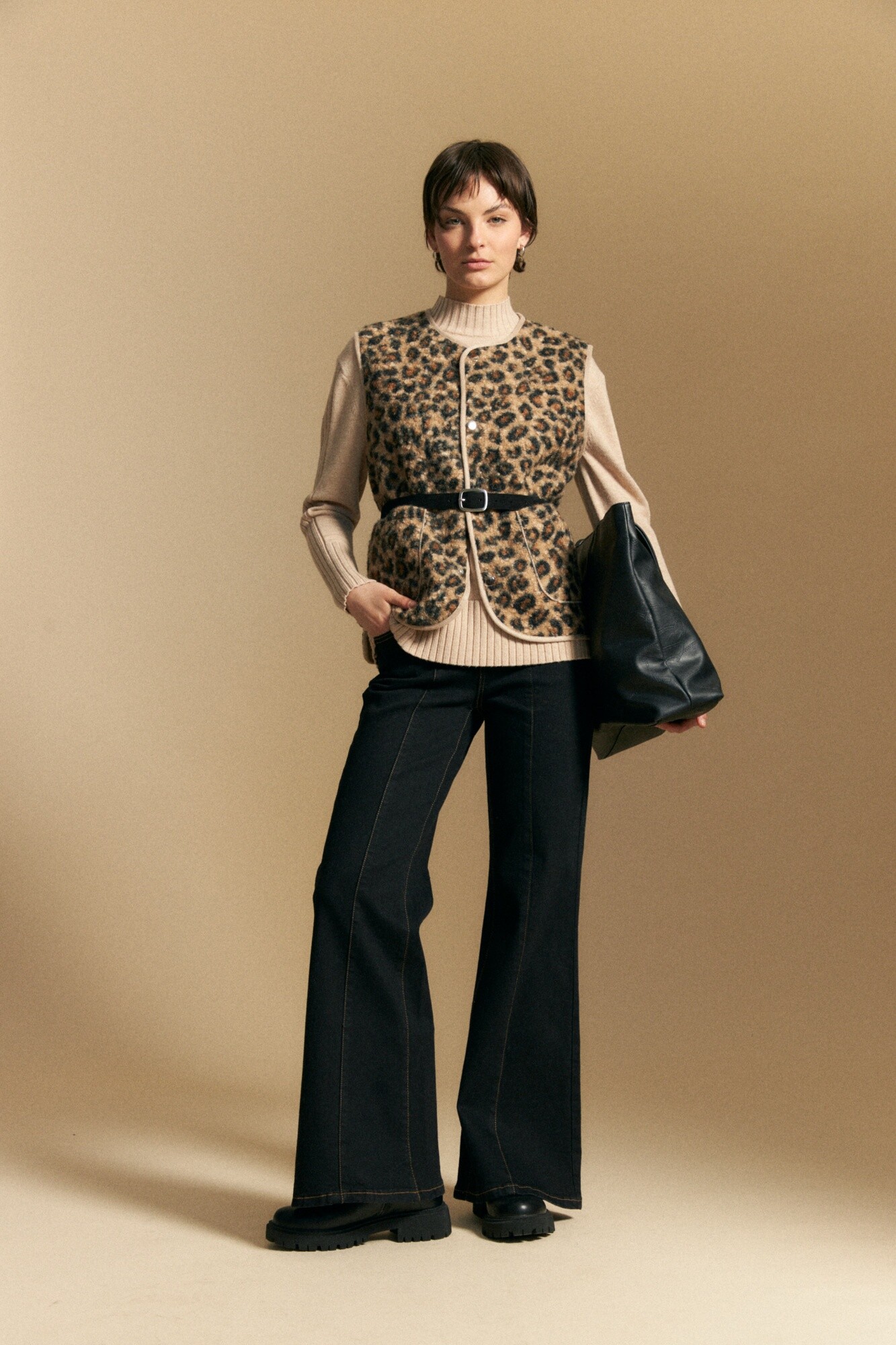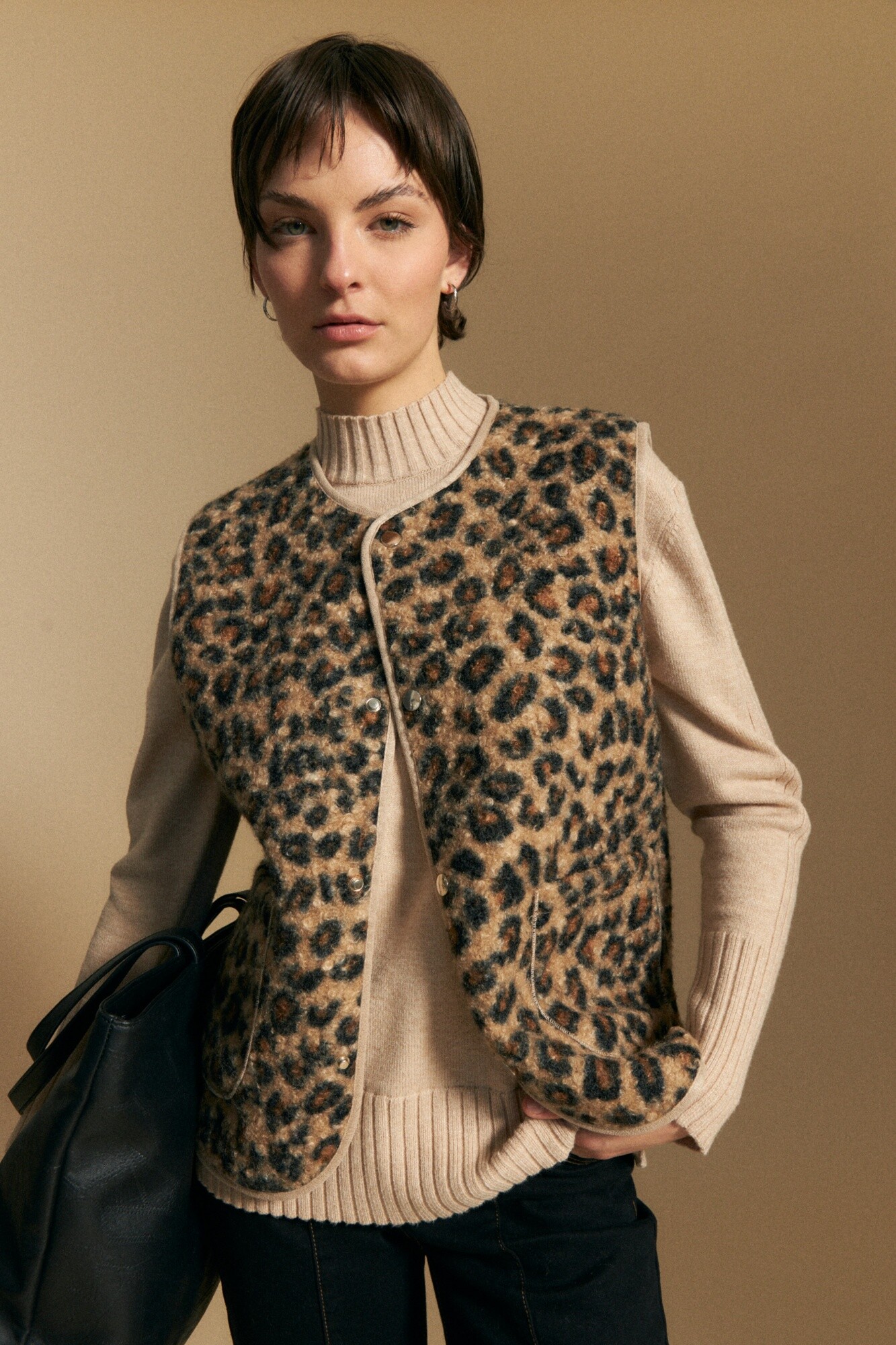 Chaleco animal print, una prenda protagonista que eleva cualquier look con un toque trendy y audaz. El diseño sin mangas permite superponerlo fácilmente sobre sweaters o camisas, mientras que los bolsillos frontales y el cierre a presión aportan practicidad. Ideal para sumar textura y personalidad a outfits invernales.