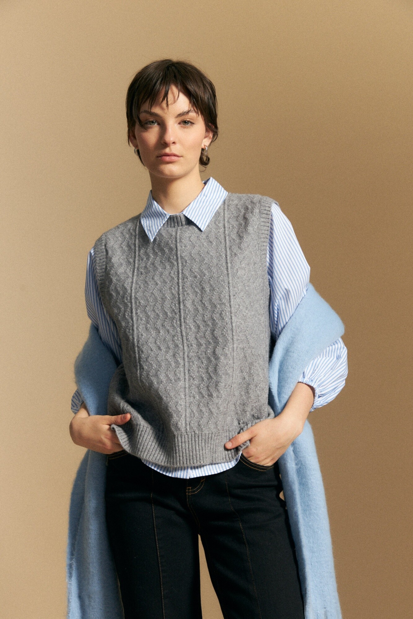 Chaleco tejido con textura sutil en relieve que aporta profundidad y un aire contemporáneo al diseño. De calce relajado y escote cerrado, presenta terminaciones acanaladas que estructuran la silueta y lo hacen ideal para superponer sobre camisas o remeras. Una prenda versátil que se adapta tanto a looks casuales como a combinaciones más armadas.