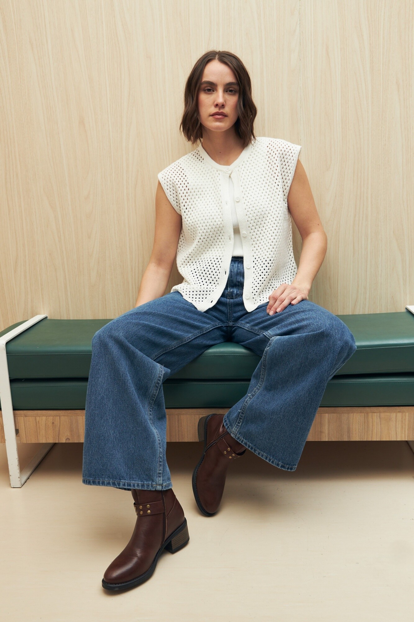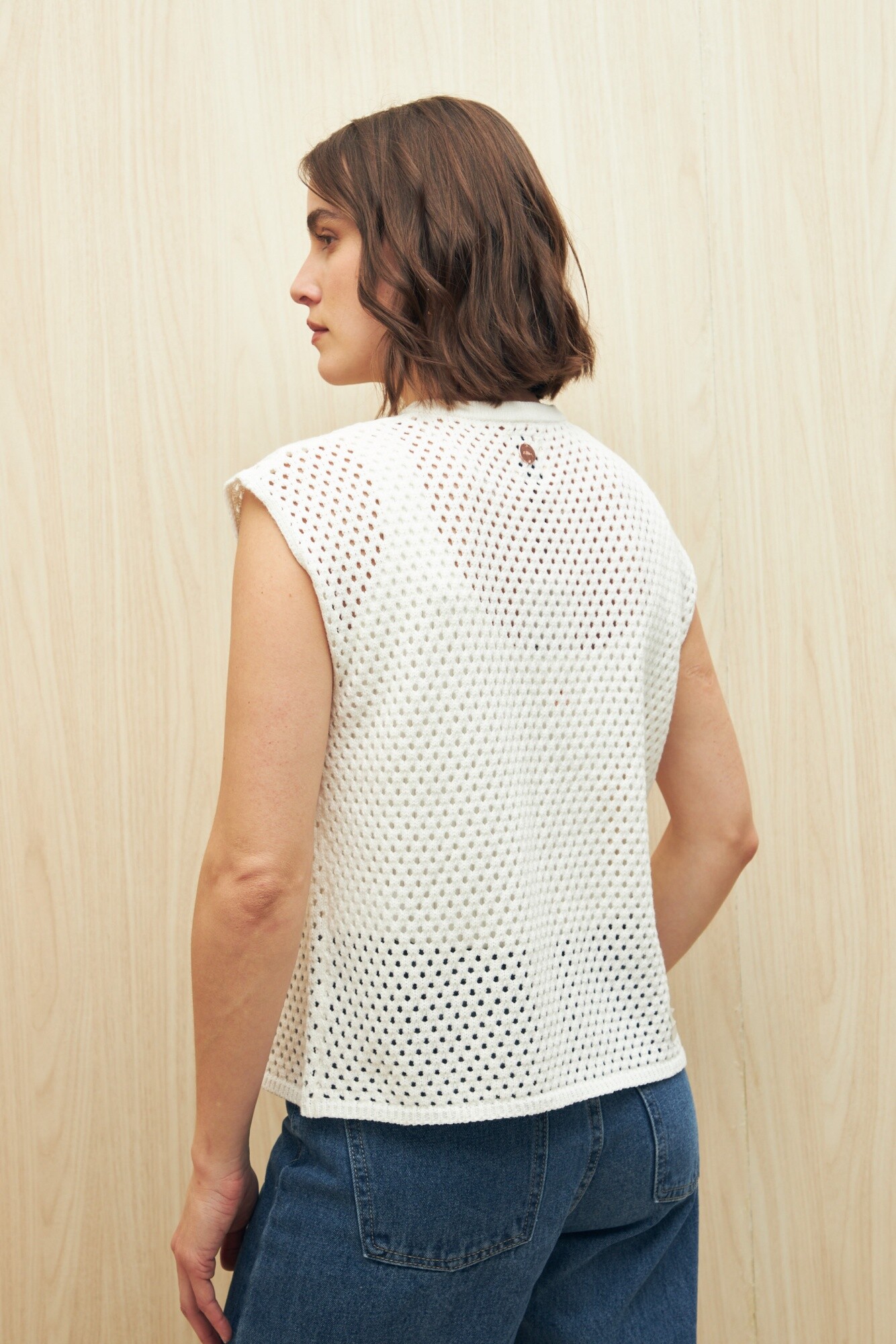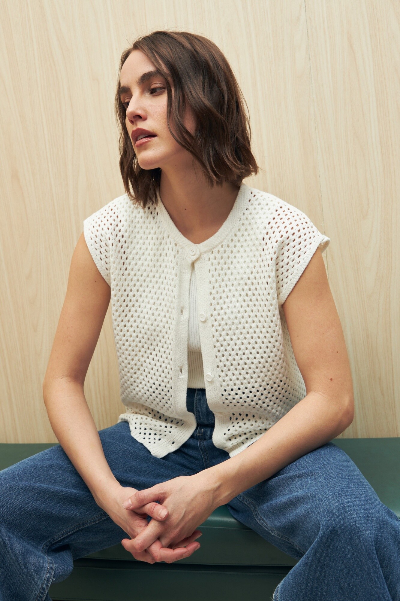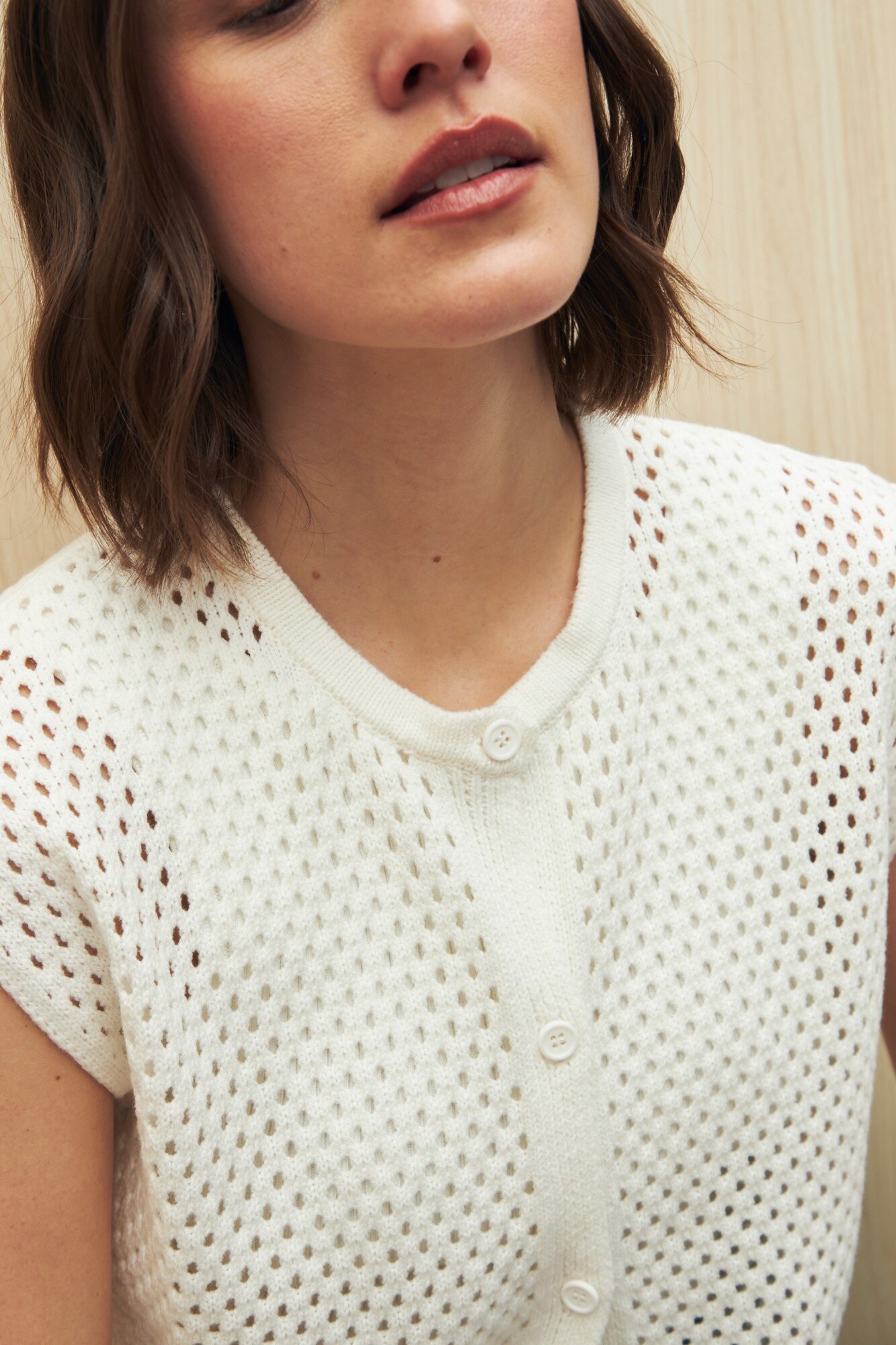 Chaleco tejido calado, sin mangas, con botones al frente y diseño abierto que lo hace ideal para superponer sobre tops o camisas. Su textura ligera y fresca lo convierte en un básico trendy, perfecto para sumar un toque actual a looks urbanos o casuales.