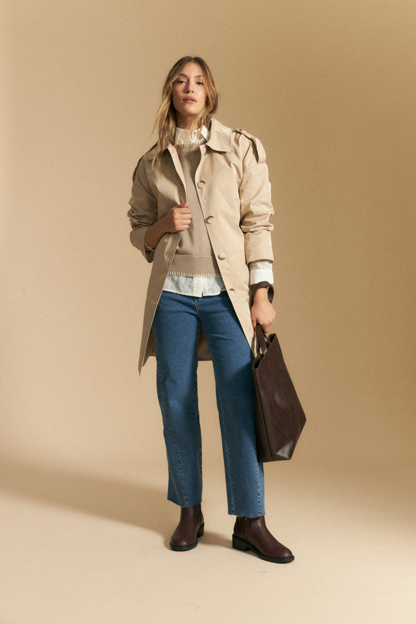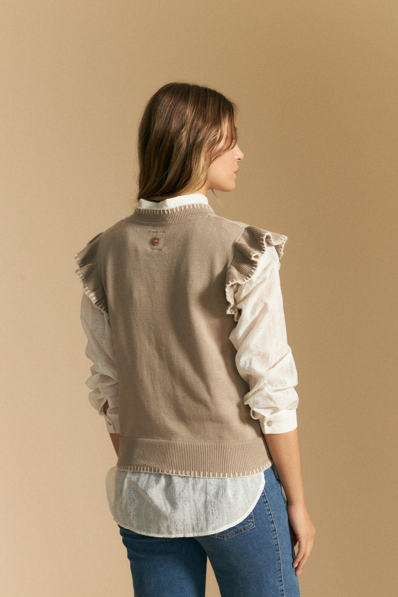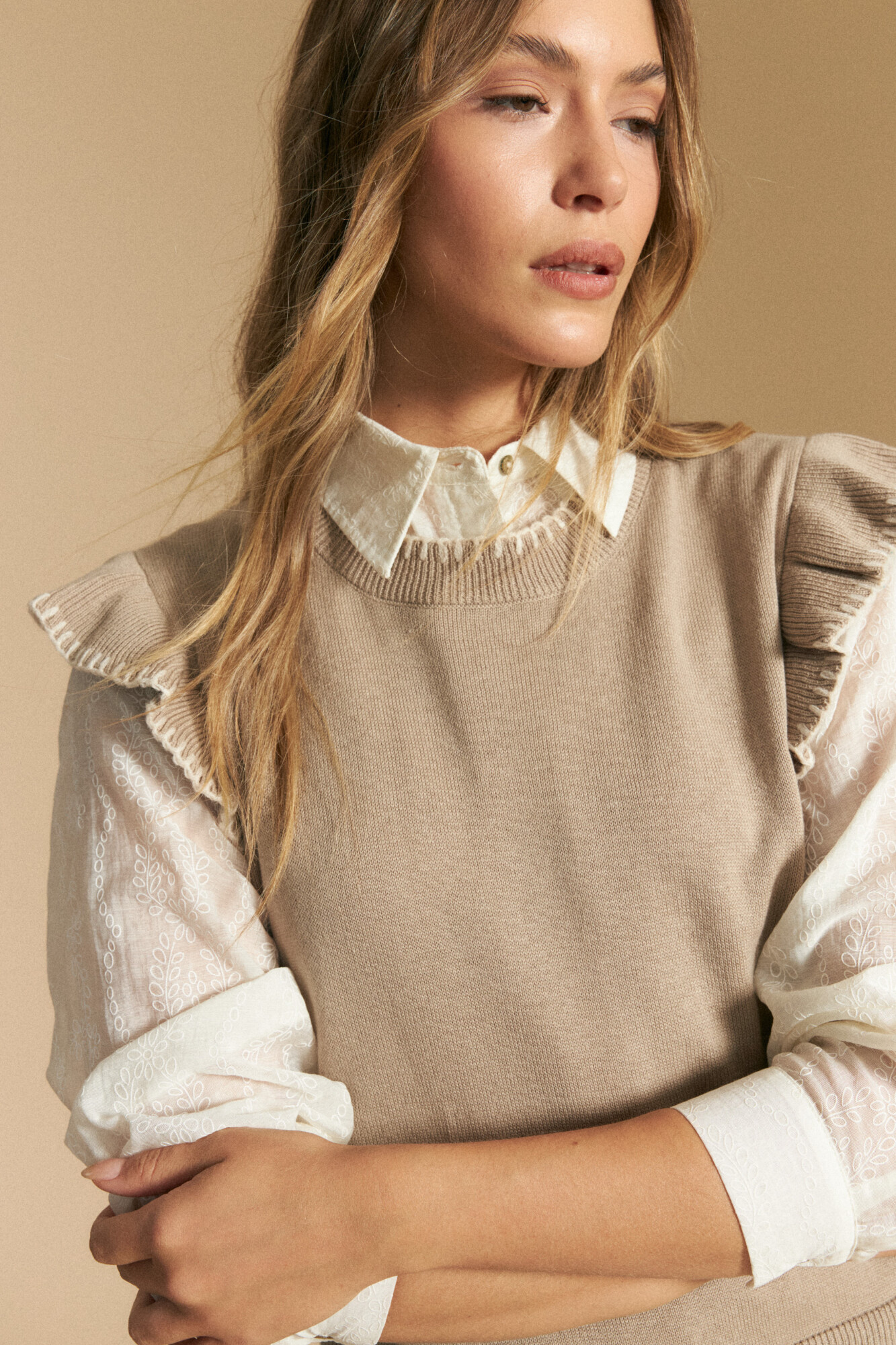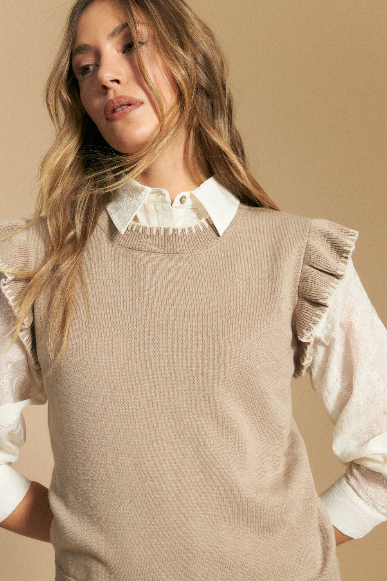 Diseño de silueta recta y terminaciones delicadas que aportan un diferencial sutil al clásico top tejido. Presenta cuello redondo y volados en las sisas con terminación en contraste, un detalle que suma textura y un aire femenino sin perder versatilidad. El tejido de punto ofrece una estructura suave y confortable, ideal para combinar tanto con denim como con prendas más formales. Una pieza en tendencia que funciona como comodín de guardarropa, clave para elevar cualquier look.