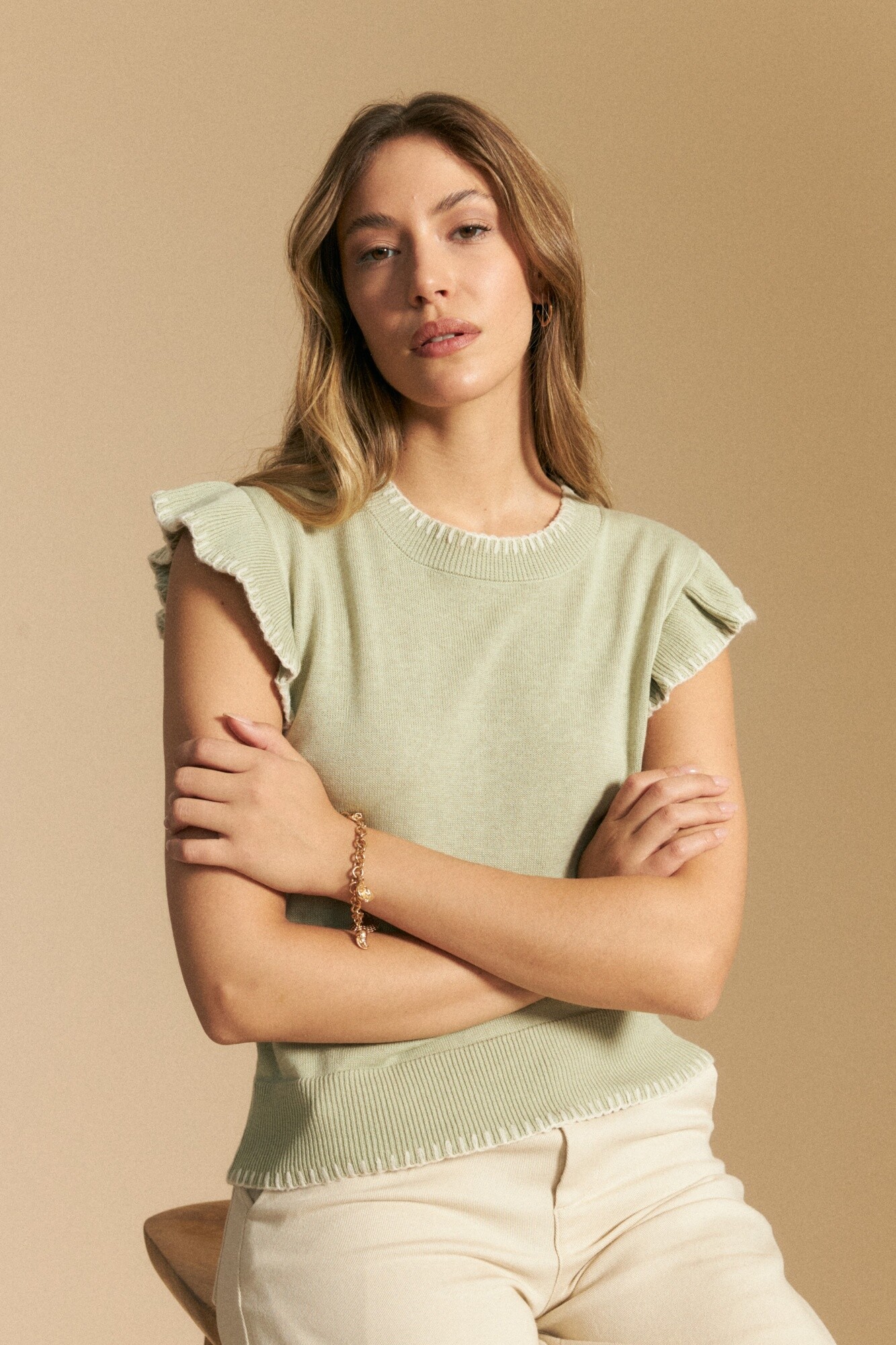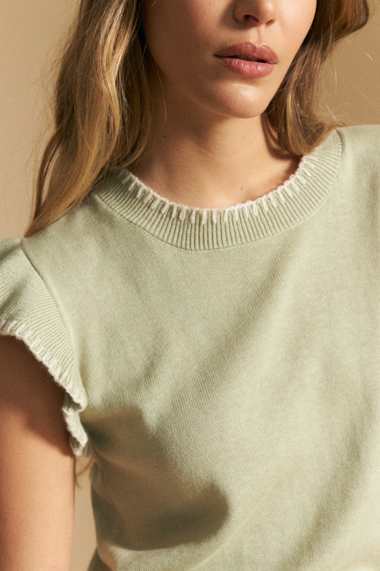 Diseño de silueta recta y terminaciones delicadas que aportan un diferencial sutil al clásico top tejido. Presenta cuello redondo y volados en las sisas con terminación en contraste, un detalle que suma textura y un aire femenino sin perder versatilidad. El tejido de punto ofrece una estructura suave y confortable, ideal para combinar tanto con denim como con prendas más formales. Una pieza en tendencia que funciona como comodín de guardarropa, clave para elevar cualquier look.