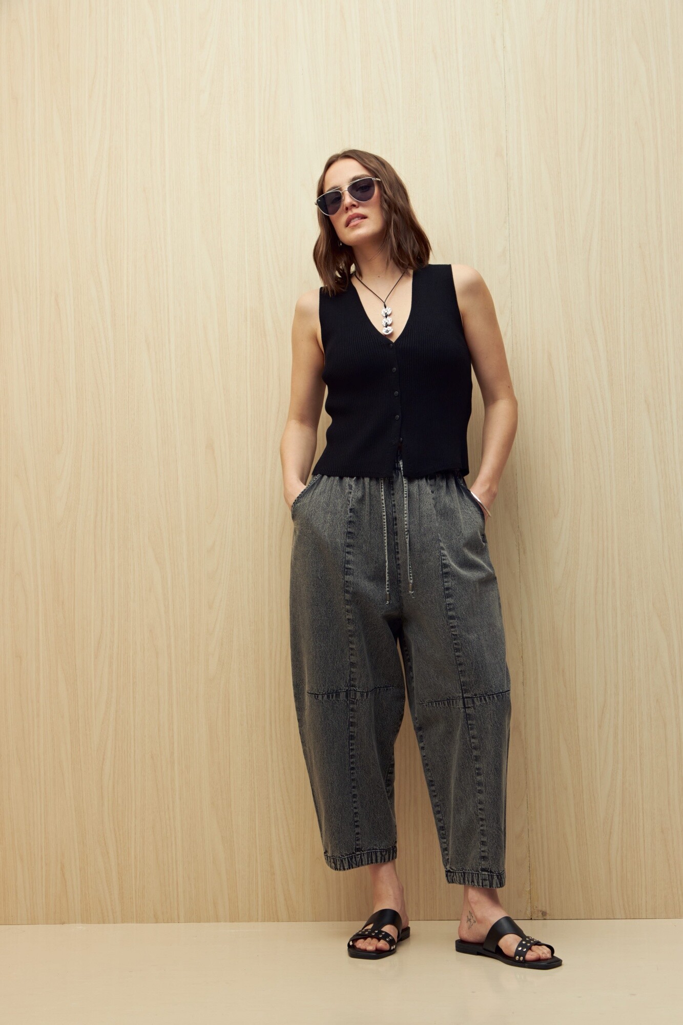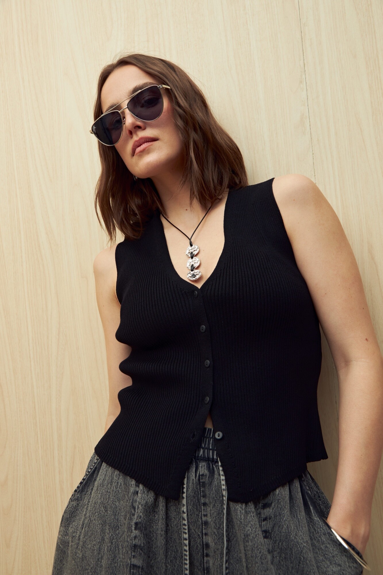 Chaleco tejido con escote en “V” y botones a tono. Su trama acanalada se adapta al cuerpo con suavidad, logrando una silueta femenina y actual. Perfecto para usar solo o como base en capas, es una pieza versátil que suma textura y estilo a cualquier look.