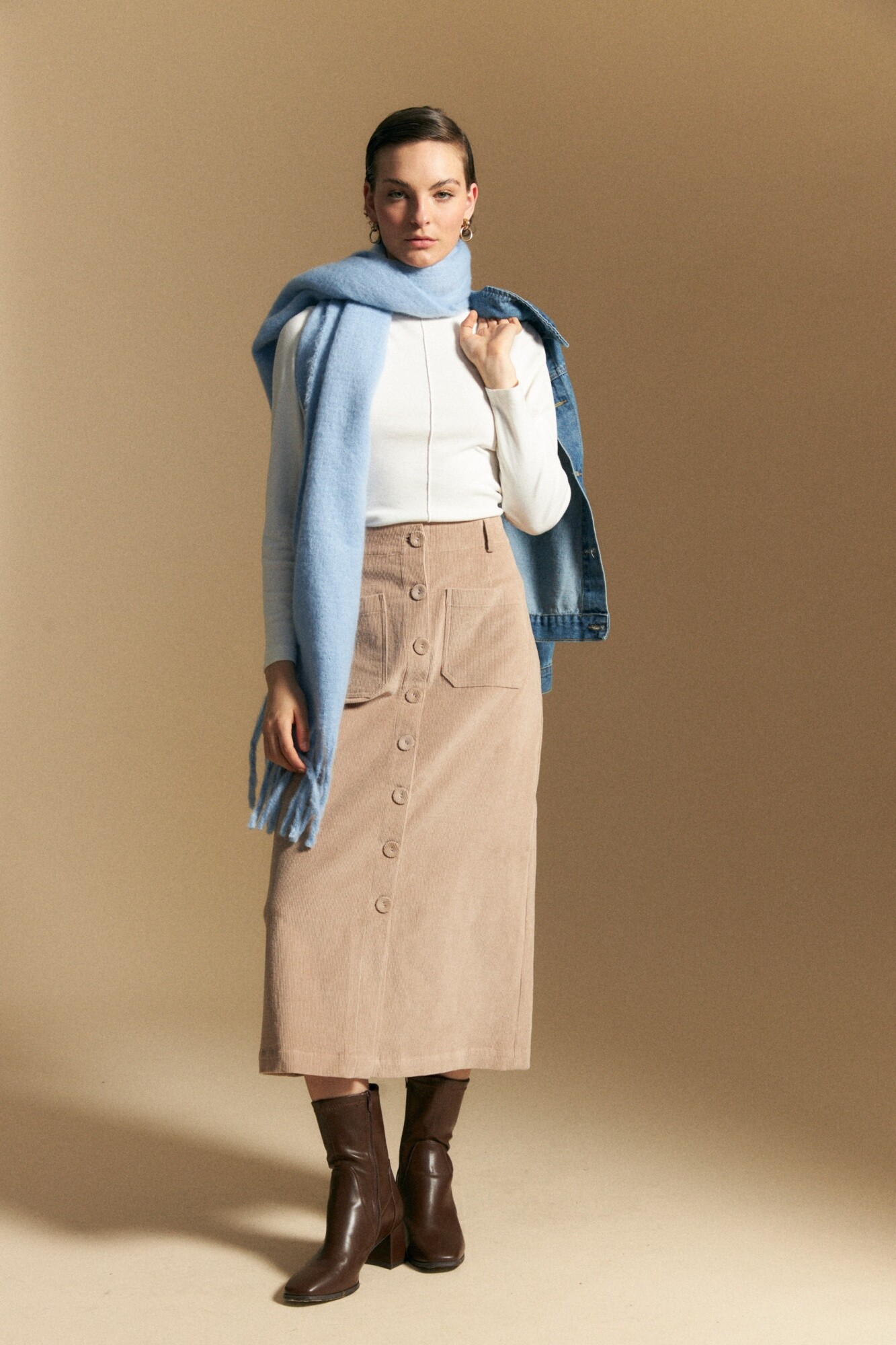 Maxifalda de pana de tiro alto que combina estructura y textura en una silueta femenina y actual. De largo midi y calce favorecedor, presenta abotonadura frontal y bolsillos aplicados que suman funcionalidad y un aire utilitario. Su tejido acanalado aporta cuerpo y carácter, ideal para acompañar looks de temporada con un toque trendy.