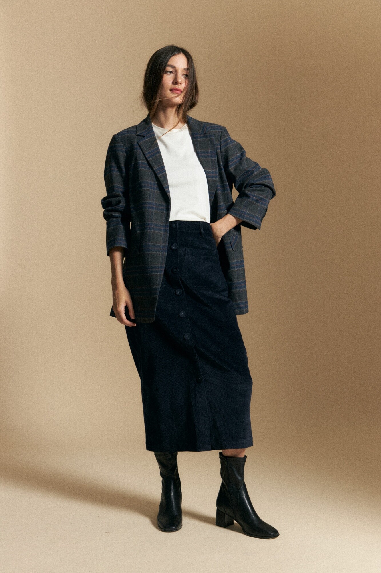 Maxifalda de pana de tiro alto que combina estructura y textura en una silueta femenina y actual. De largo midi y calce favorecedor, presenta abotonadura frontal y bolsillos aplicados que suman funcionalidad y un aire utilitario. Su tejido acanalado aporta cuerpo y carácter, ideal para acompañar looks de temporada con un toque trendy.