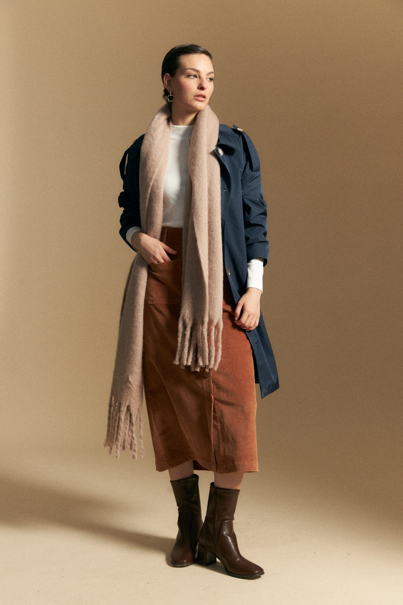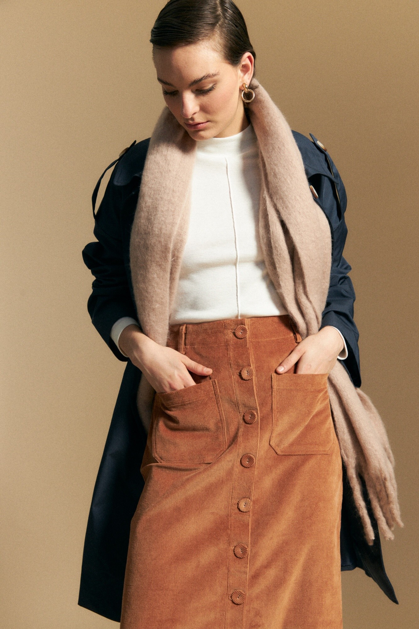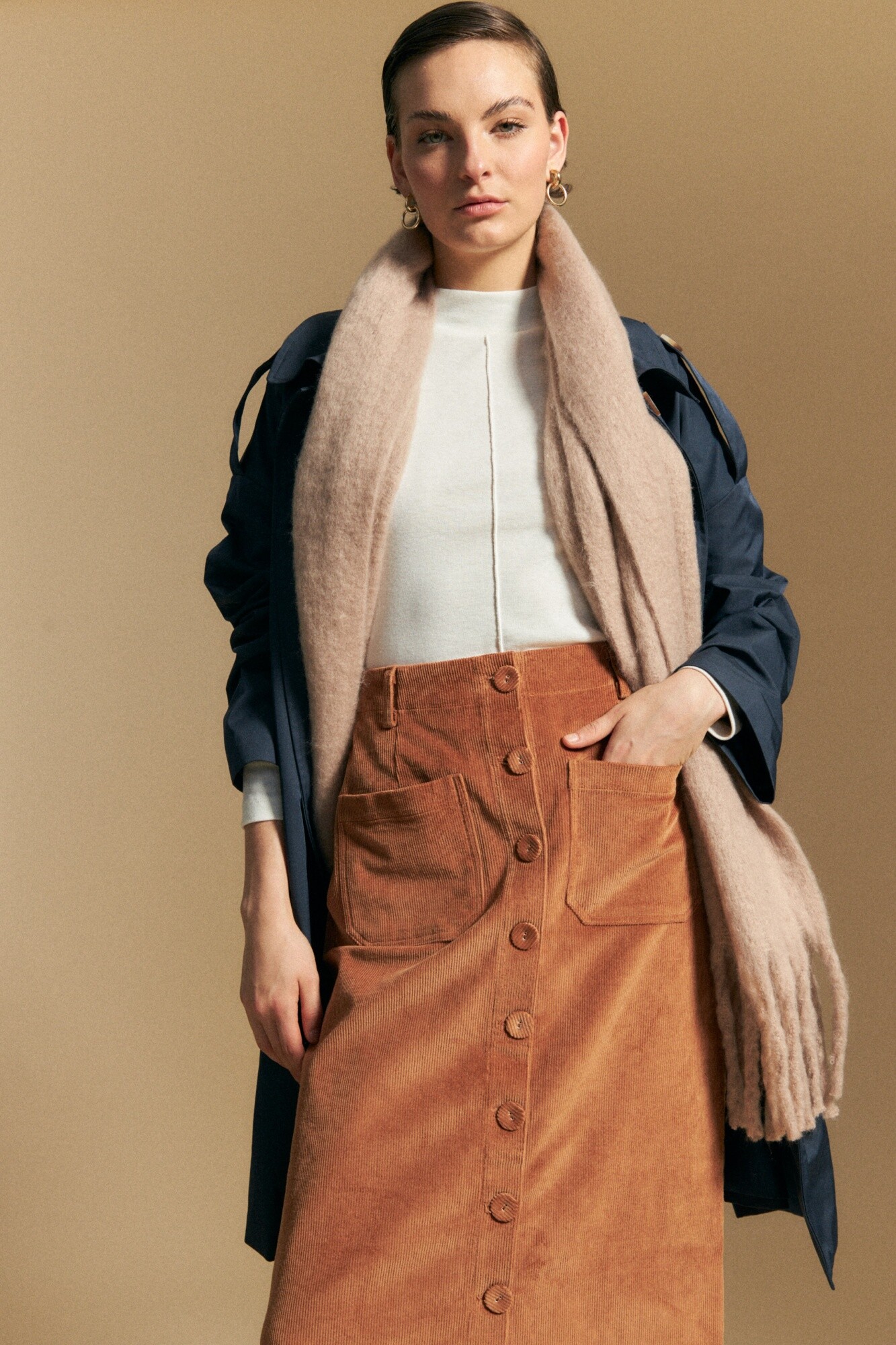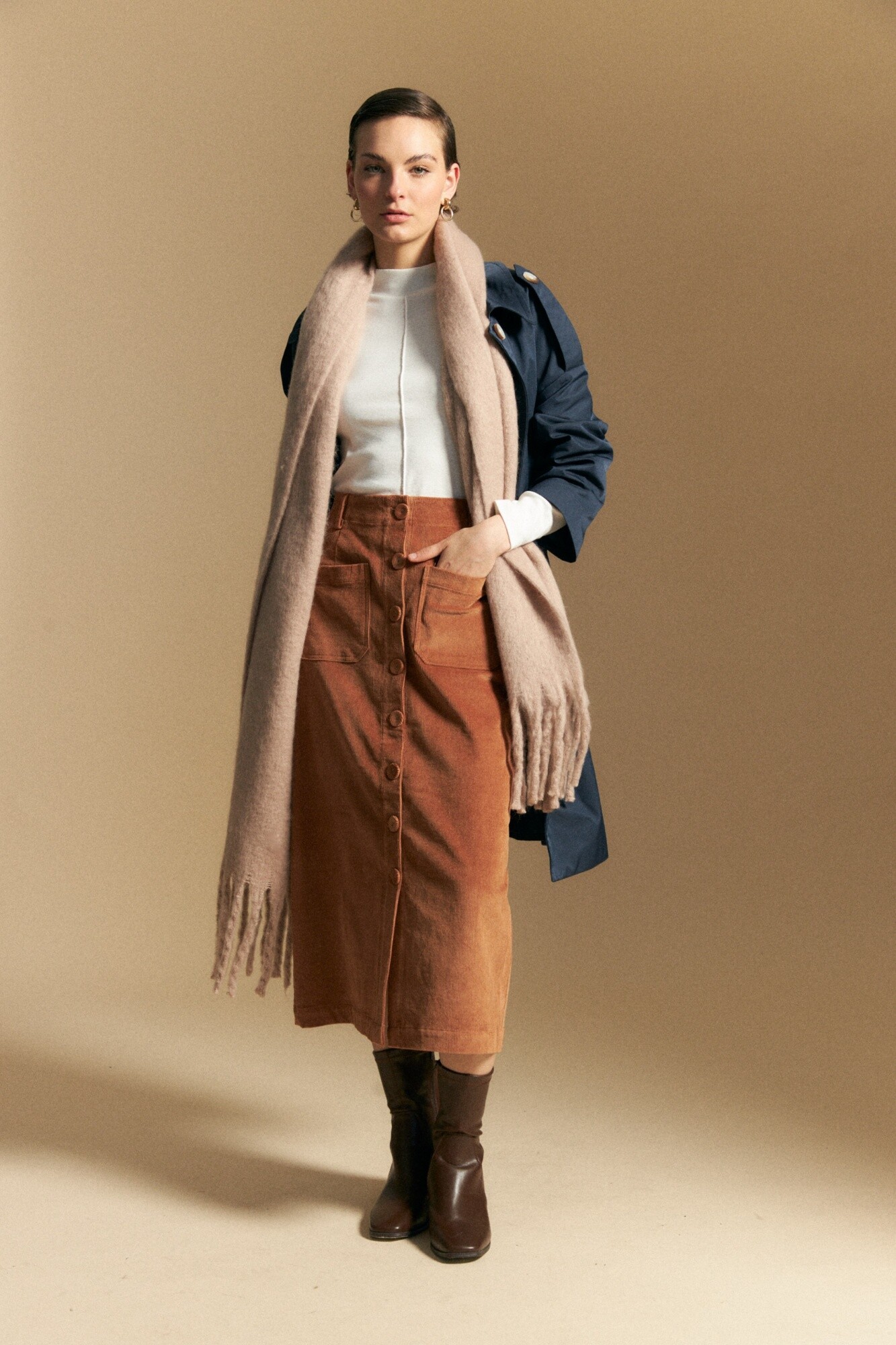Maxifalda de pana de tiro alto que combina estructura y textura en una silueta femenina y actual. De largo midi y calce favorecedor, presenta abotonadura frontal y bolsillos aplicados que suman funcionalidad y un aire utilitario. Su tejido acanalado aporta cuerpo y carácter, ideal para acompañar looks de temporada con un toque trendy.
