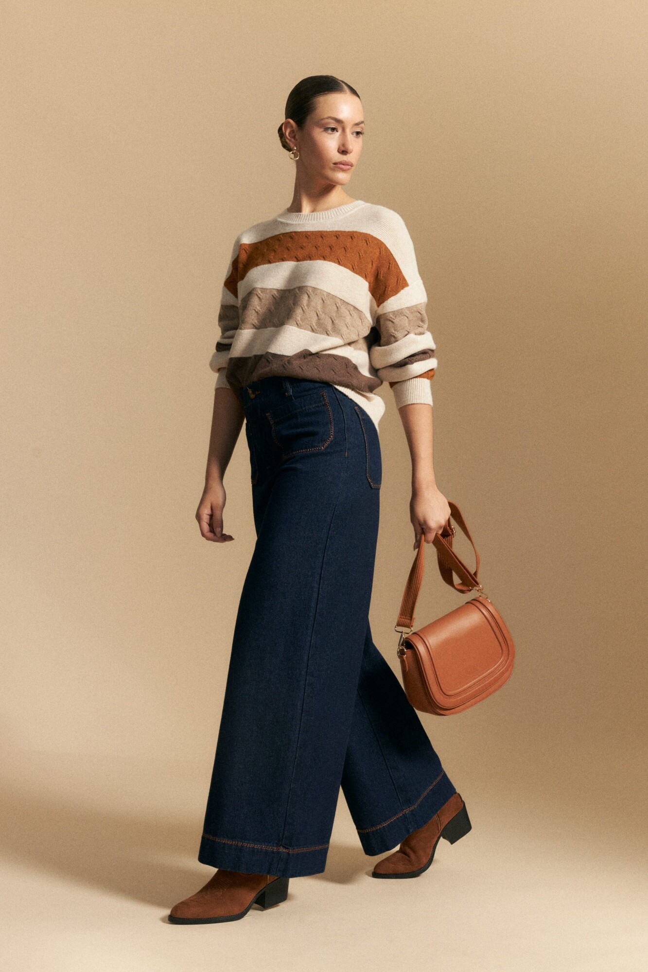 Jean wide leg de tiro alto que combina estructura y estilo en una silueta amplia y moderna. Su diseño se destaca por los delicados bordados en bolsillos delanteros, traseros y en el ruedo, detalles que aportan carácter y un toque distintivo a la prenda. El denim con leve elasticidad brinda comodidad y acompaña el movimiento, mientras que el calce amplio genera una caída elegante que estiliza la figura. Una pieza versátil que suma personalidad a looks cotidianos.