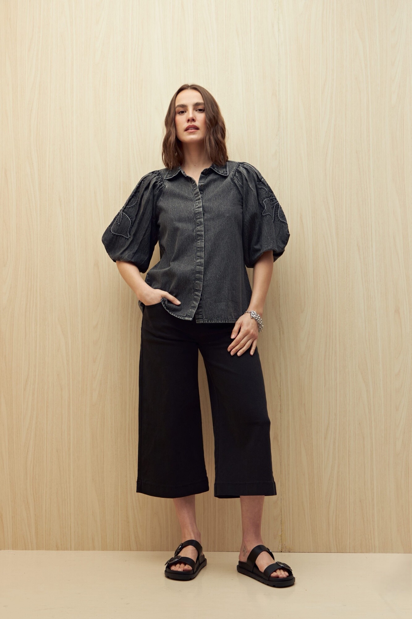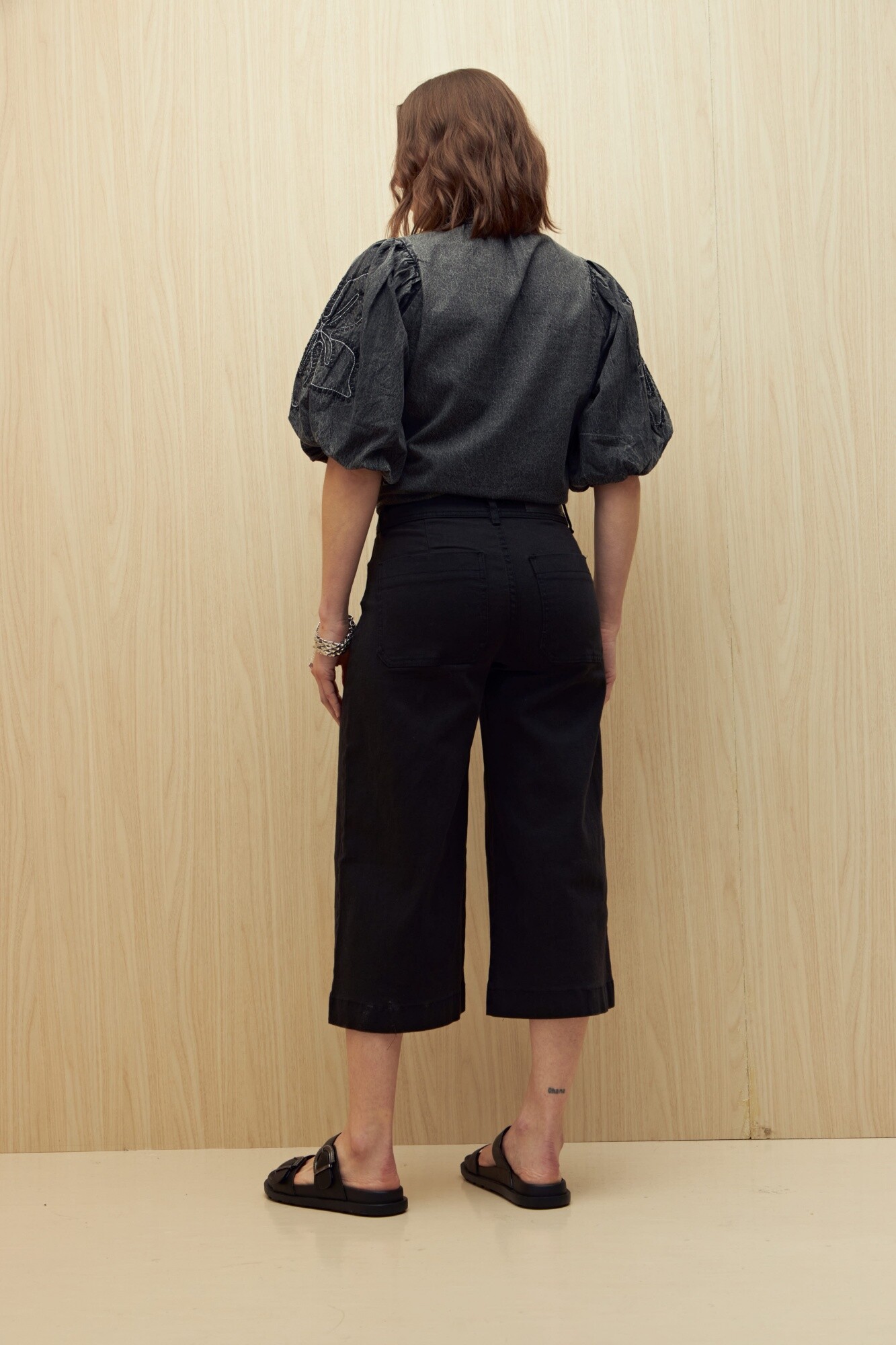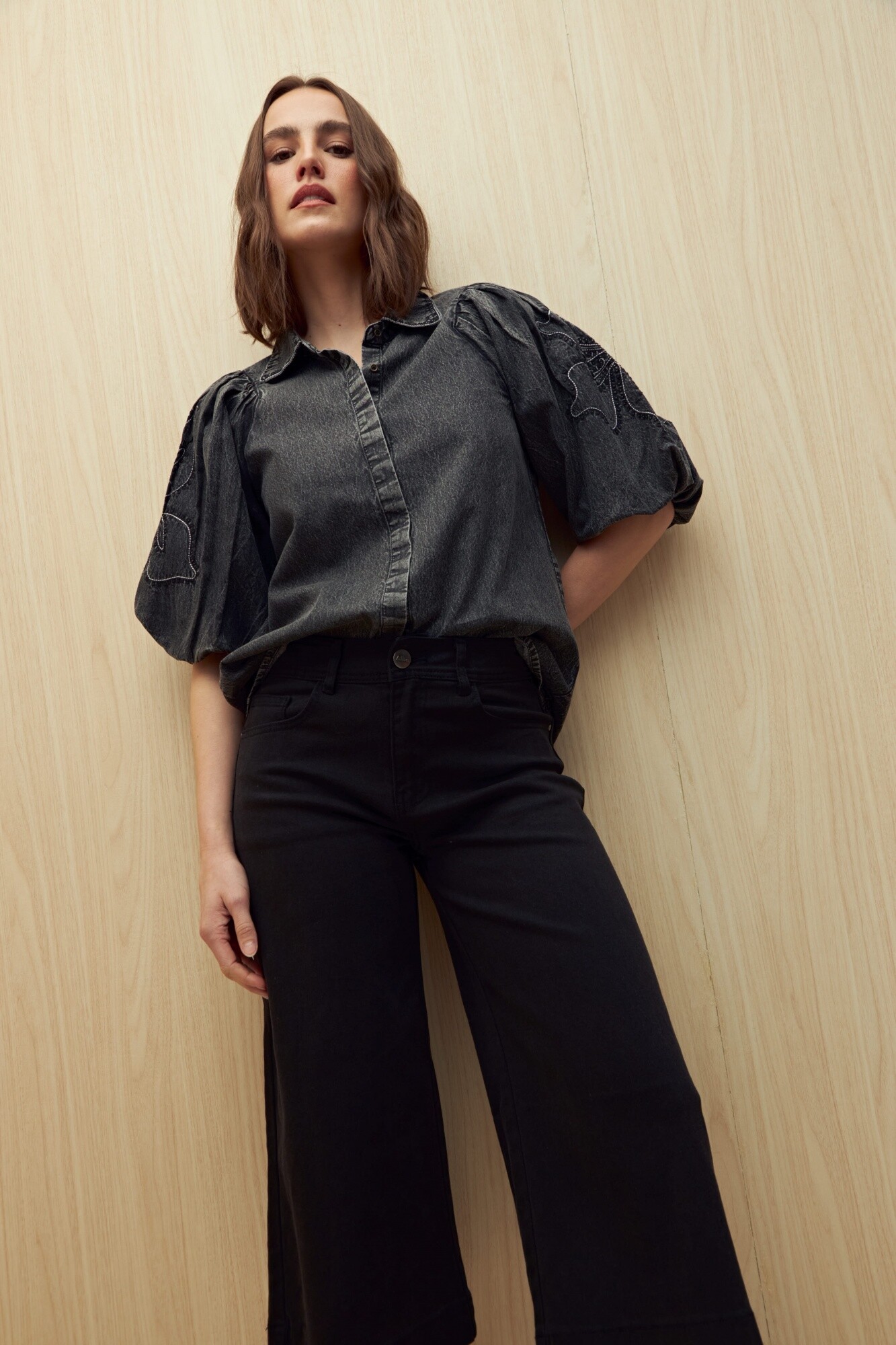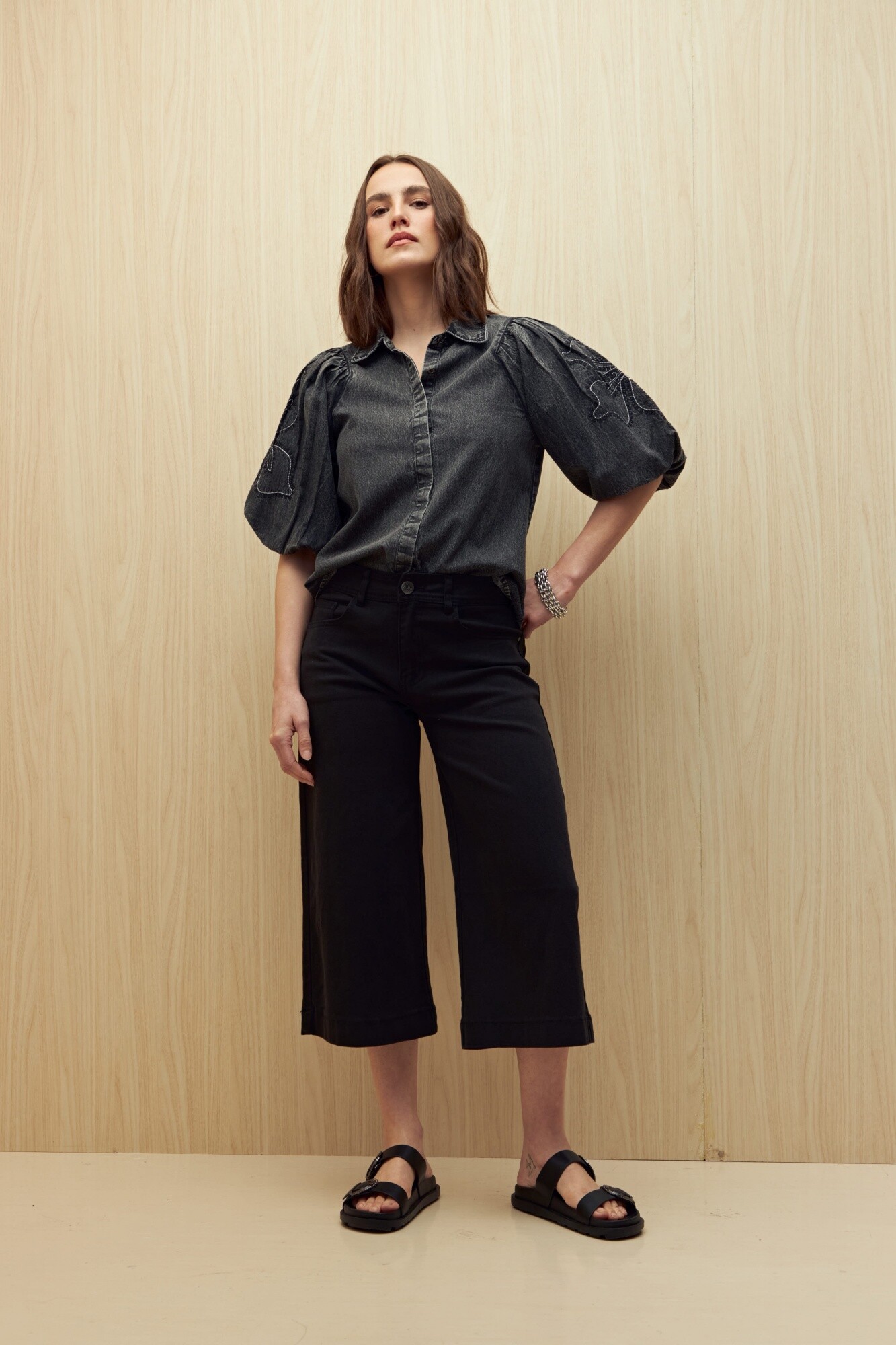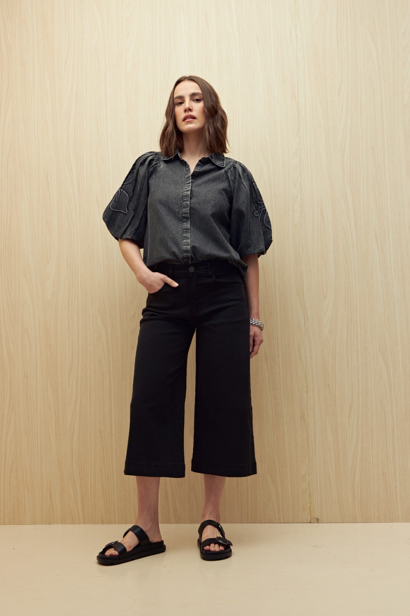 Jean de tiro medio con corte culotte, ancho y recto desde la cadera. Confeccionado en denim suave con un toque de elasticidad que aporta comodidad y libertad de movimiento. Su fit relajado y su largo cropped lo vuelven un aliado ideal para looks casuales y frescos.