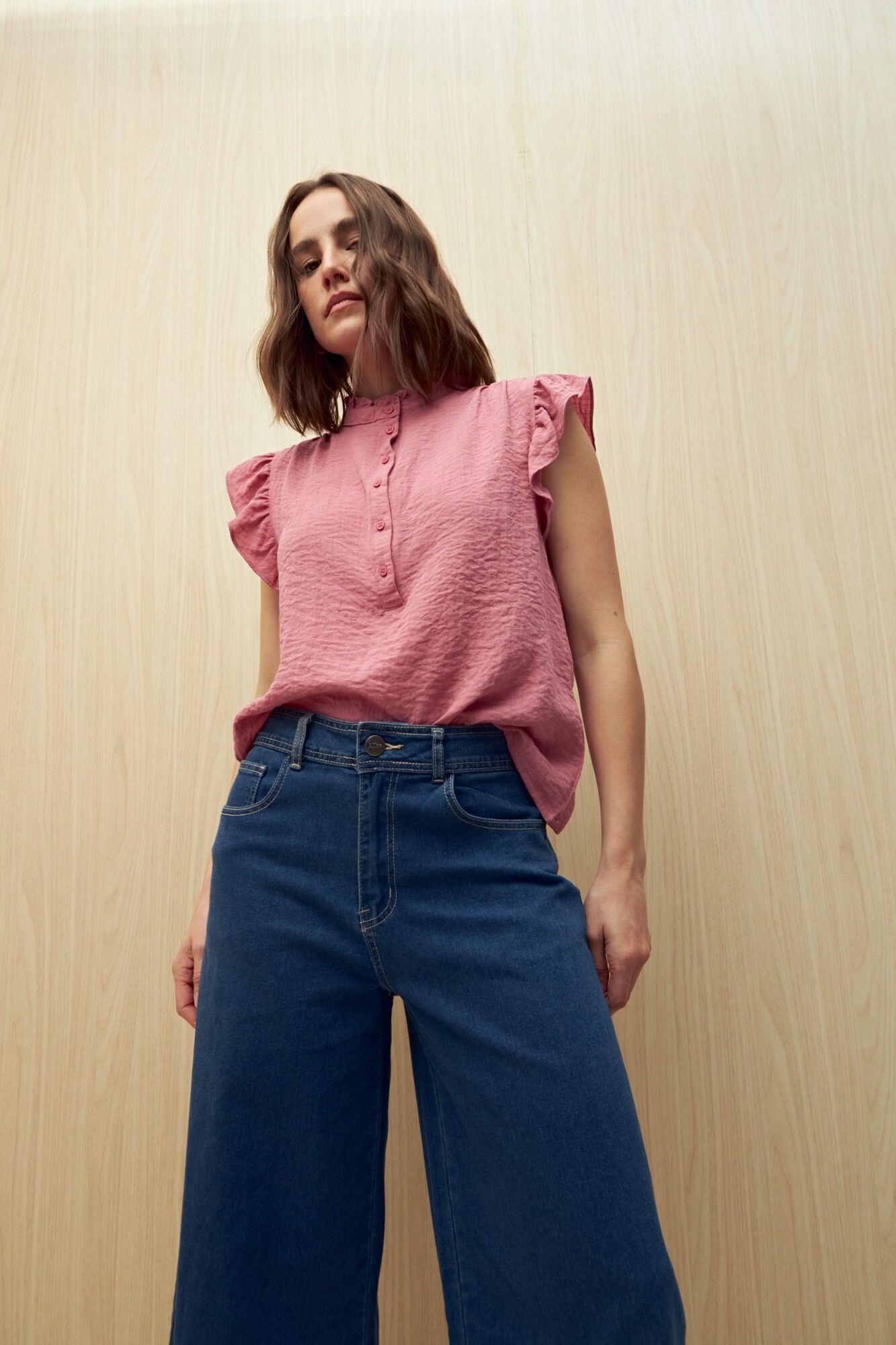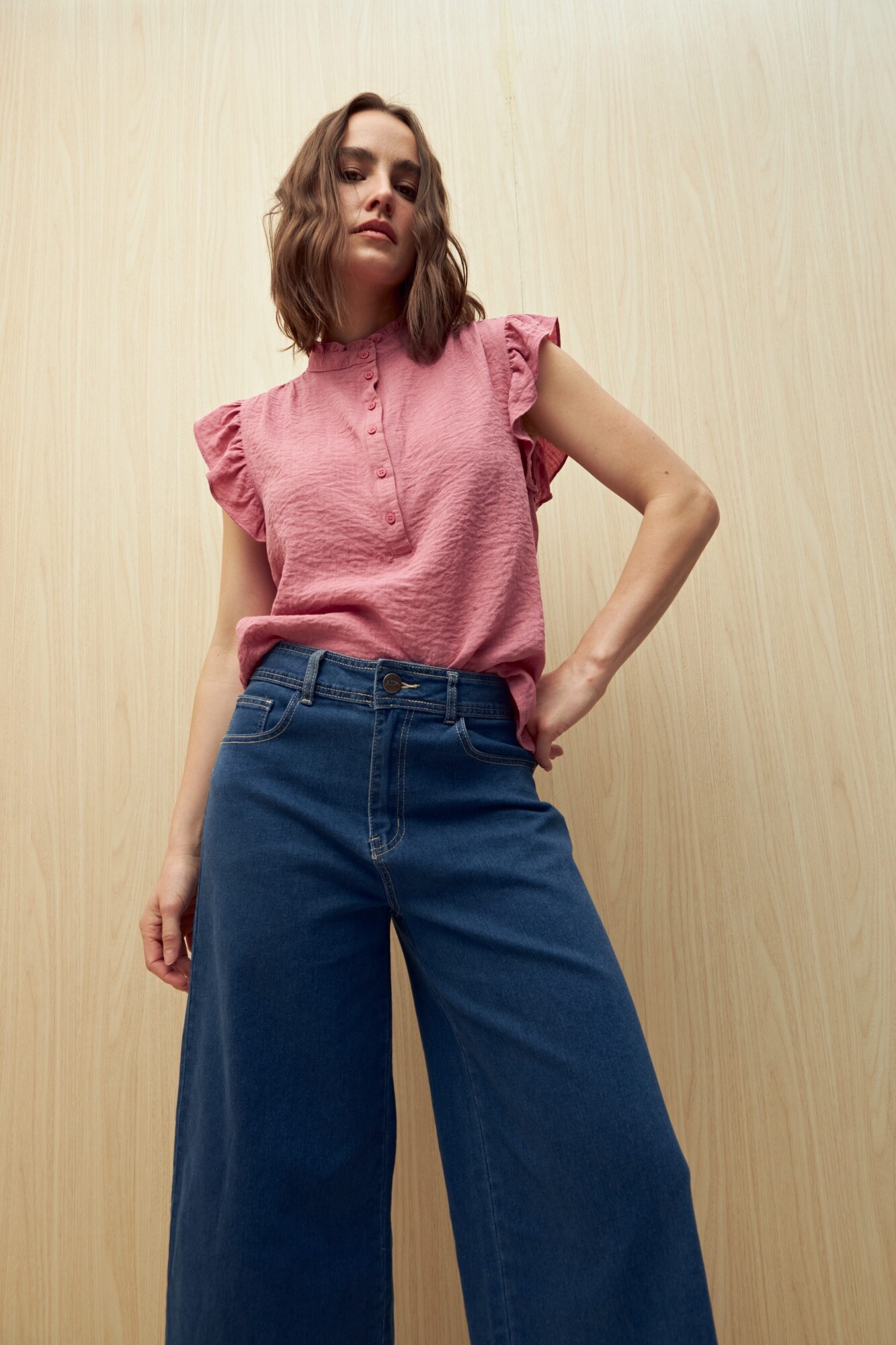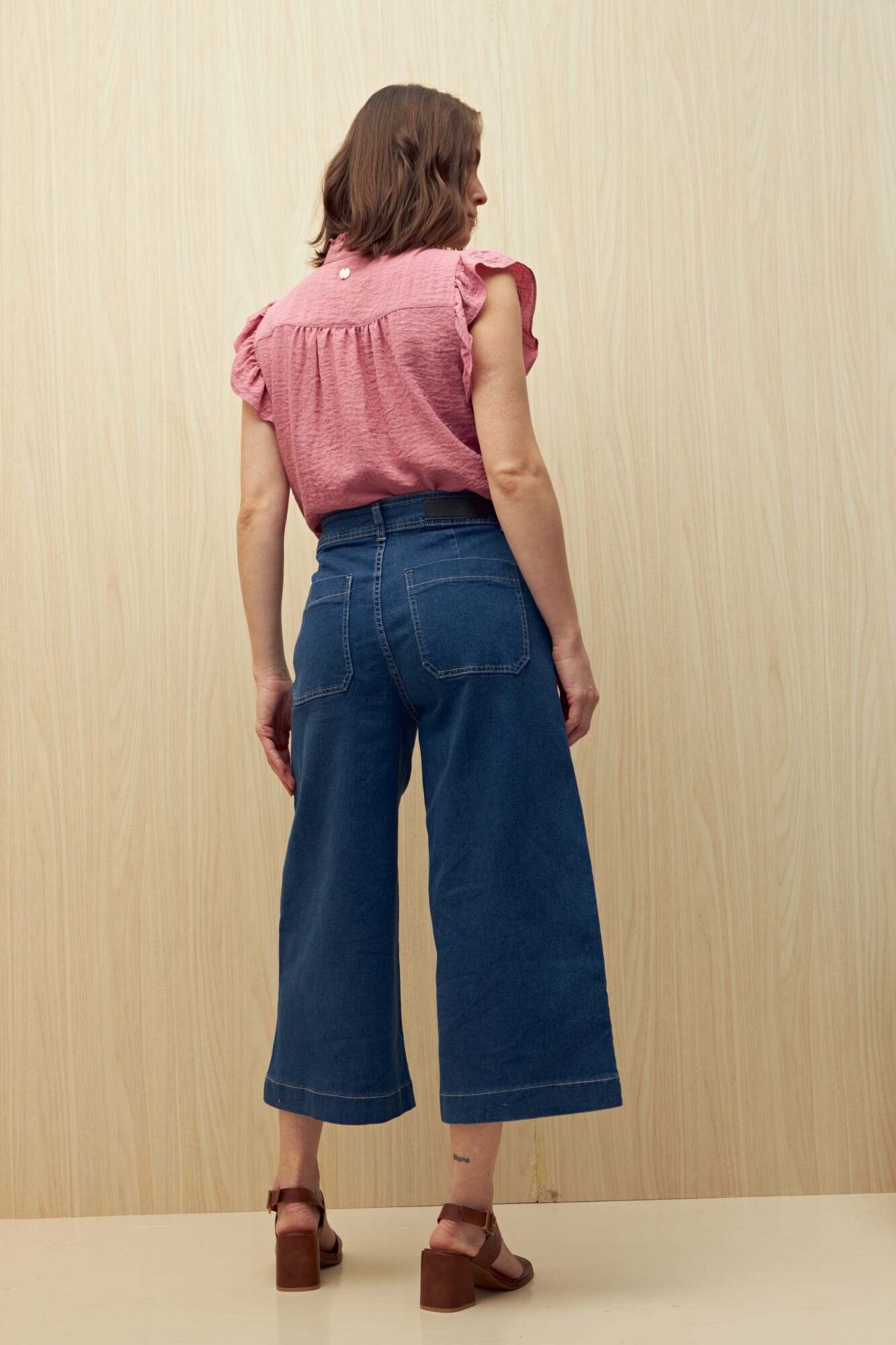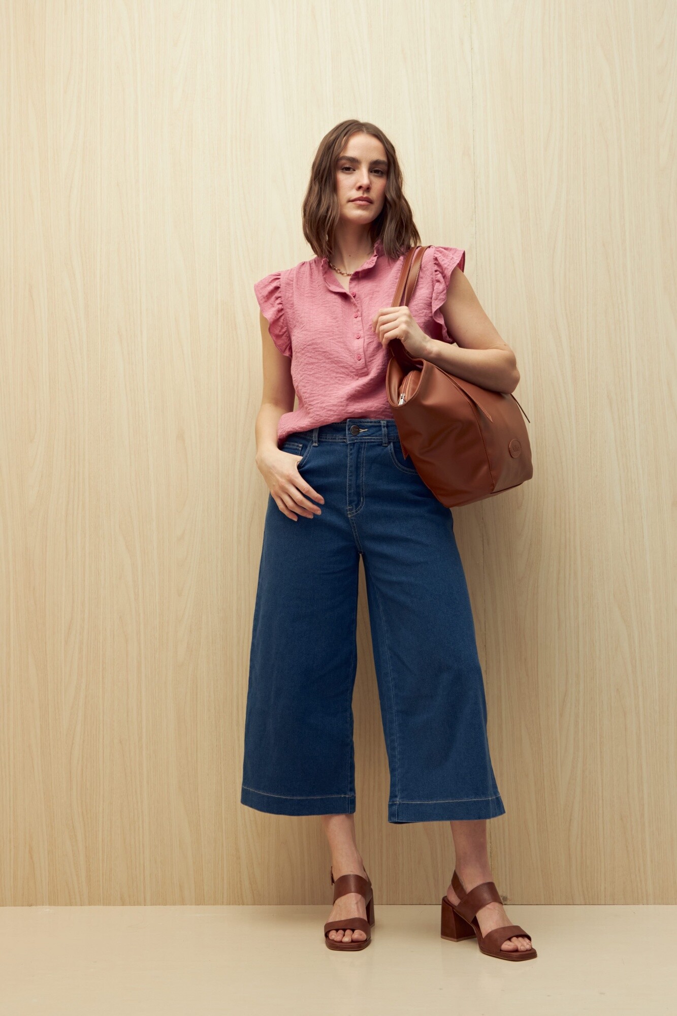 Jean de tiro medio con corte culotte, ancho y recto desde la cadera. Confeccionado en denim suave con un toque de elasticidad que aporta comodidad y libertad de movimiento. Su fit relajado y su largo cropped lo vuelven un aliado ideal para looks casuales y frescos.