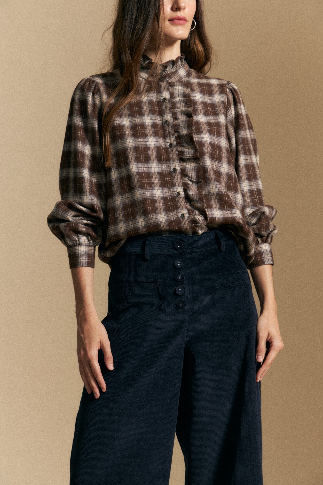 Pantalón de pana de tiro alto que combina estructura y caída en una silueta amplia y actual. De fit wide leg, presenta cintura definida con detalle de botones frontales que estilizan la figura y aportan un guiño retro. El tejido acanalado suma textura y profundidad, mientras que los bolsillos aplicados completan una propuesta versátil, ideal para looks tanto de oficina como más urbanos.