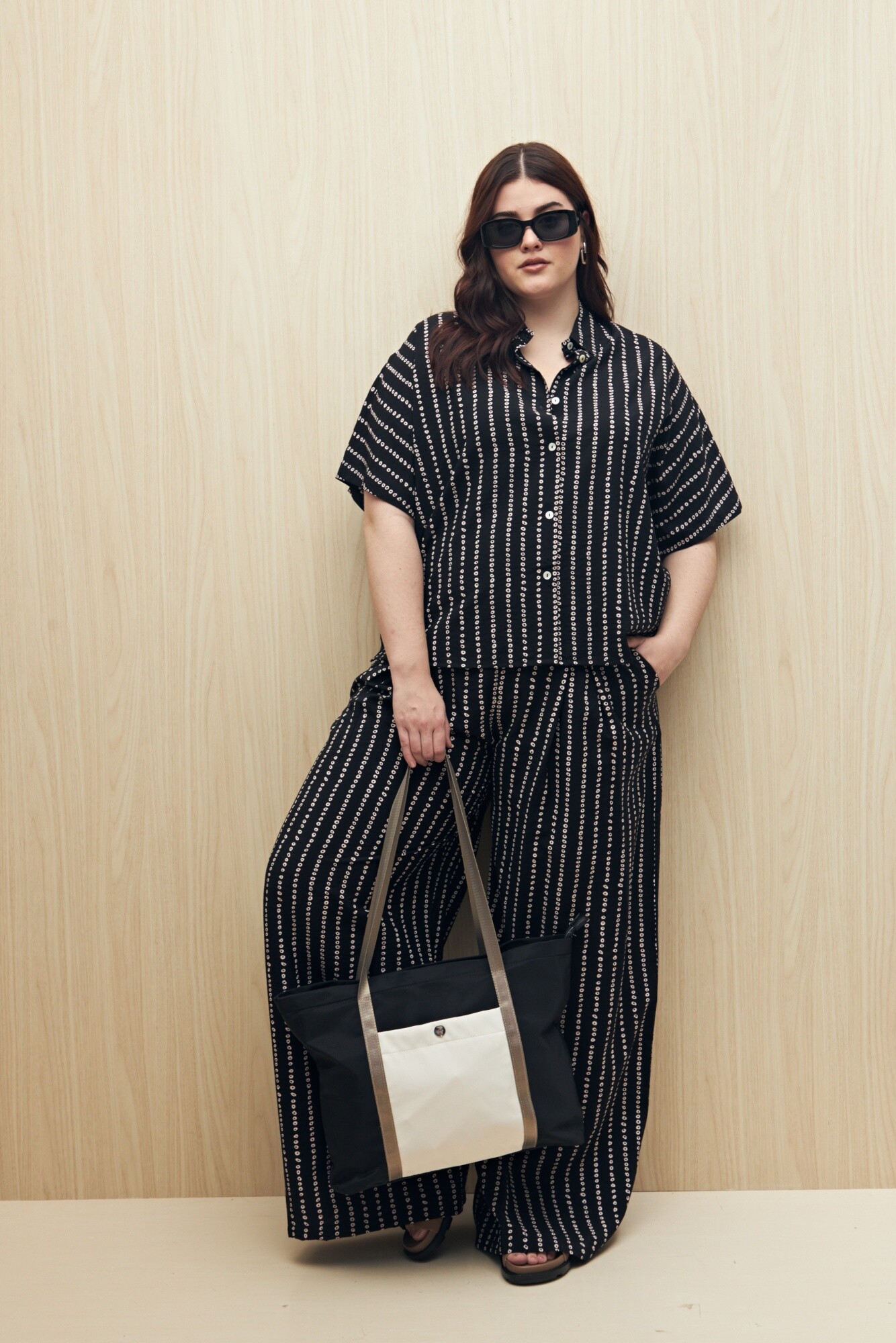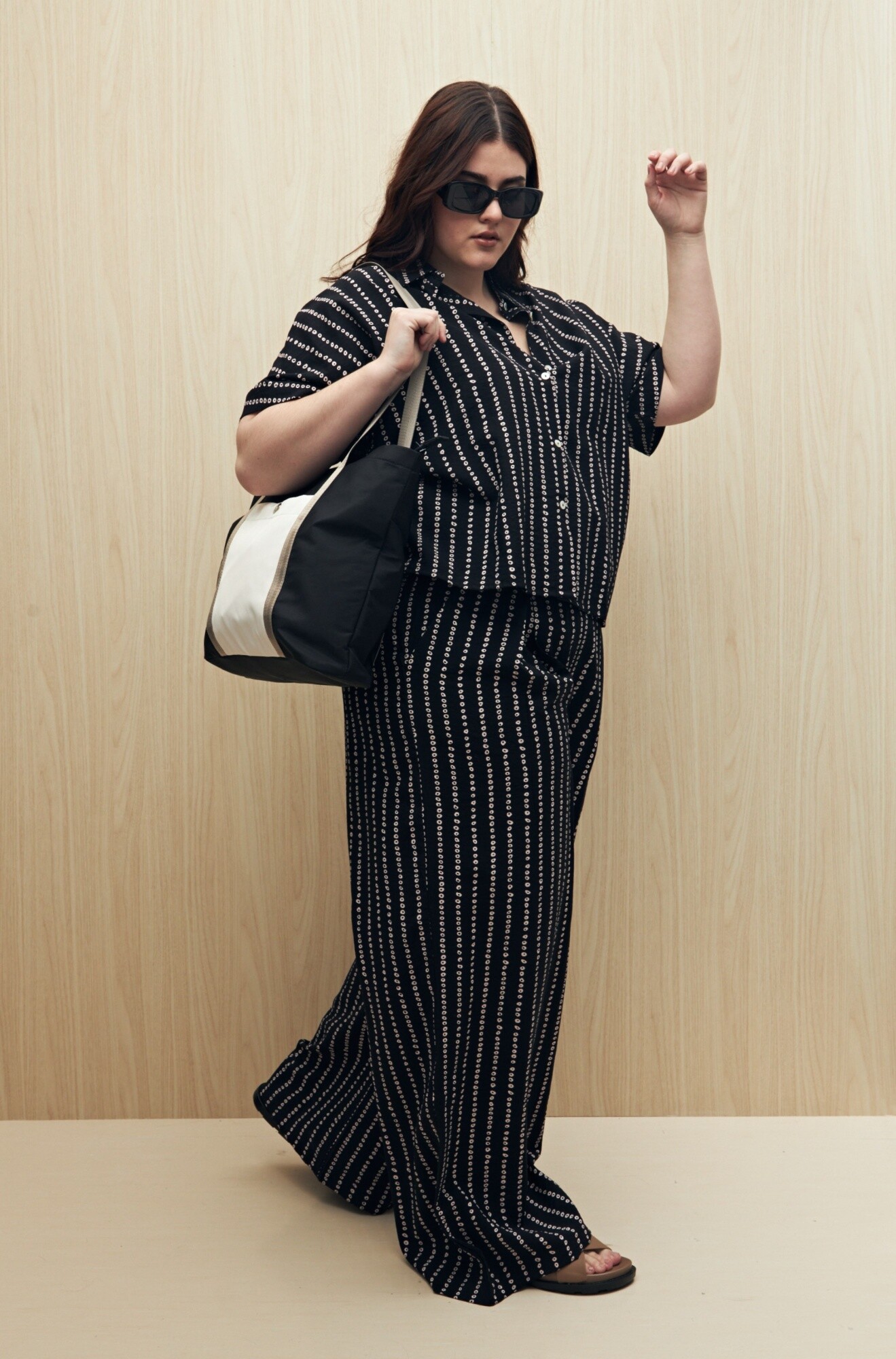 Pantalón ancho confeccionado en viscosa con caída fluida y textura liviana. Su silueta amplia y cintura elastizada lo hacen ideal para looks relajados o conjuntos coordinados con la camisa a juego. Un diseño cómodo y elegante, perfecto para el día o la noche.