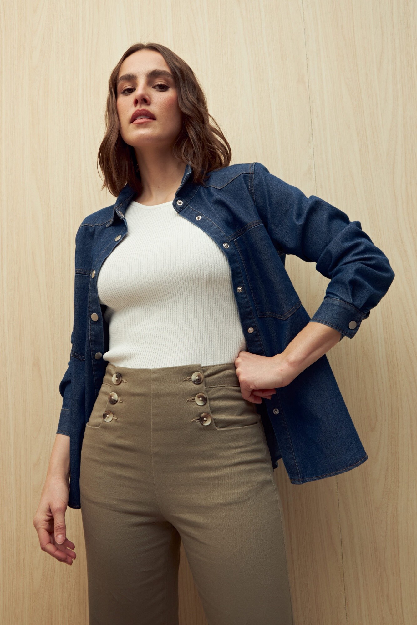 Pantalón ancho de tiro alto con un calce moderno y favorecedor, este pantalón de tiro alto se convierte en un esencial para looks urbanos y versátiles. Su silueta amplia estiliza y aporta comodidad, ideal para combinar tanto con tops ajustados como con blusas sueltas. Los botones veteados en el frente realzan la prenda con un detalle trendy que suma personalidad.