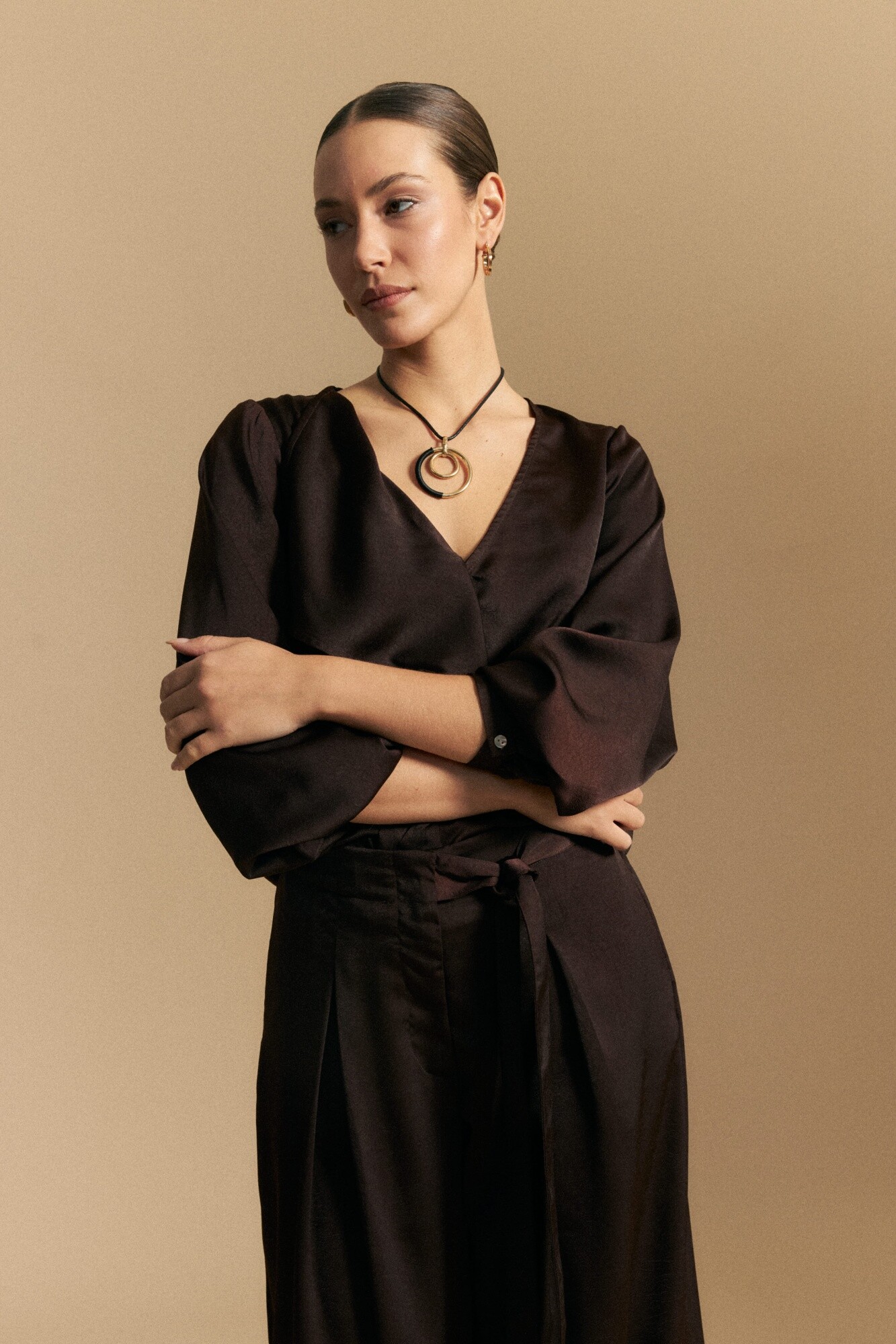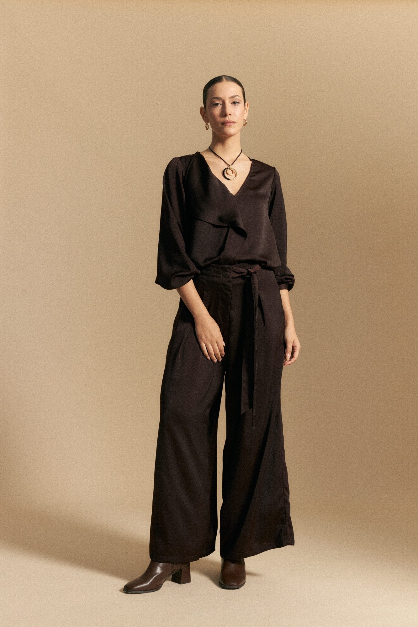 Pantalón ancho de tiro alto de silueta fluida y elegante, con pinzas en la cintura que aportan estructura y un calce prolijo. Presenta cinto incorporado, un detalle funcional que suma definición y refuerza su estética cuidada. Pensado para acompañar tanto looks de oficina como estilismos de noche, es una prenda versátil que se adapta con facilidad a distintos contextos y eleva cualquier look según cómo se combine.