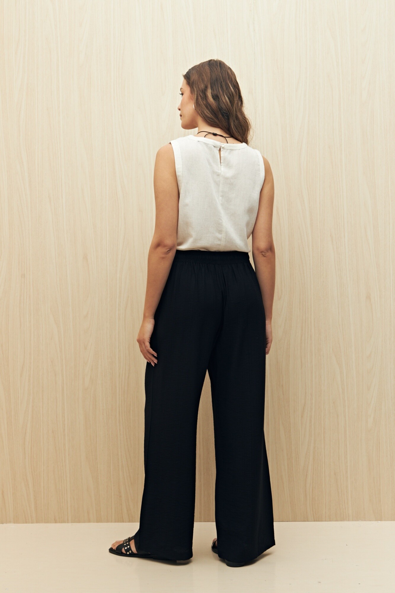 Relajado y con movimiento, este pantalón se destaca por su caída liviana y textura fluida. De cintura elástica con lazo regulable, ofrece un calce cómodo que se adapta a distintos estilos y ocasiones. Su silueta amplia lo convierte en una prenda versátil.