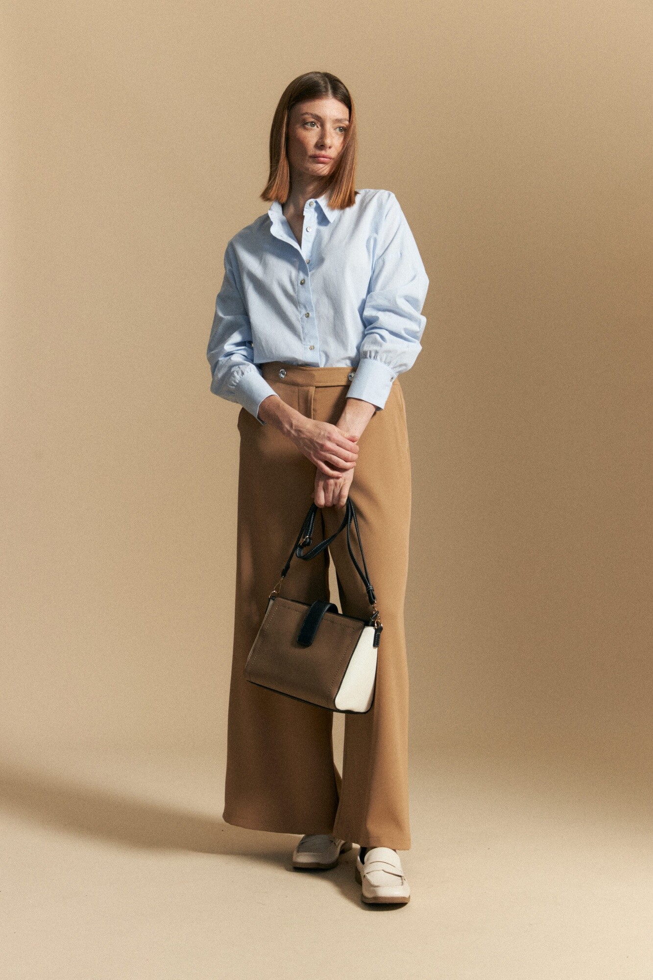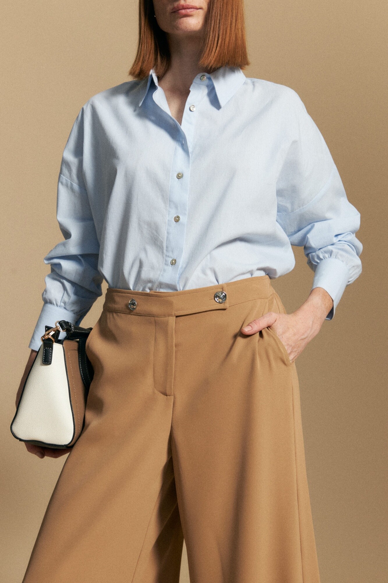 Pantalón ancho de calce cómodo y silueta fluida, diseñado con cintura elastizada que aporta confort sin perder una estética prolija. Presenta pretina ancha con botones metalizados irregulares, un detalle distintivo que suma diseño y carácter a la prenda. Su estructura liviana y versátil lo convierte en una opción ideal para looks de office, estilismos de día o propuestas de after office, adaptándose con facilidad a distintos contextos.