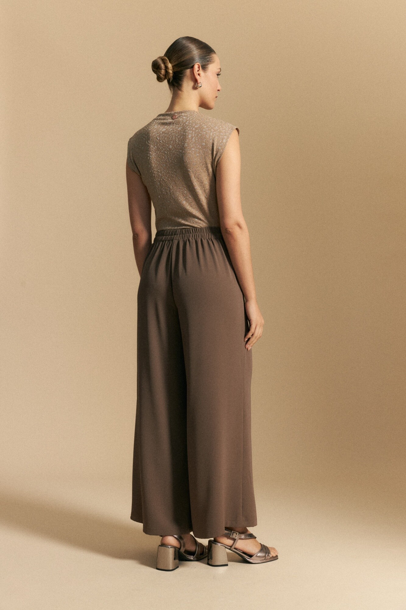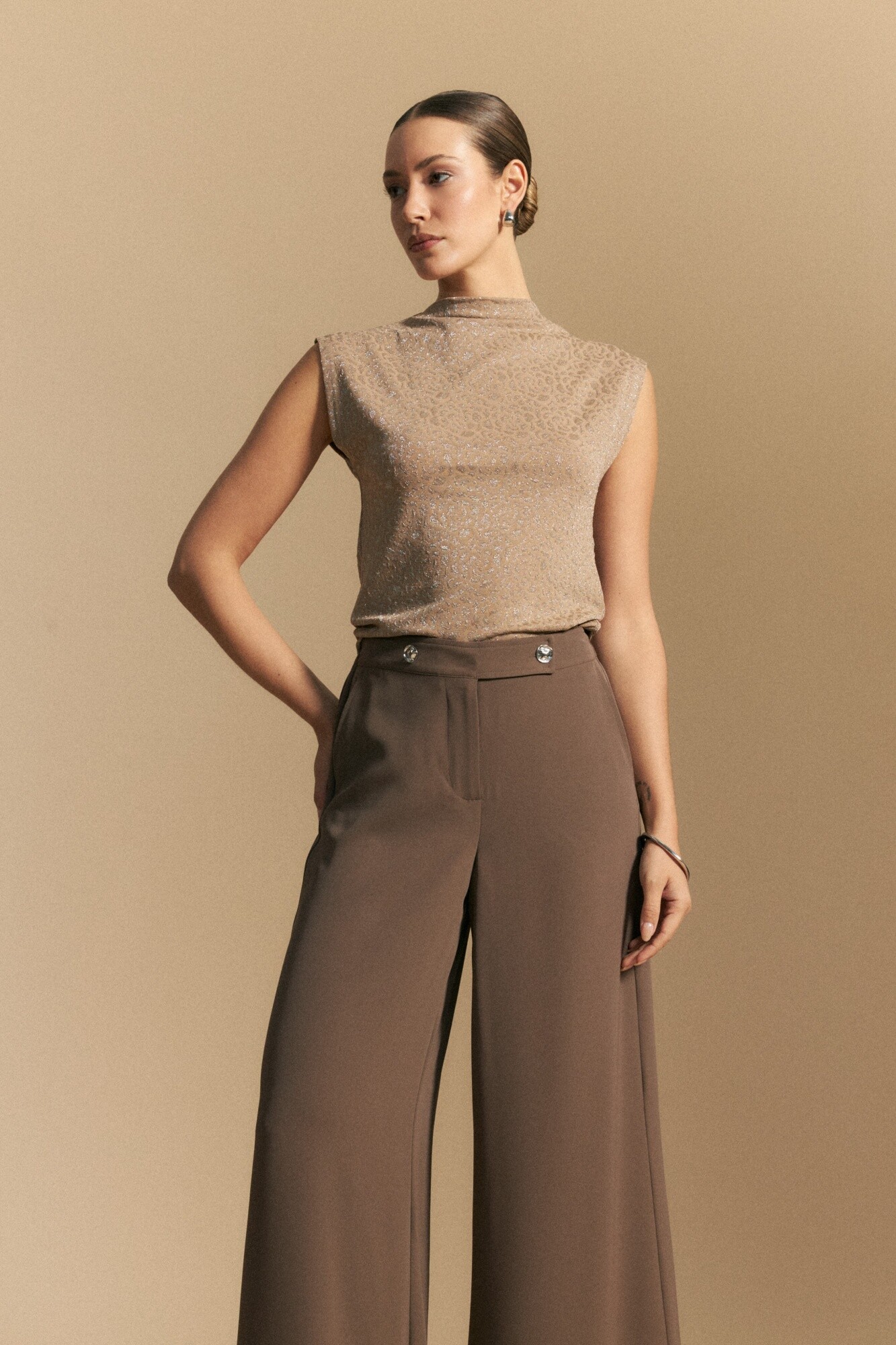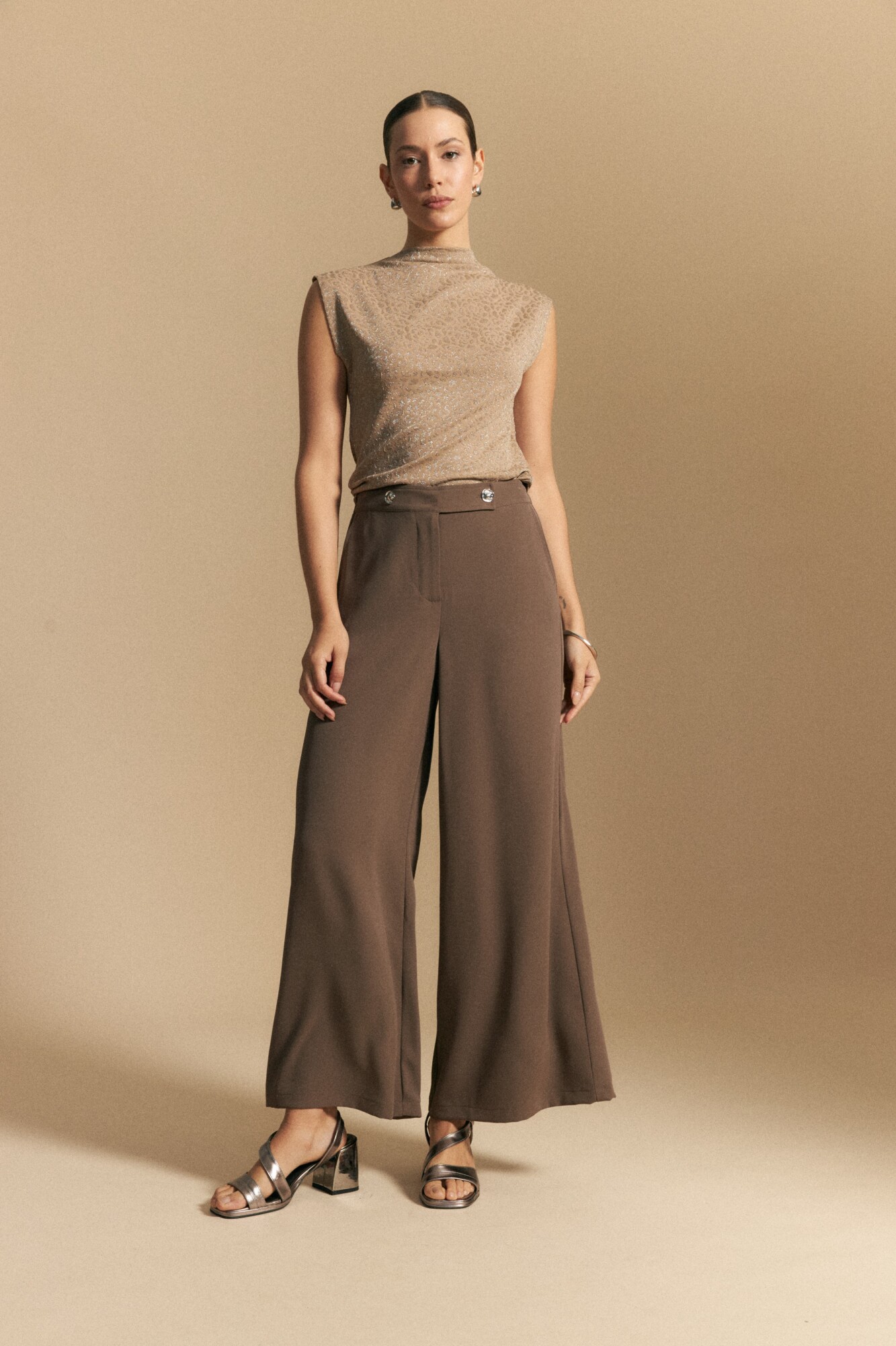 Pantalón ancho de calce cómodo y silueta fluida, diseñado con cintura elastizada que aporta confort sin perder una estética prolija. Presenta pretina ancha con botones metalizados irregulares, un detalle distintivo que suma diseño y carácter a la prenda. Su estructura liviana y versátil lo convierte en una opción ideal para looks de office, estilismos de día o propuestas de after office, adaptándose con facilidad a distintos contextos.