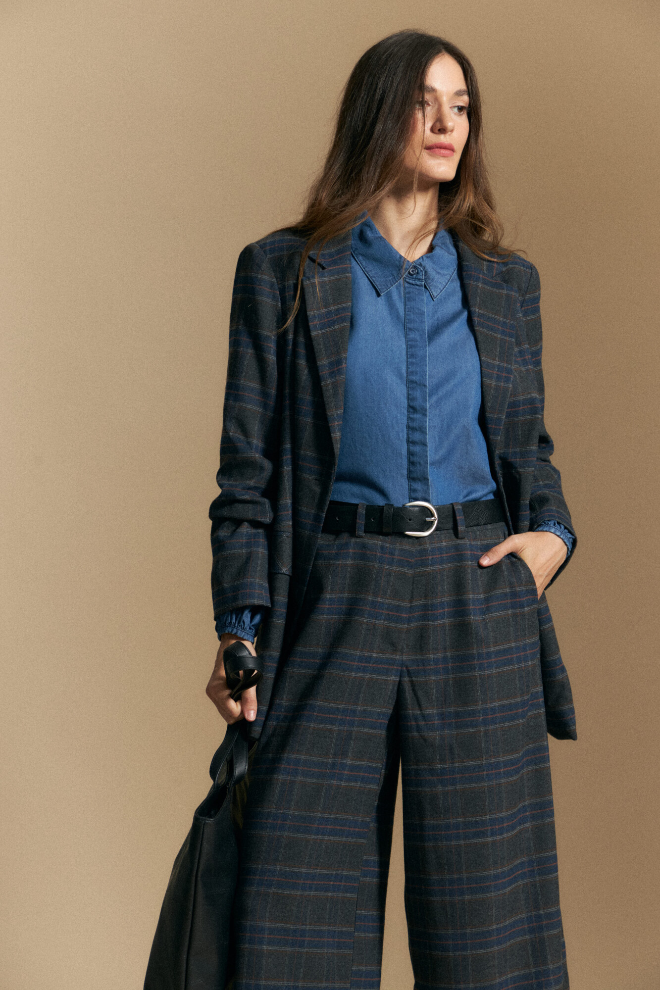 Pantalón a cuadros de tiro alto que reinterpreta el tailoring clásico con una silueta amplia y actual. De calce wide leg, presenta líneas limpias y caída fluida que estiliza la figura, mientras el diseño a cuadros suma un guiño atemporal y versátil. Ideal para armar looks tanto de oficina como más relajados, adaptándose con facilidad a distintas combinaciones.