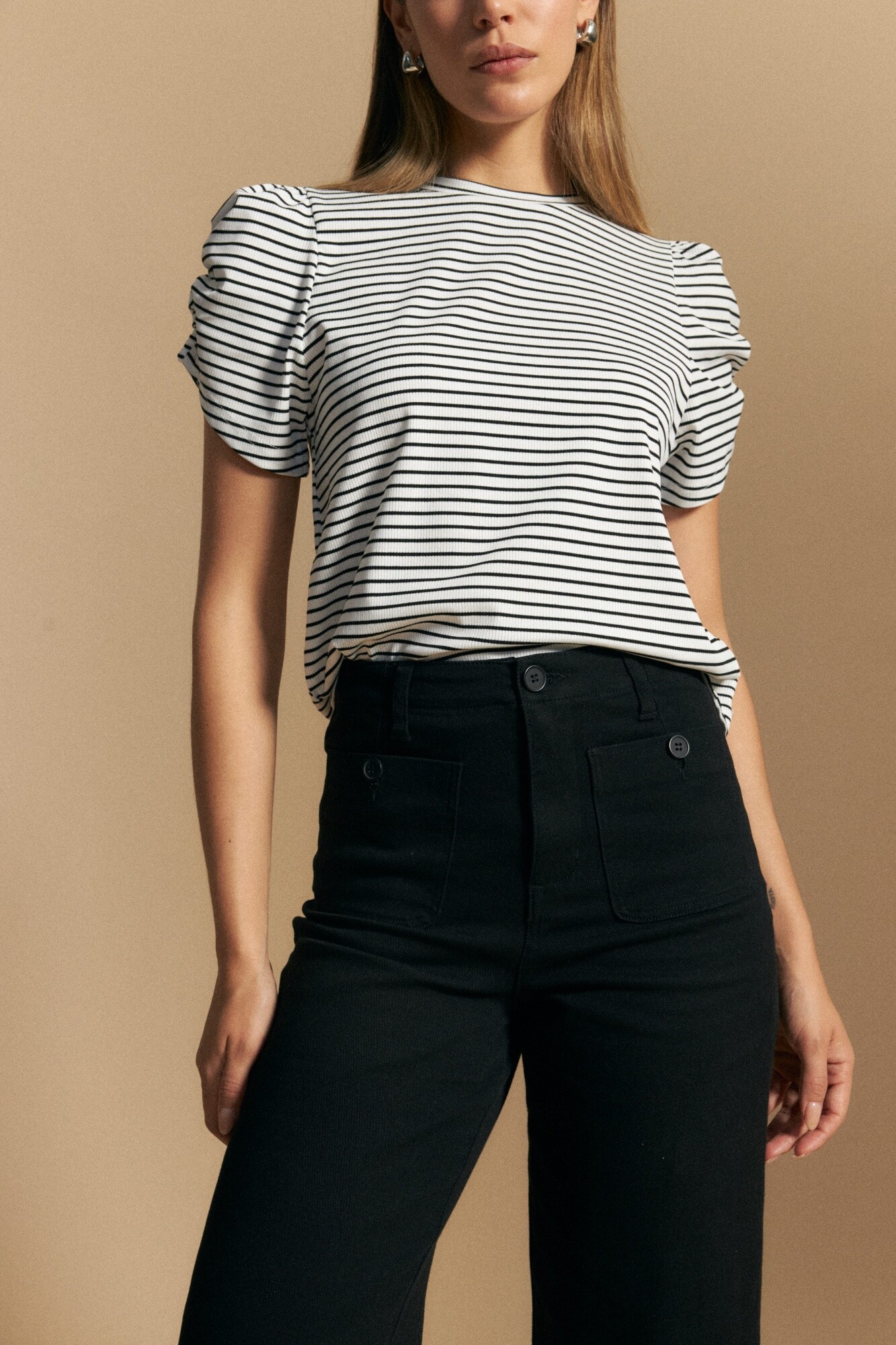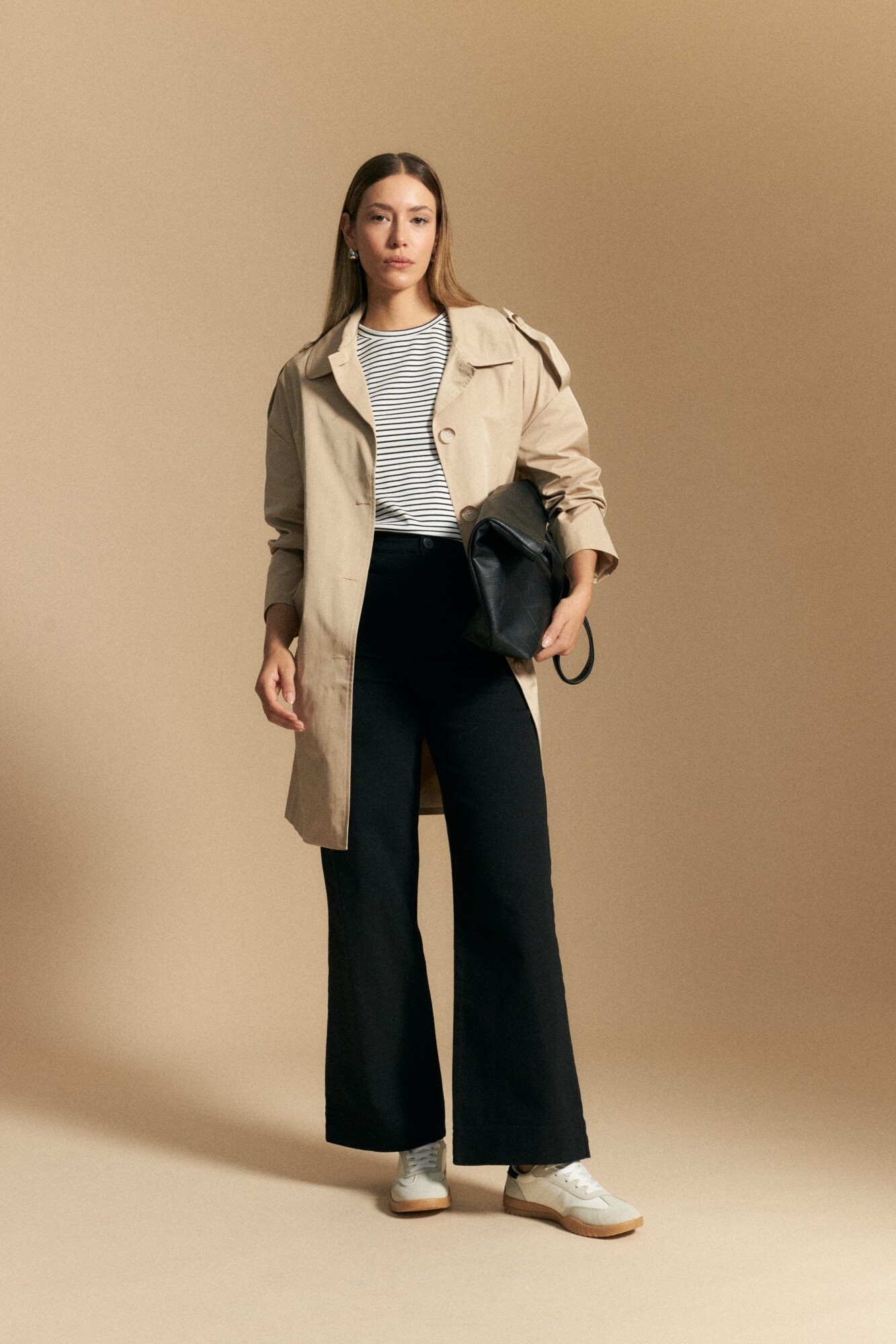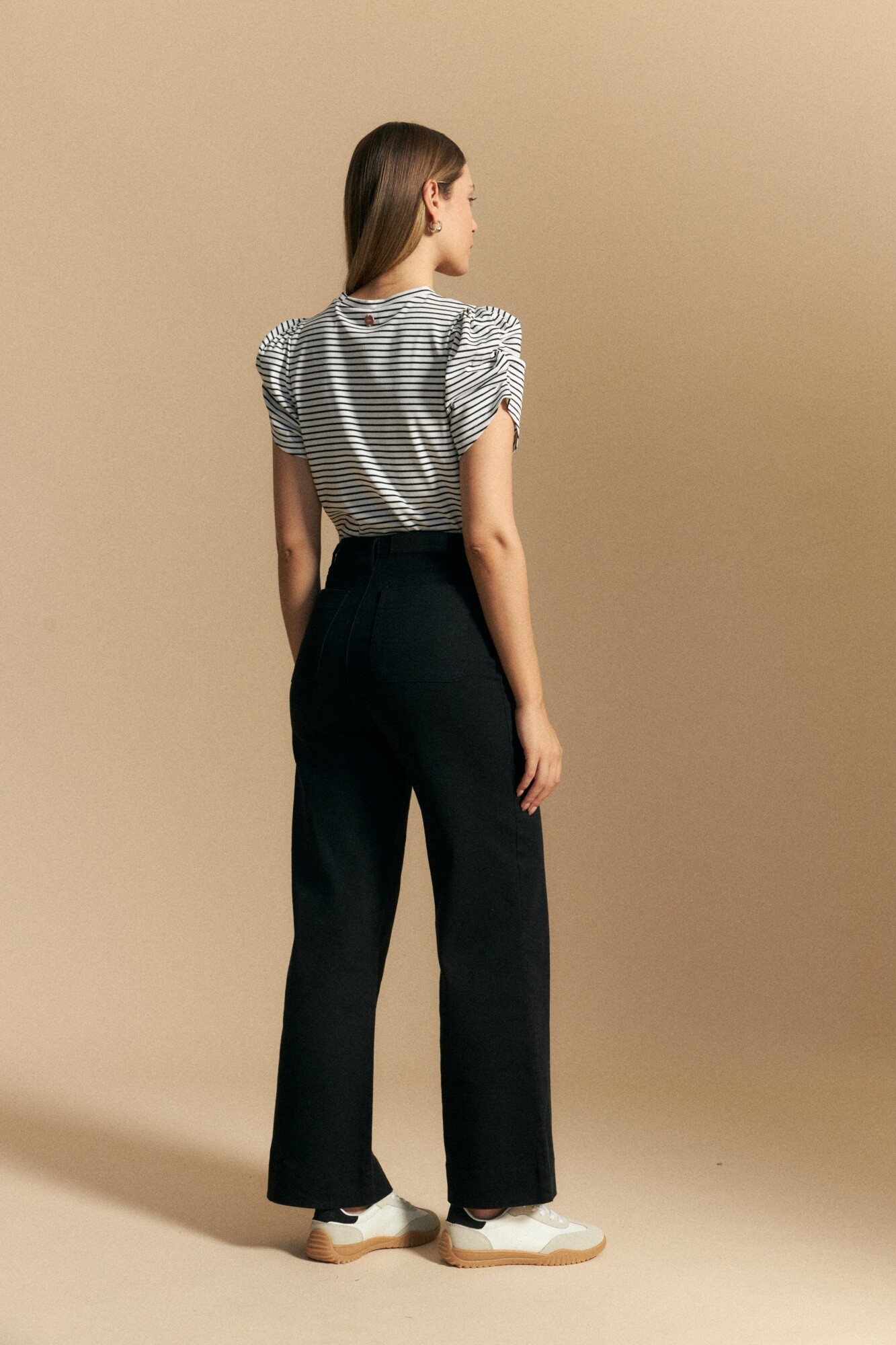 Pantalón de fit recto y tiro alto, diseñado para lograr una silueta limpia y bien definida. La estructura acompaña la pierna de forma pareja, sin ajustarse, mientras que el tiro alto aporta sostén y realce en la cintura. Confeccionado en algodón con elastano, ofrece comodidad, flexibilidad y un calce que se mantiene impecable a lo largo del uso. Un básico funcional, fácil de integrar a looks relajados o más armados según cómo se combine.