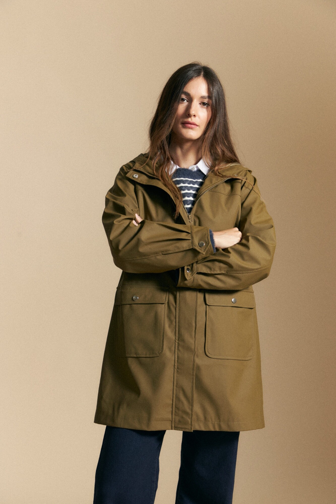 Pilot de largo medio con diseño funcional y líneas limpias, inspirado en prendas clásicas del outerwear que atraviesan temporadas sin perder vigencia. Presenta capucha integrada, cierre frontal oculto y bolsillos aplicados con tapa, aportando practicidad y un look urbano cuidado. Su silueta recta lo convierte en una prenda versátil, ideal para acompañar looks cotidianos y elevar estilismos más relajados con un aire atemporal y moderno.
