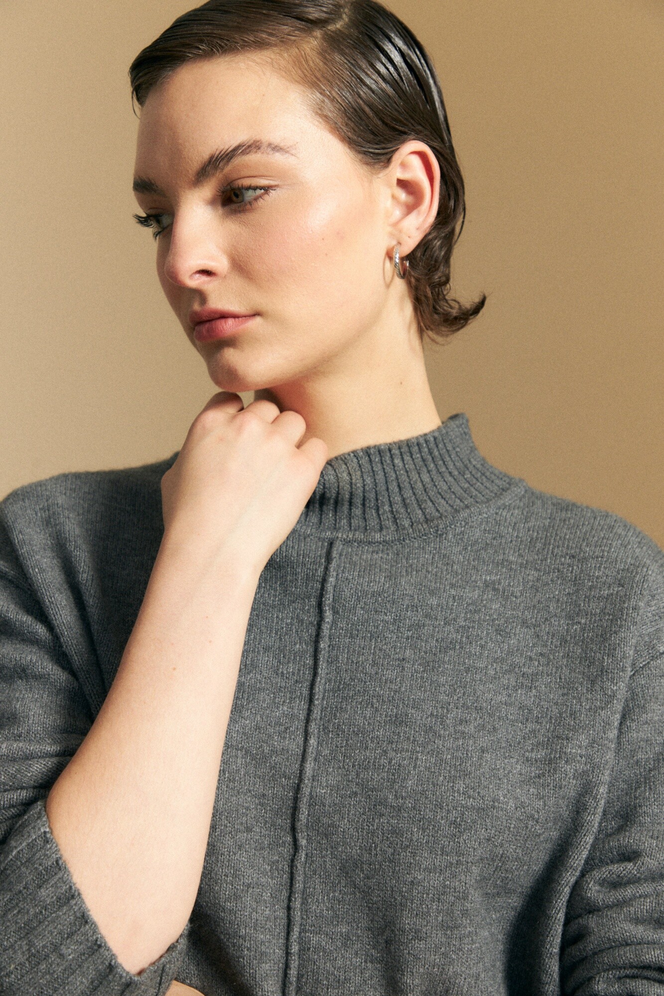 Polera tejida de textura suave y confortable, con cuello alto que aporta abrigo y un aire moderno. Su silueta levemente holgada y hombros caídos acompañan el movimiento con naturalidad, mientras el detalle de costura frontal suma interés visual y un toque actual. Ideal para usar en capas o como pieza principal, adaptándose a looks urbanos y versátiles.