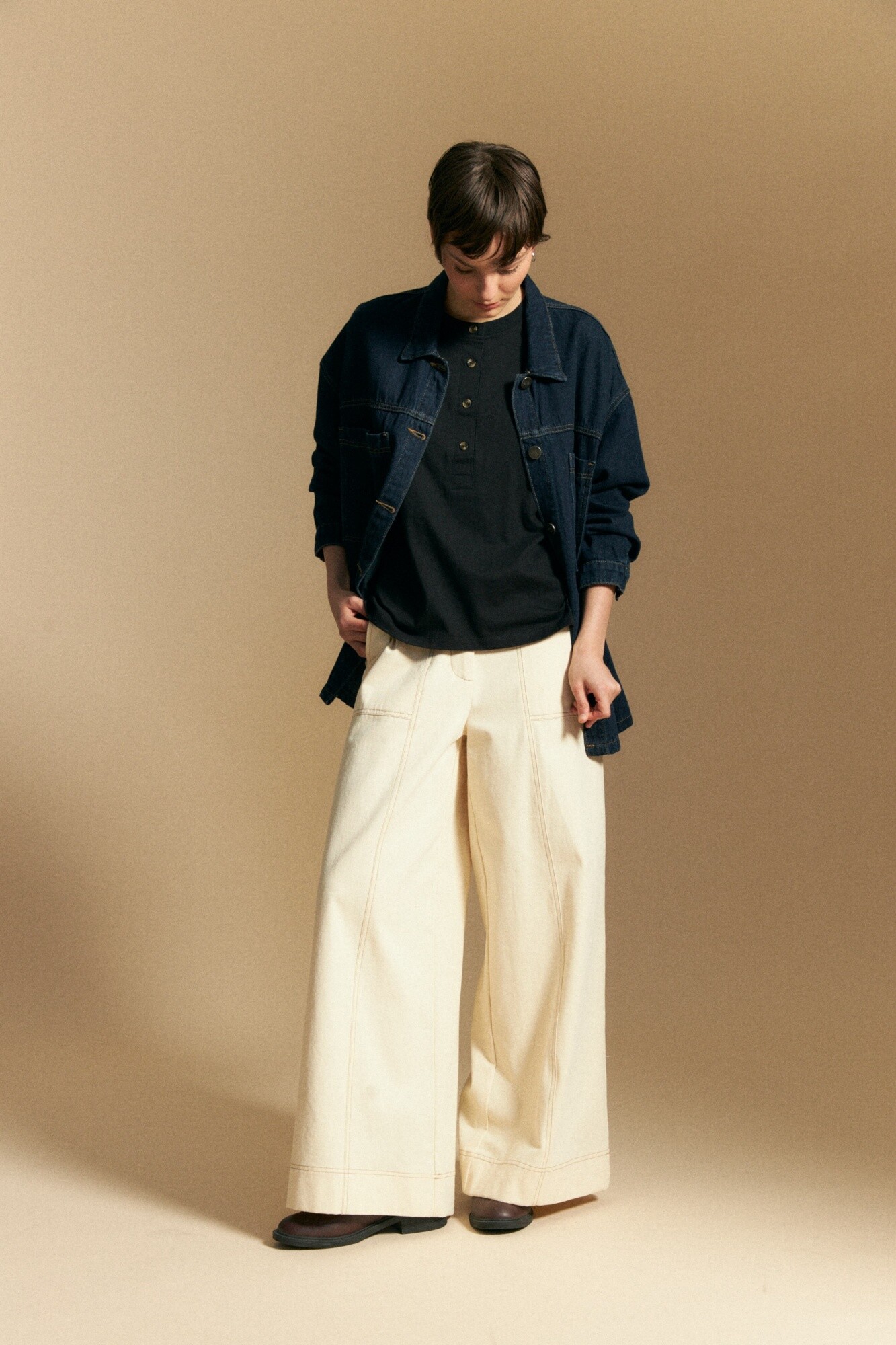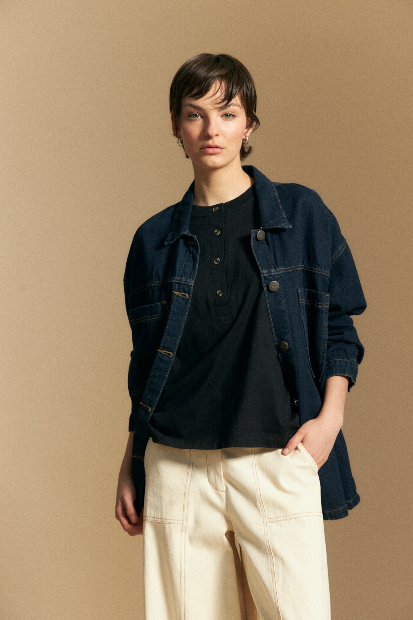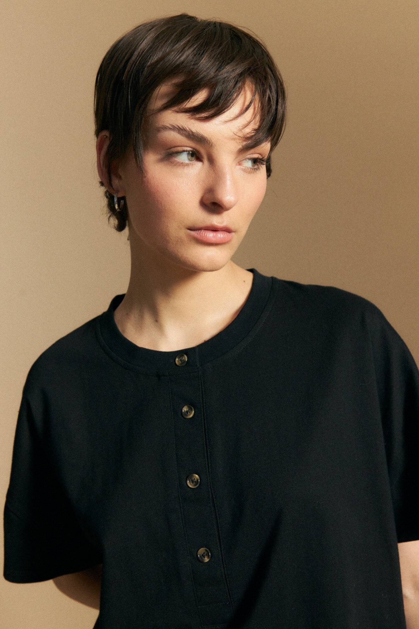 Remera de manga corta de líneas simples con detalle de botones en el frente que aporta un toque distintivo y versátil. Su calce relajado y tejido suave la convierten en una opción cómoda para el día a día, ideal para combinar en looks casuales o más pulidos según el styling.