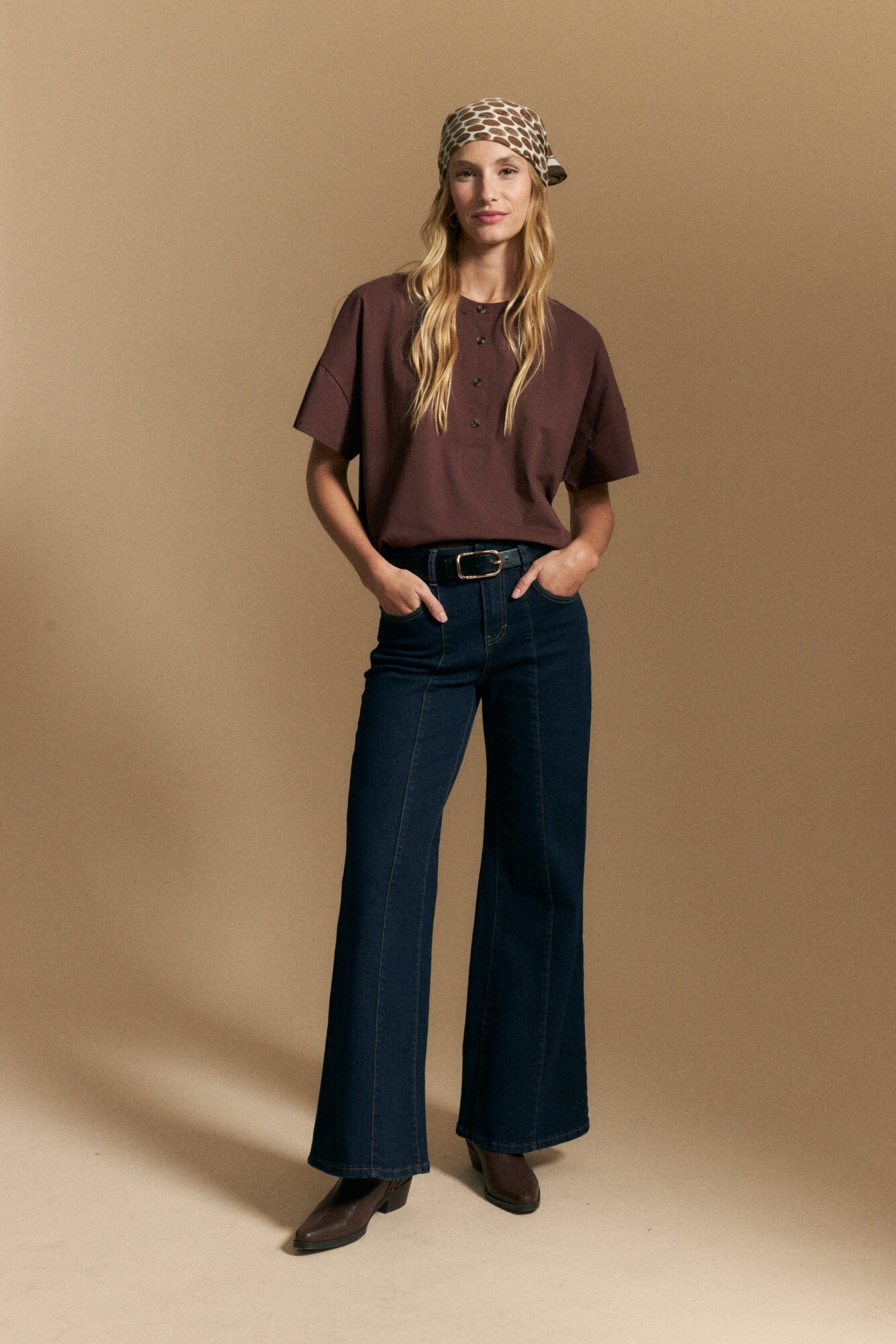 Remera de manga corta de líneas simples con detalle de botones en el frente que aporta un toque distintivo y versátil. Su calce relajado y tejido suave la convierten en una opción cómoda para el día a día, ideal para combinar en looks casuales o más pulidos según el styling.