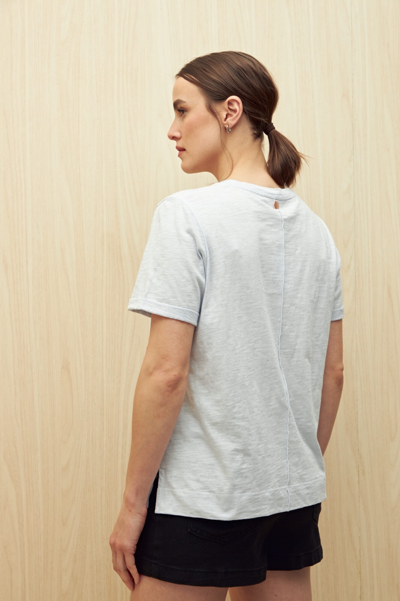 Remera de manga corta confeccionada en algodón liviano con textura sutil y terminaciones al ruedo con pequeños tajos laterales. Su diseño básico con cuello a la base la convierte en una aliada infalible para looks casuales y de diario.