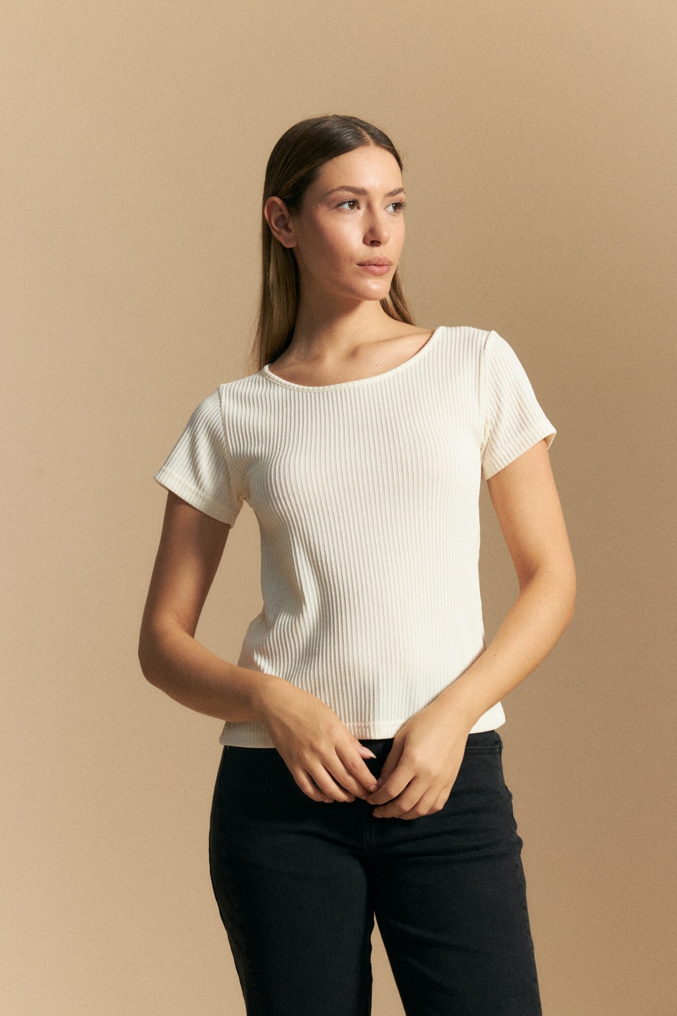 Remera de rib de manga corta y escote redondo, confeccionada en tejido acanalado que se adapta al cuerpo y aporta una silueta favorecedora. Su diseño simple y versátil la convierte en un básico infaltable para el día a día, ideal para combinar con jeans, sastrería o faldas según el estilo que se busque lograr.