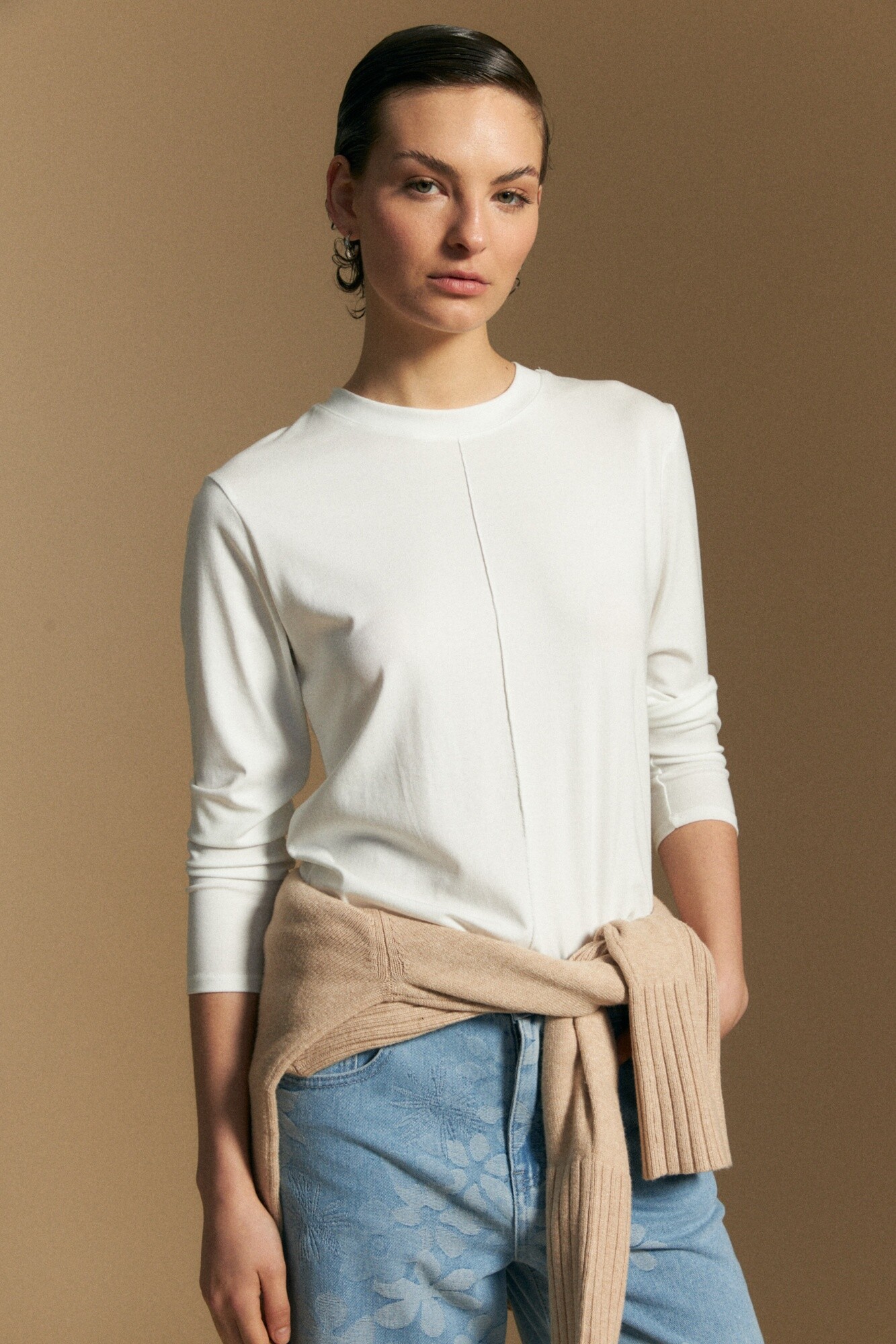 Remera de manga larga de silueta minimalista, pensada para convertirse en un básico infalible del guardarropa. Su diseño de cuello cerrado y líneas limpias estiliza la figura, logrando un efecto pulido y versátil.